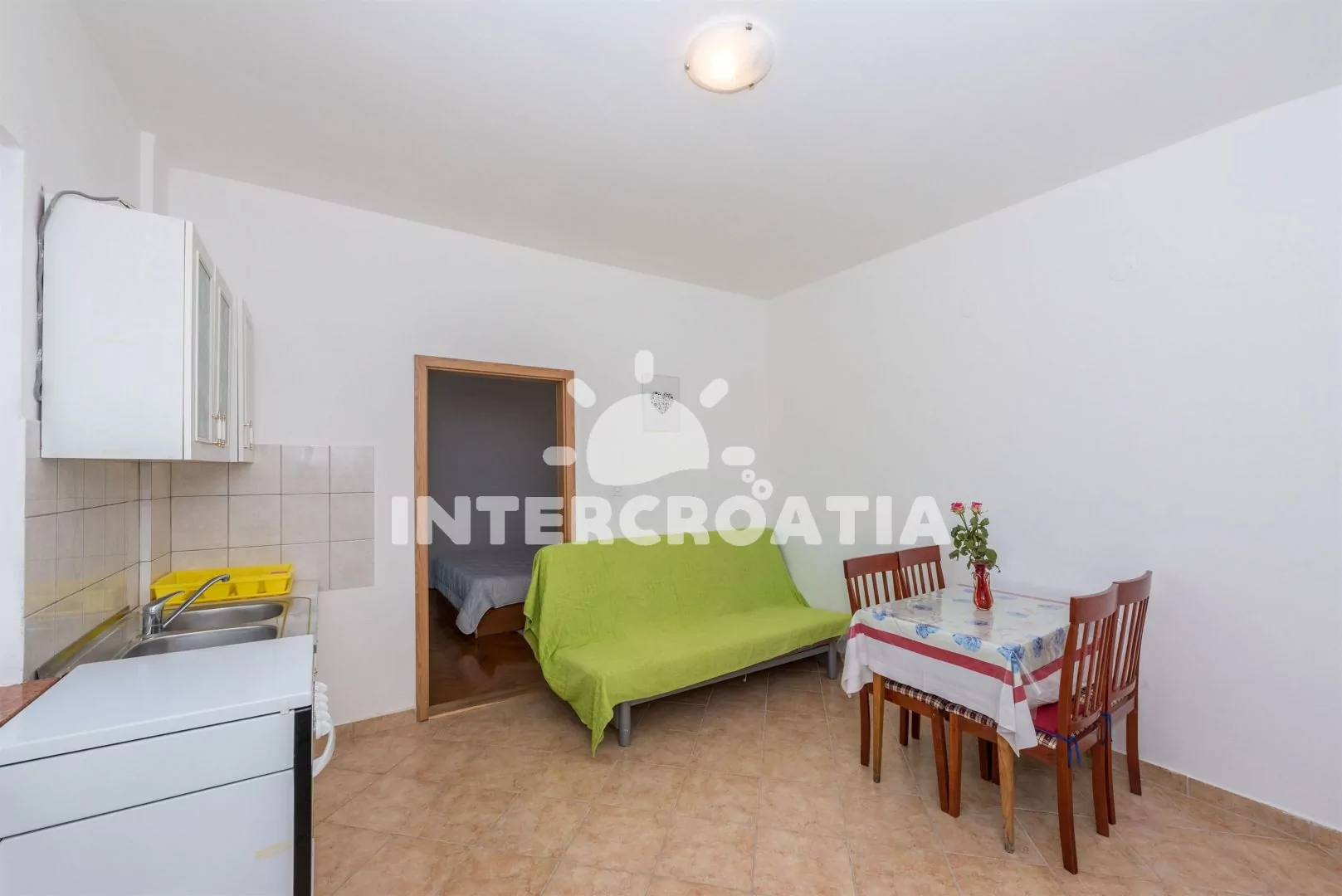 Dvoupokojový apartmán (30 m2) s částečným výhledem na moře se nachází v 1. patře domu a je vhodný pro 2 až 3 osoby. Obývací pokoj je spojený s kuchyní. Kuchyňská linka je vybavena sporákem s troubou,…