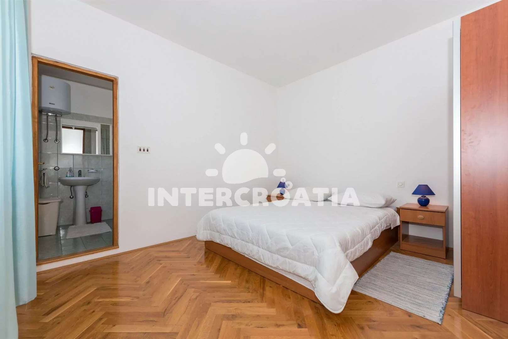 Dvoupokojový apartmán (30 m2) s částečným výhledem na moře se nachází v 1. patře domu a je vhodný pro 2 až 3 osoby. Obývací pokoj je spojený s kuchyní. Kuchyňská linka je vybavena sporákem s troubou, nádobím a lednicí s mrazákem. Obývací pokoj s jídelním stolem pro 4 osoby, pohovkou (rozložitelná na extra lůžko pro 1 osobu), televizí se satelitním programem a klimatizací. Ložnice s jedním dvoulůžkem. Koupelna se sprchovým koutem, umyvadlem, fénem, bidetem a wc. Hostům je k dispozici parkování u objektu zdarma.