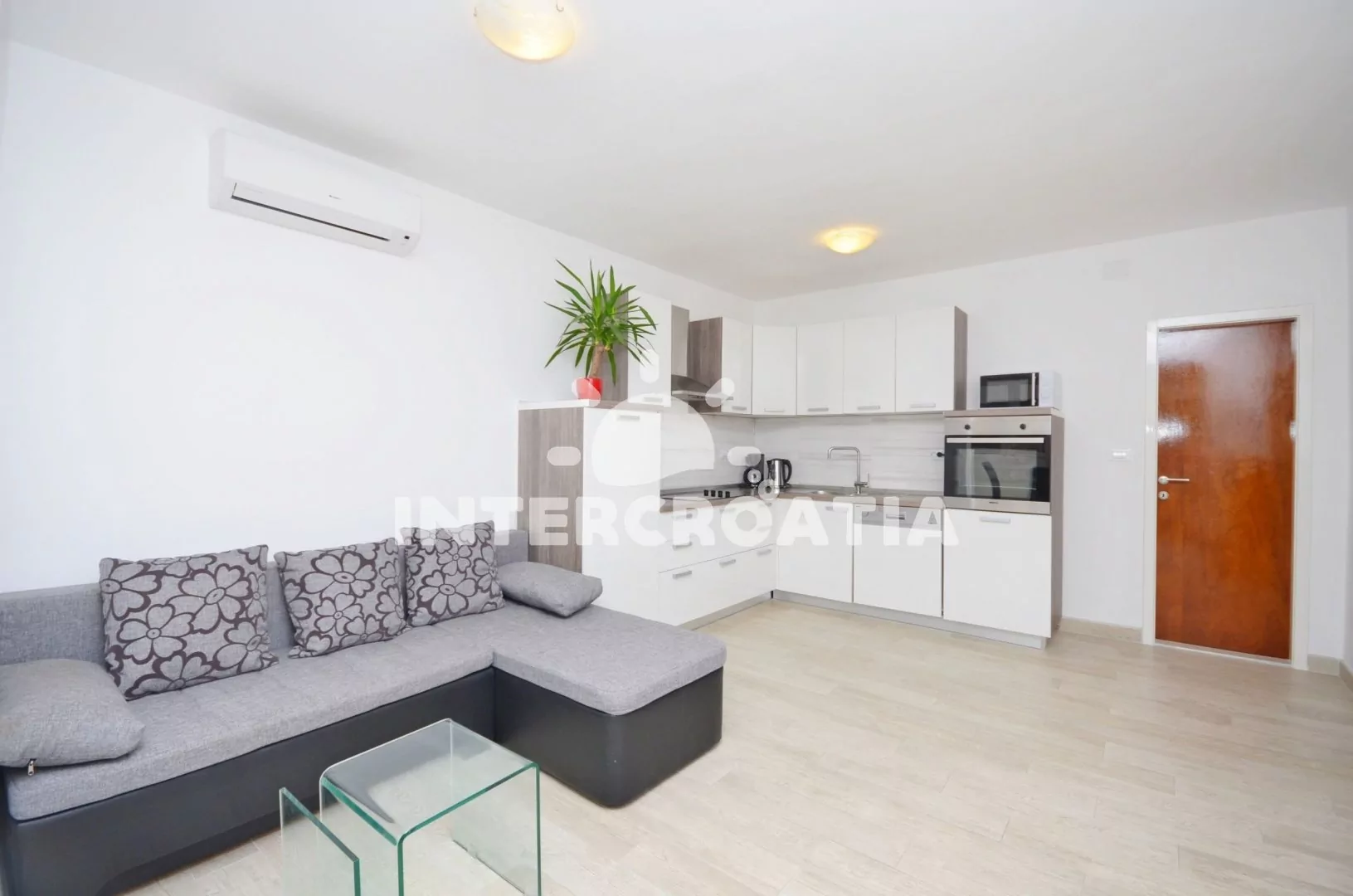 Komfortně zařízený slunný apartmán s terasou, nacházející se v přízemí. Vstup, obývací místnost spojená s kuchyní. Kuchyňská linka se sklokeramickou varnou deskou, troubou, mikrovlnnou troubou,…