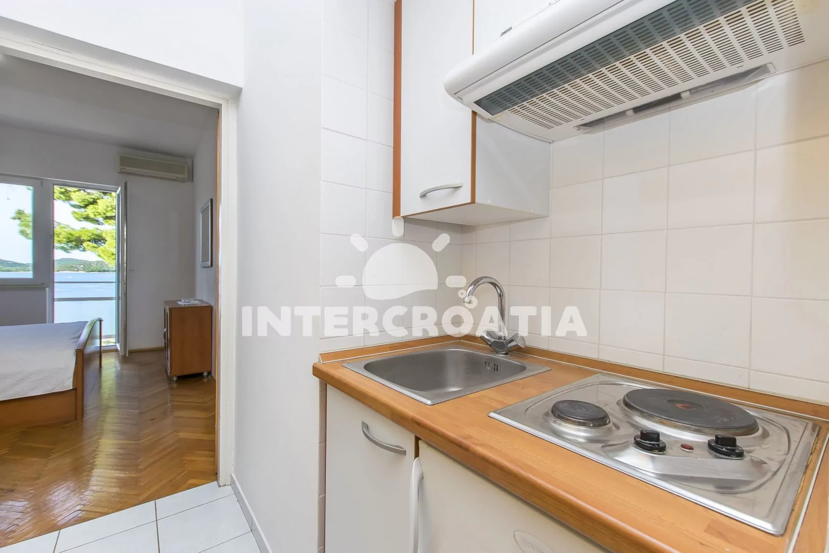 Apartmán (20 m2) typu studio s balkonem, posezením a výhledem na moře se nachází v 1. patře domu. Kuchyňská linka s dvouplotýnkovým vařičem, digestoří, rychlovarnou konvicí, nádobím a lednicí s…