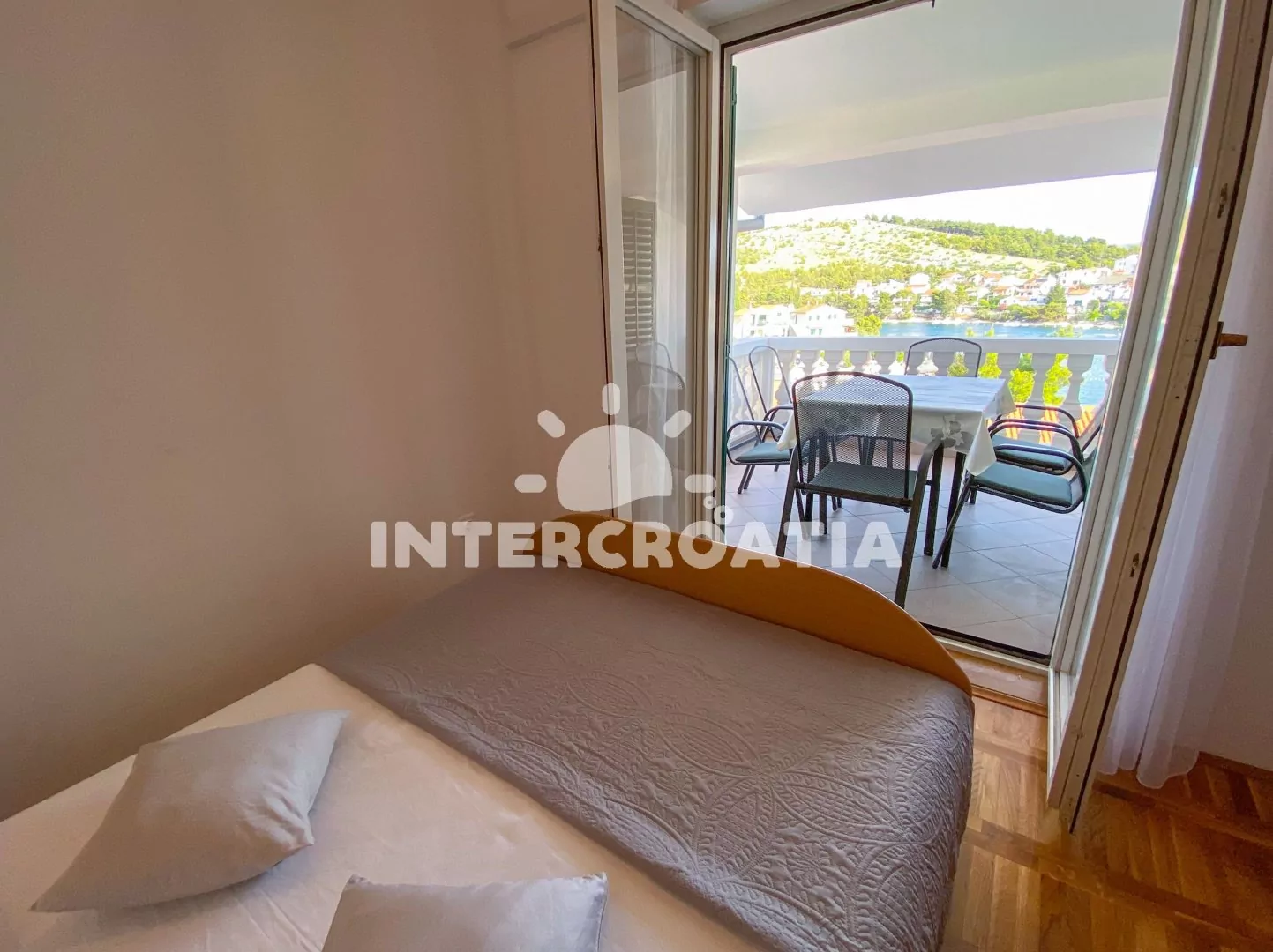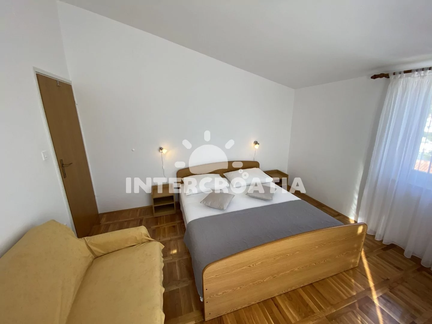 Apartmán (60 m2) s terasou a výhledem na moře se nachází ve 2. patře domu. Apartmán má 2 ložnice a je vhodný pro 4 až 6 osob. Obývací pokoj je spojený s kuchyní. Kuchyňská linka je vybavena dvouplotýnkovým vařičem, digestoří, mikrovlnnou troubou, rychlovarnou konvicí, kávovarem, nádobím a lednicí s mrazákem. Obývací pokoj s jídelním stolem pro 6 osob, pohovkou (rozložitelná na extra lůžko pro 2 osoby), televizí se satelitním programem, klimatizací a vstupem na terasu. První ložnice s dvoulůžkem. Druhá ložnice s dvoulůžkem a vstupem na terasu. Koupelna se sprchovým koutem, umyvadlem, bidetem a wc. Hostům je k dispozici parkování u objektu zdarma.