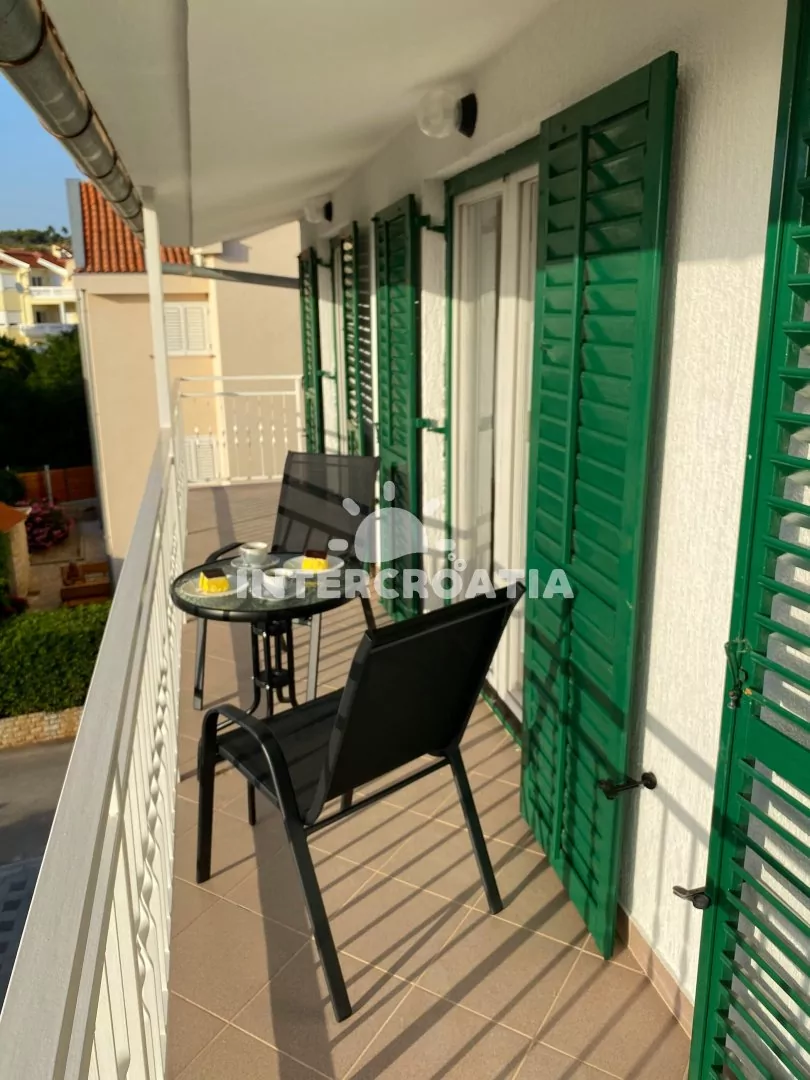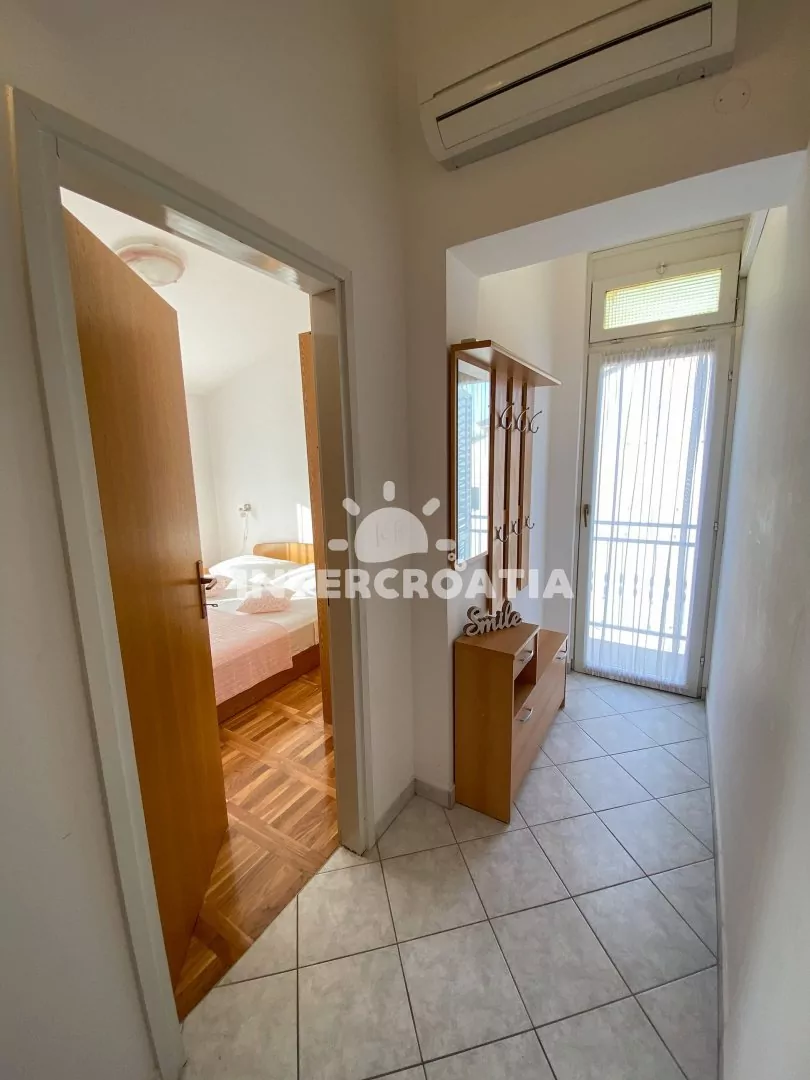Apartmán (50 m2) s balkonem, výhledem do dvora a klidné ulice se nachází ve 2. patře domu. Apartmán má 2 ložnice a je vhodný pro 4 až 5 osob. Obývací pokoj je spojený s kuchyní. Kuchyňská linka je vybavena dvouplotýnkovým vařičem, mikrovlnnou troubou, rychlovarnou konvicí, nádobím a lednicí s mrazákem, (kávovar na požádání). Obývací pokoj s jídelním stolem pro 4 osoby, pohovkou (rozložitelná na extra lůžko pro 1 osobu), televizí se satelitním programem, klimatizací a vstupem na balkon. První ložnice s dvoulůžkem a vstupem na balkon. Druhá ložnice s dvěma jednolůžky a vstupem na balkon. Koupelna se sprchovým koutem, umyvadlem a wc. Hostům je k dispozici parkování u objektu zdarma.