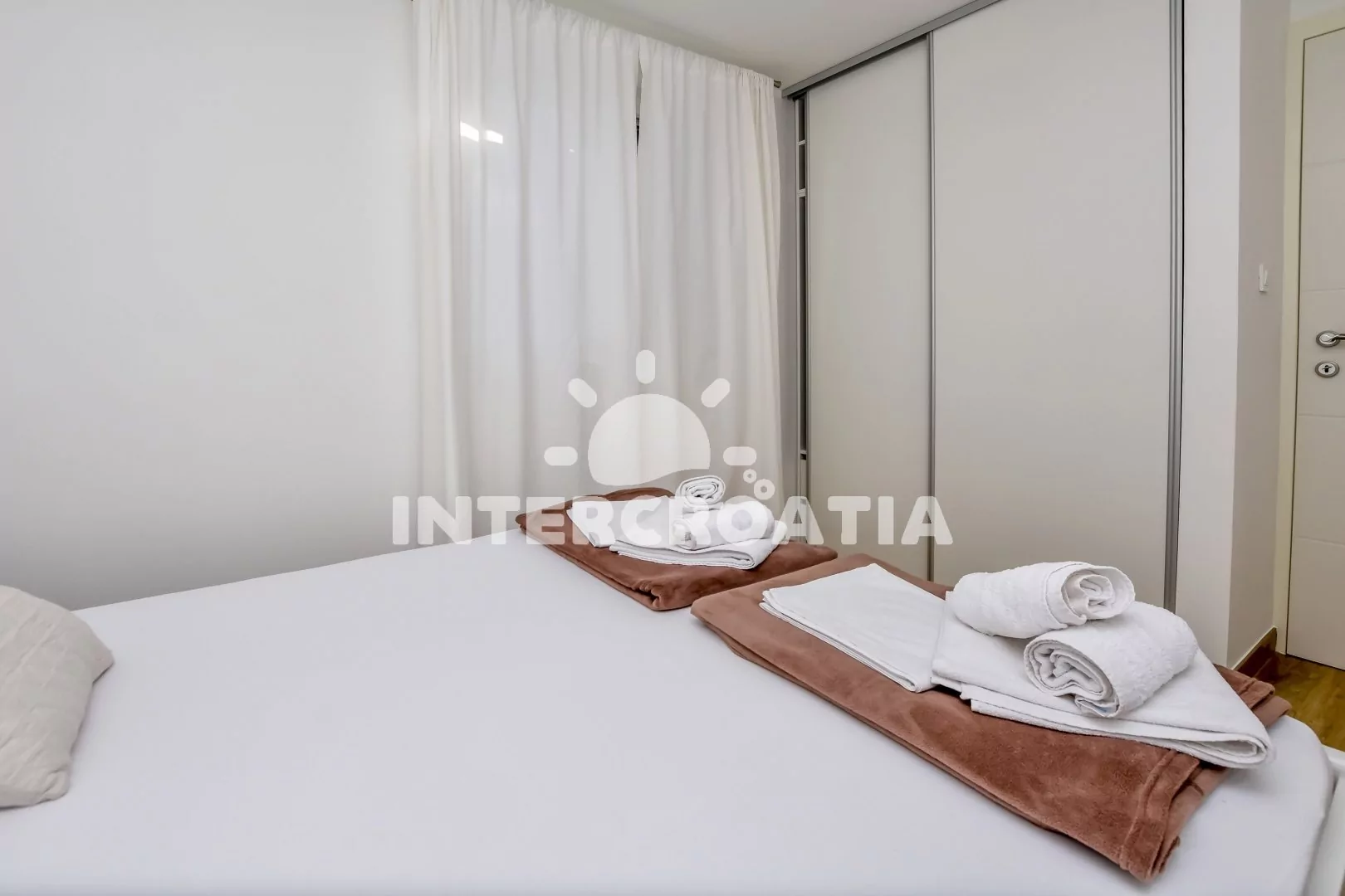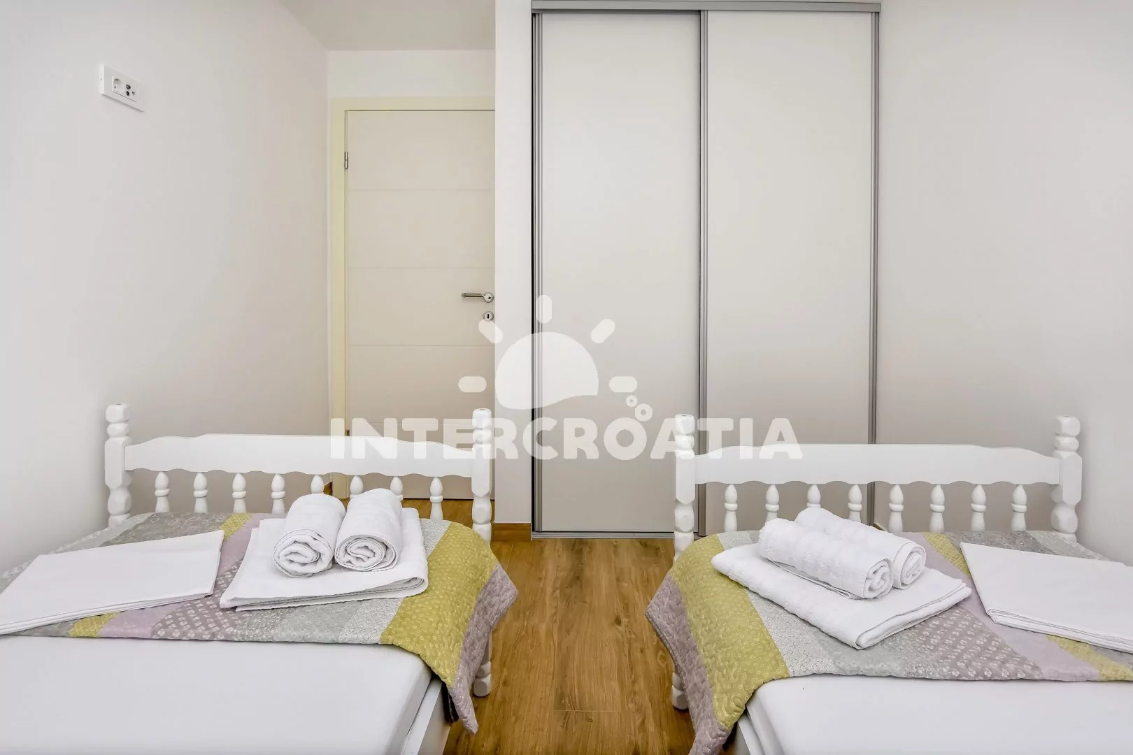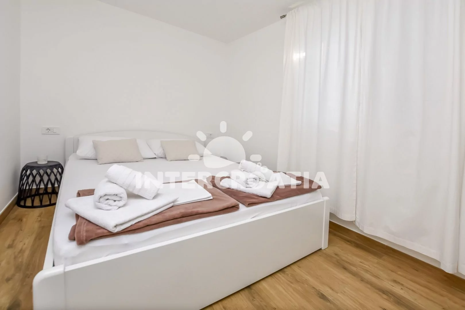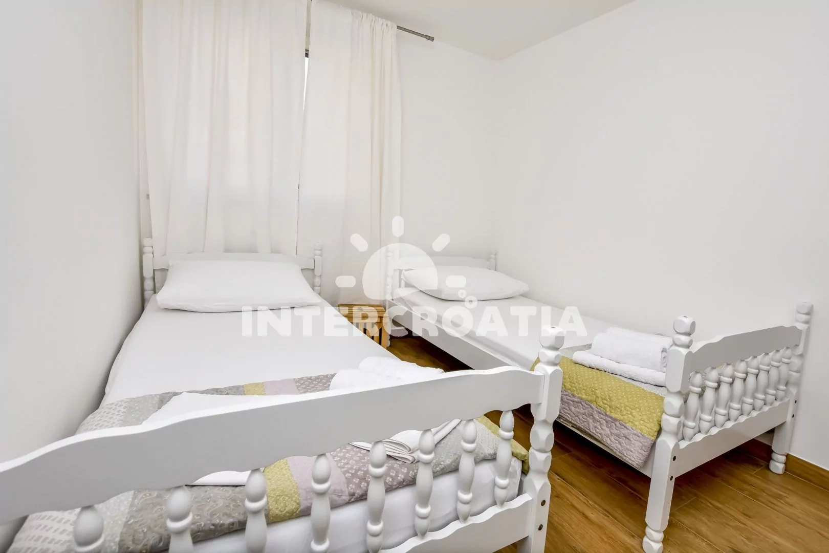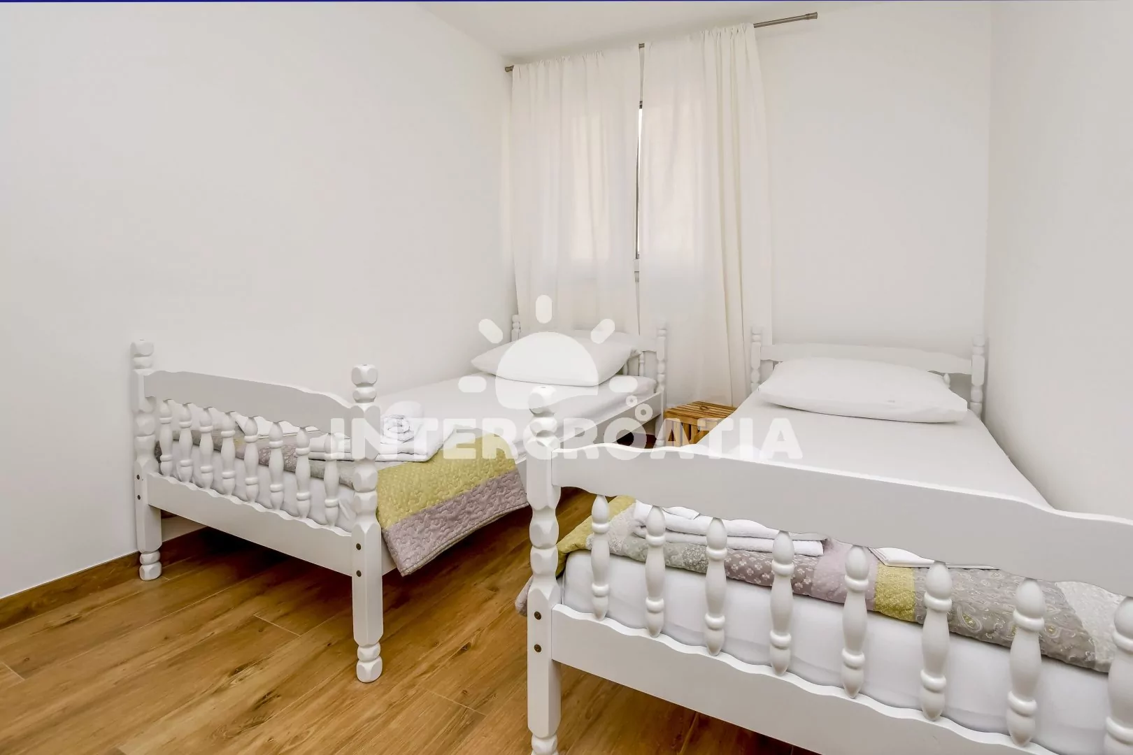 Apartmán (60 m2) s terasou a výhledem na moře se nachází v 1. patře domu. Apartmán má 2 ložnice a je vhodný pro 4 osoby. Obývací pokoj je spojený s kuchyní. Kuchyňská linka je vybavena sklokeramickou varnou deskou, digestoří, mikrovlnnou troubou, myčkou na nádobí, rychlovarnou konvicí, kávovarem, toustovačem, nádobím a lednicí s mrazákem. Obývací pokoj s jídelním stolem pro 4 osoby, pohovkou, televizí se satelitním programem, klimatizací a vstupem na terasu. První ložnice s dvoulůžkem. Druhá ložnice s dvěma jednolůžky. Koupelna se sprchovým koutem, umyvadlem, fénem, pračkou a wc. Hostům je k dispozici parkování u objektu zdarma.