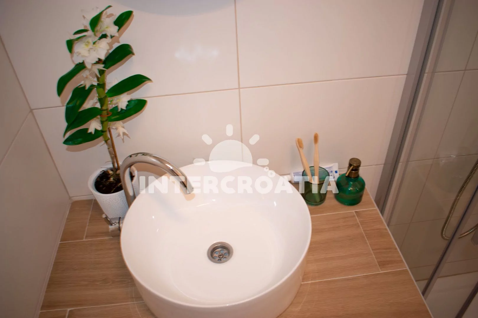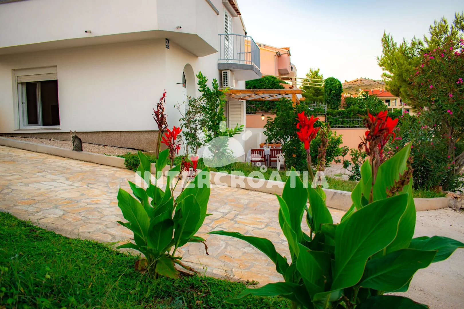 Vzdálenosti: Moře 10 m, pláž (betonové desky, oblázková) 10 m, pláž (oblázkovo-písčitá) 90 m, centrum 300 m, market 300 m, veřejná doprava a bar 200 m, restaurace 400 m, lékárna, ambulance, směnárna, banka a pošta 2 km, čerpací stanice 8 km, půjčovna motorových člunů 500 m, trajekt (Šibenik) 8 km, letiště (Split) 50 km.