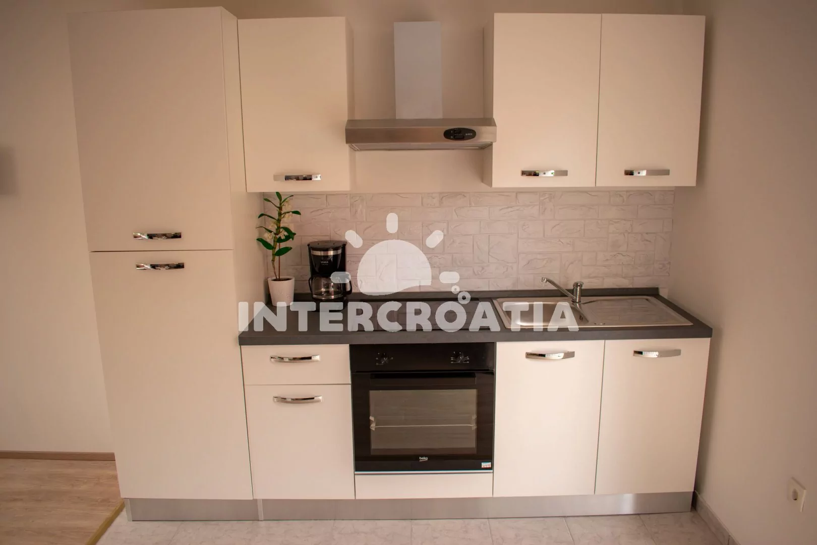 Apartmán (45 m2) s terasou, posezením a výhledem na moře se nachází v přízemí domu. Apartmán má 1 ložnici a je vhodný pro 2 až 4 osoby. Obývací pokoj je spojený s kuchyní. Kuchyňská linka je vybavena sklokeramickou varnou deskou, digestoří, vestavěnou troubou, mikrovlnnou troubou, rychlovarnou konvicí, kávovarem, toustovačem, nádobím a lednicí s mrazákem. Obývací pokoj s jídelním stolem, pohovkou (rozložitelná na extra lůžko pro 2 osoby), televizí, klimatizací a vstupem na terasu. Ložnice s jedním dvoulůžkem. Koupelna se sprchovým koutem, umyvadlem, fénem a wc. Hostům je k dispozici parkování u objektu zdarma.