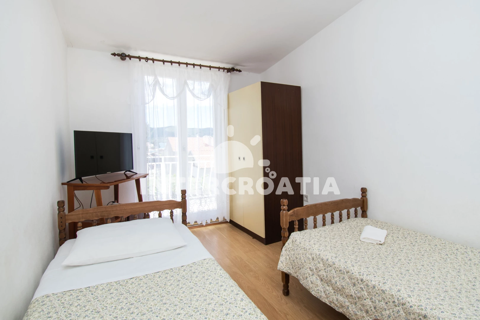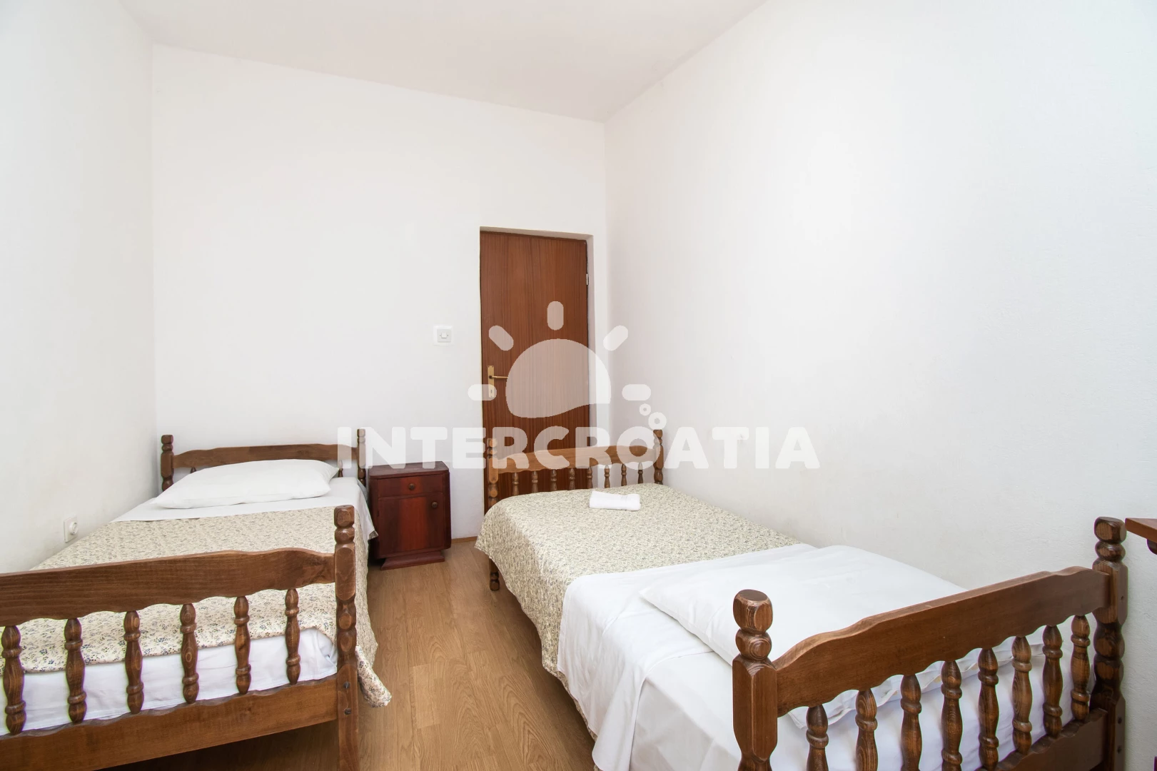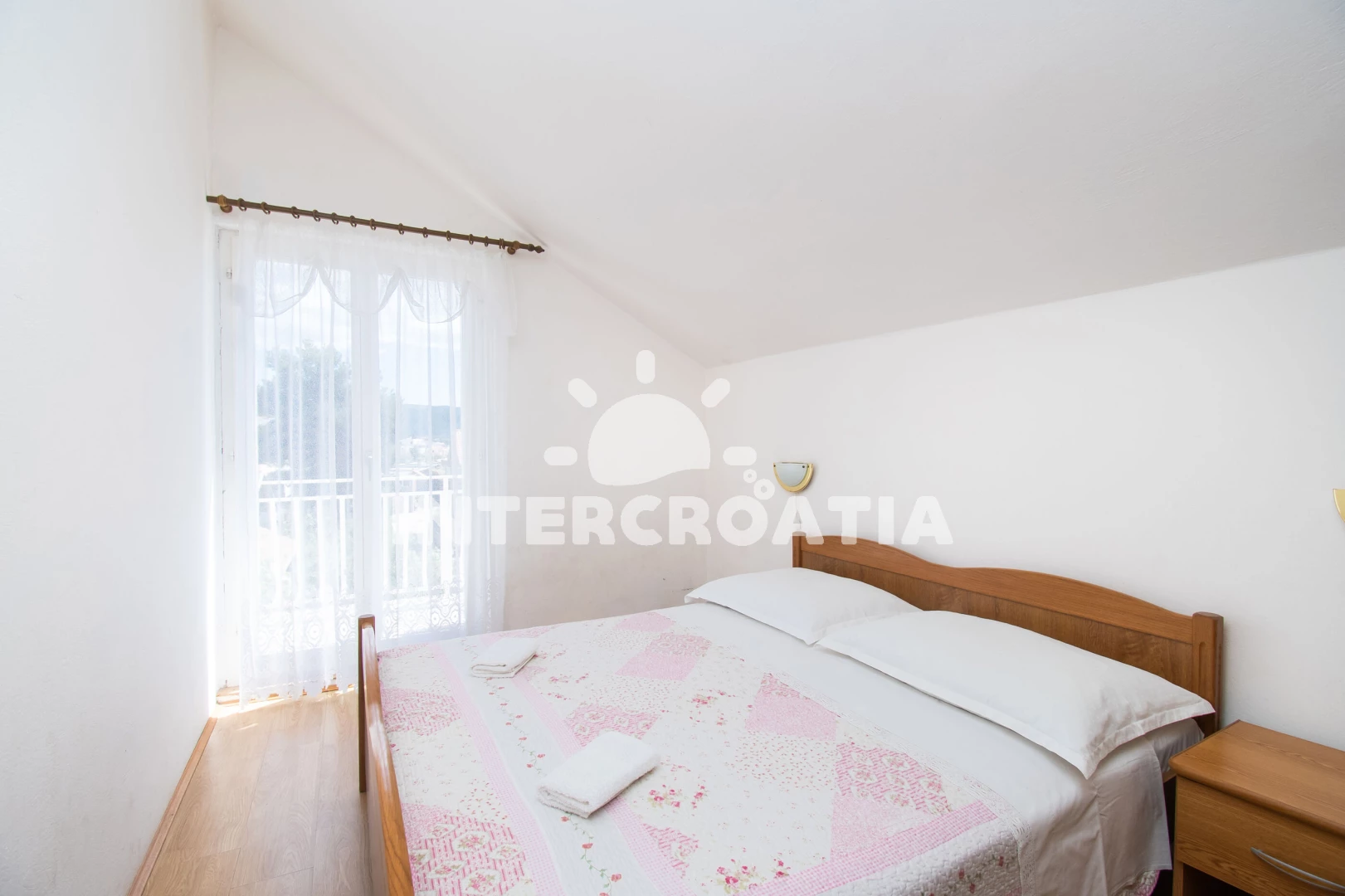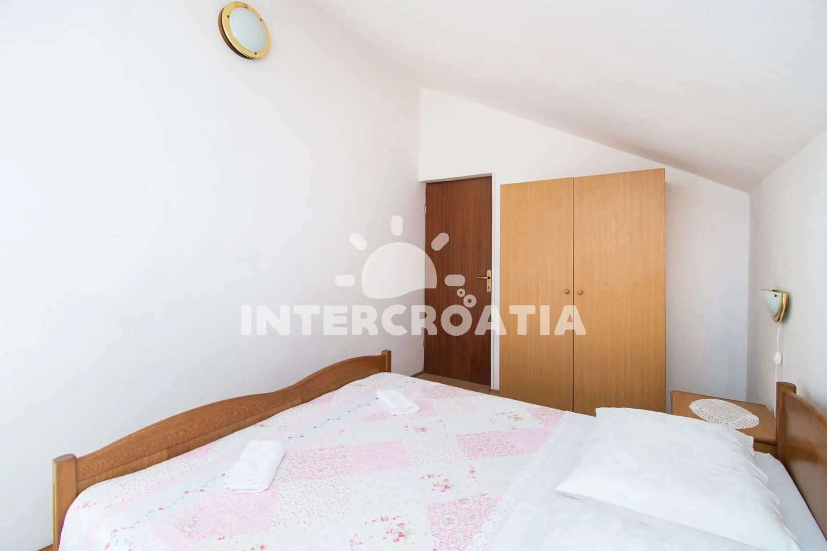 Apartmán (65 m2) s balkonem, posezením a částečným výhledem na moře se nachází ve 2. patře domu. Apartmán má 3 ložnice, 2 koupelny a je vhodný pro 6 až 7 osob. Kuchyň s jídelním stolem, přistýlkou pro 1 osobu a kuchyňskou linkou. Kuchyňská linka je vybavena sporákem s troubou, rychlovarnou konvicí, mikrovlnnou troubou, toustovačem, nádobím a lednicí s mrazákem. První ložnice s dvoulůžkem, televizí, klimatizací a vstupem na balkon. Druhá ložnice s dvoulůžkem a vstupem na balkon. Třetí ložnice s dvěma jednolůžky a vstupem na balkon. Koupelna se sprchovým koutem, umyvadlem, fénem a wc. Hostům je k dispozici parkování u objektu zdarma.