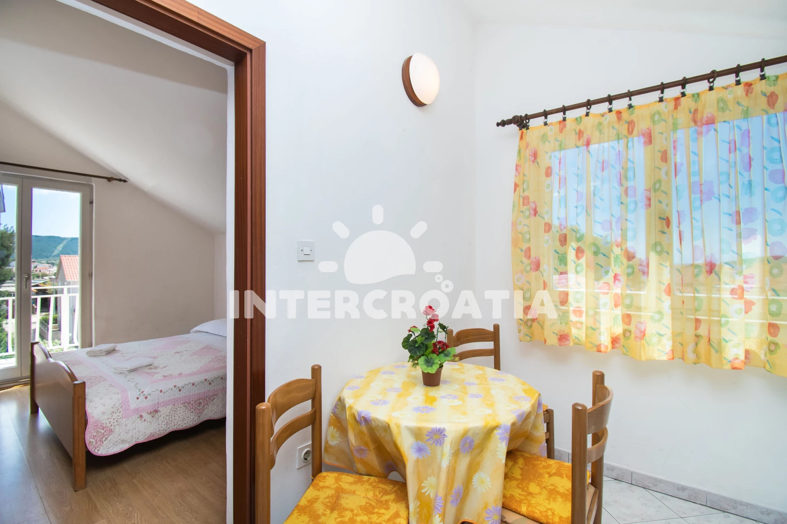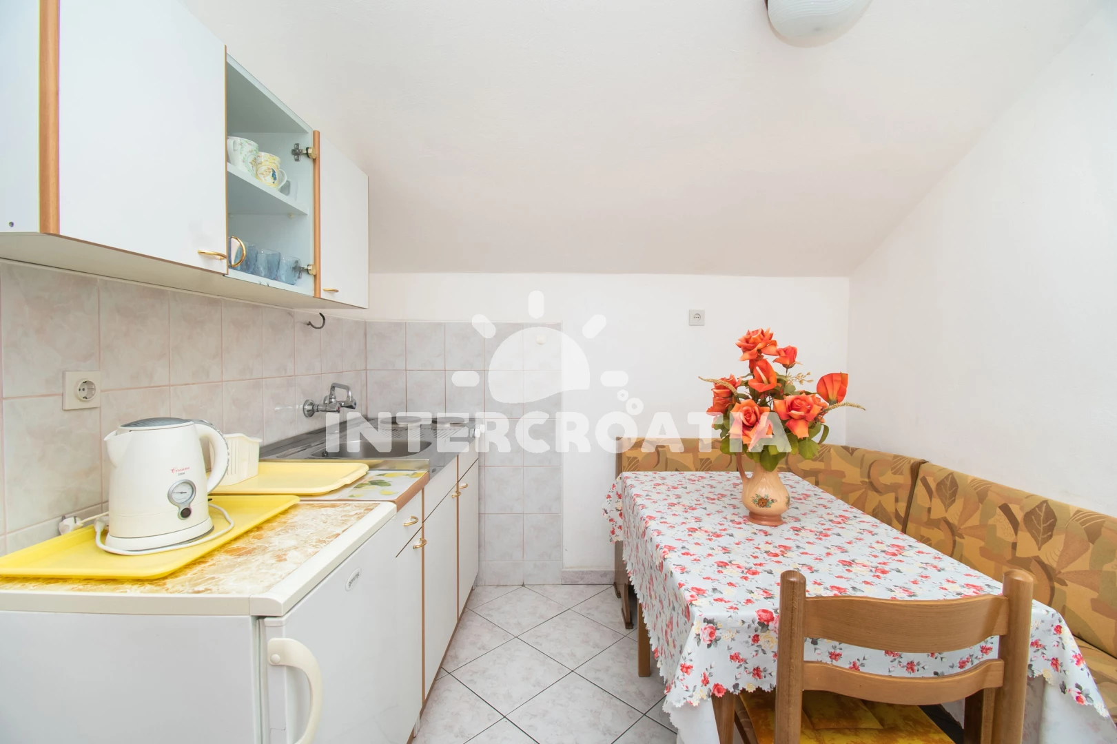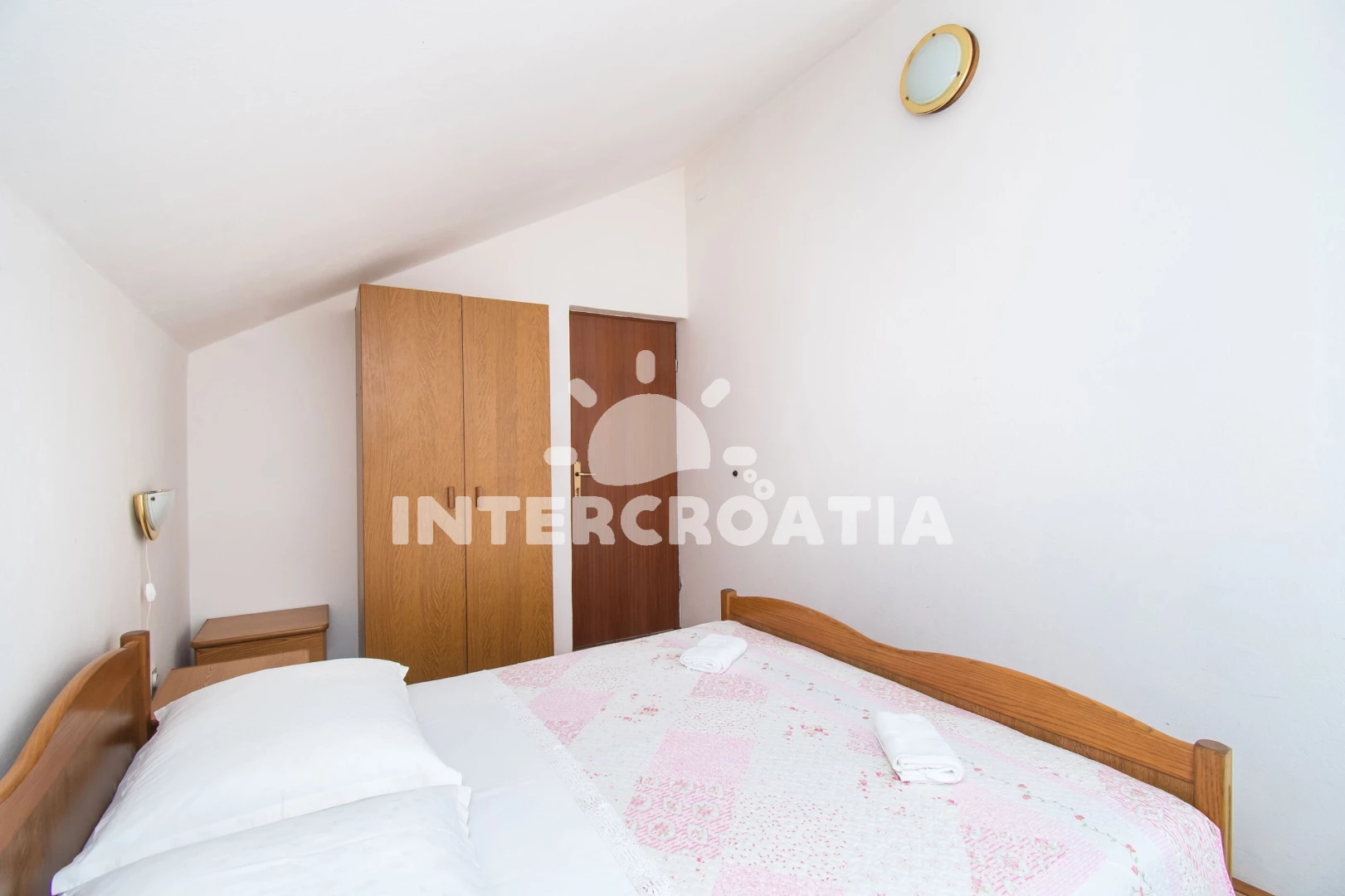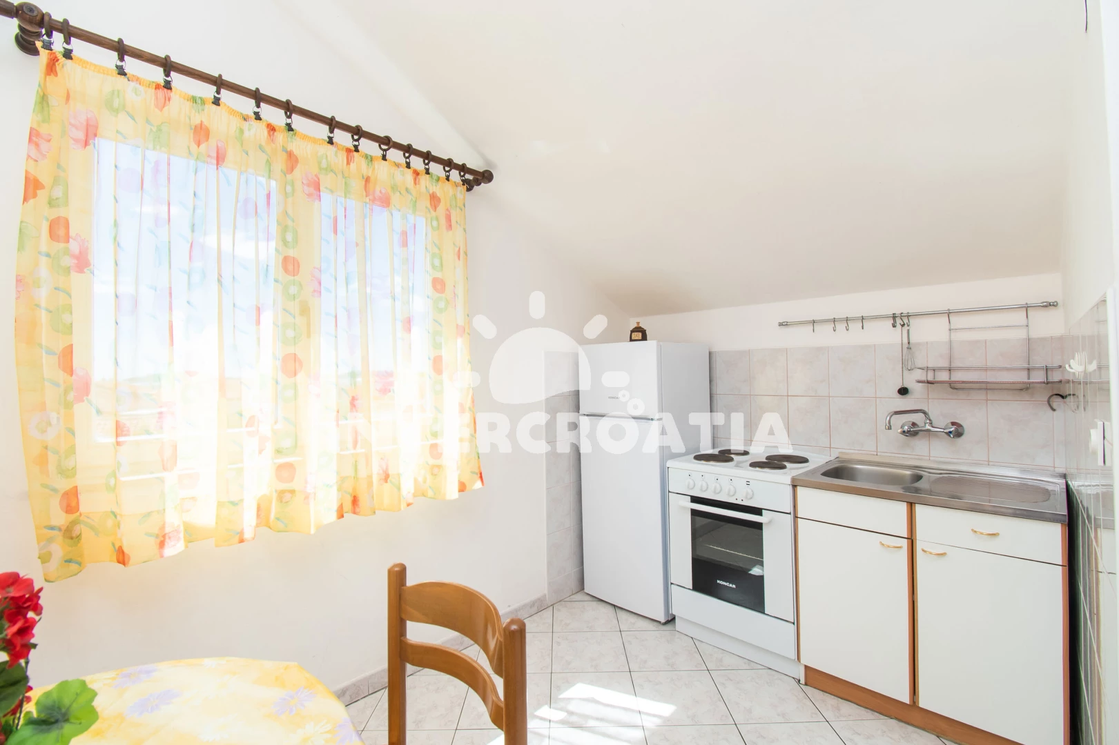 Apartmán (65 m2) s balkonem, posezením a částečným výhledem na moře se nachází ve 2. patře domu. Apartmán má 3 ložnice, 2 koupelny a je vhodný pro 6 až 7 osob. Kuchyň s jídelním stolem, přistýlkou pro 1 osobu a kuchyňskou linkou. Kuchyňská linka je vybavena sporákem s troubou, rychlovarnou konvicí, mikrovlnnou troubou, toustovačem, nádobím a lednicí s mrazákem. První ložnice s dvoulůžkem, televizí, klimatizací a vstupem na balkon. Druhá ložnice s dvoulůžkem a vstupem na balkon. Třetí ložnice s dvěma jednolůžky a vstupem na balkon. Koupelna se sprchovým koutem, umyvadlem, fénem a wc. Hostům je k dispozici parkování u objektu zdarma.