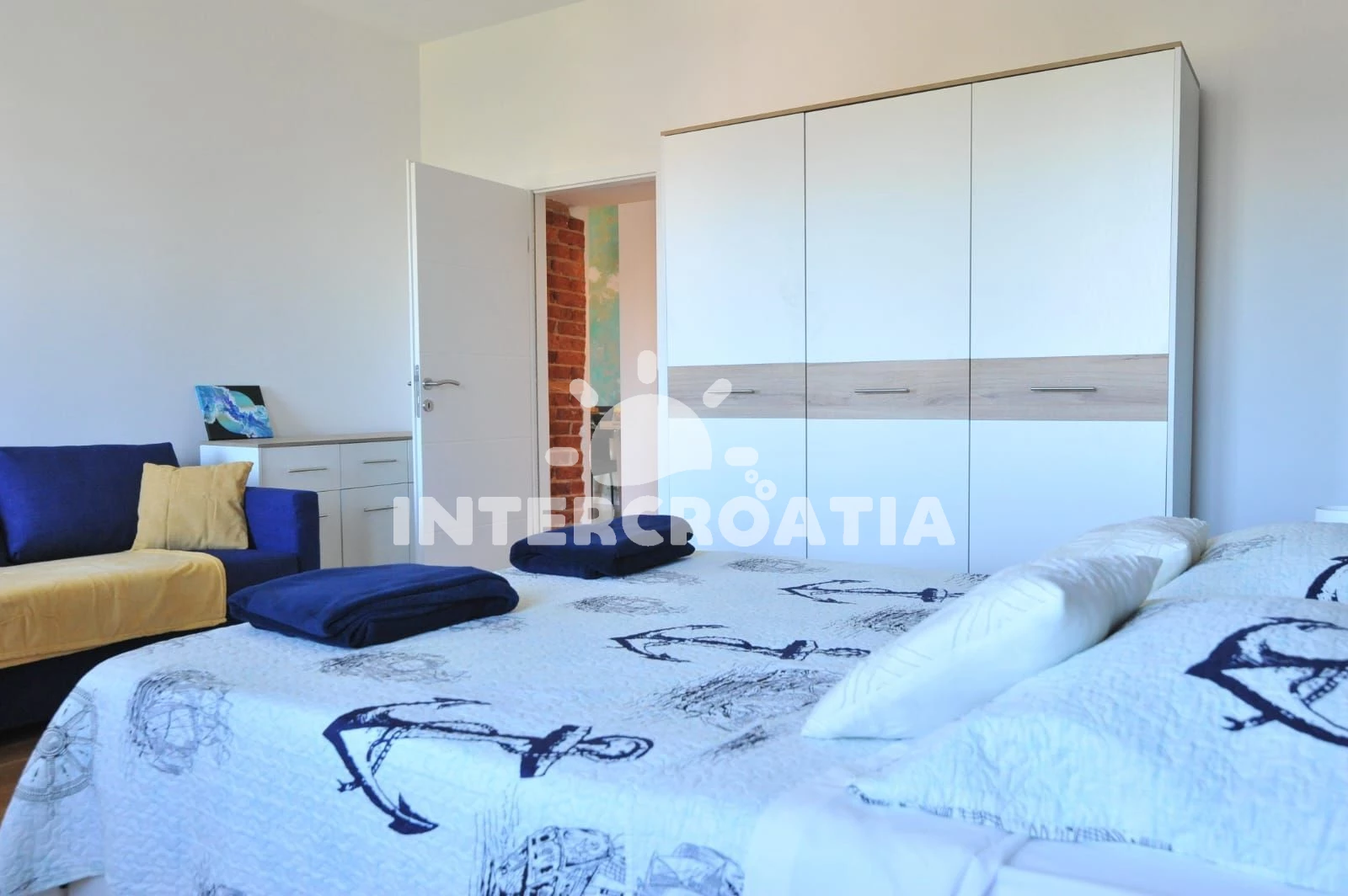 Apartmán (62 m2) s výhledem na moře. Nachází se ve 2. patře objektu. Apartmán má 1 ložnici a je vhodný pro až 4 osoby. Kuchyňská linka je vybavena varnou deskou, troubou, toustovačem, mikrovlnnou troubou, rychlovarnou konvicí, nádobím, lednicí, mrazákem. V obývací místnosti je rozložitelná pohovka (extra lůžko pro 2 osoby). K dispozici televize, žehlička. Ložnice s dvoulůžkem. Koupelna se sprchovým koutem, umyvadlem, fénem a WC.