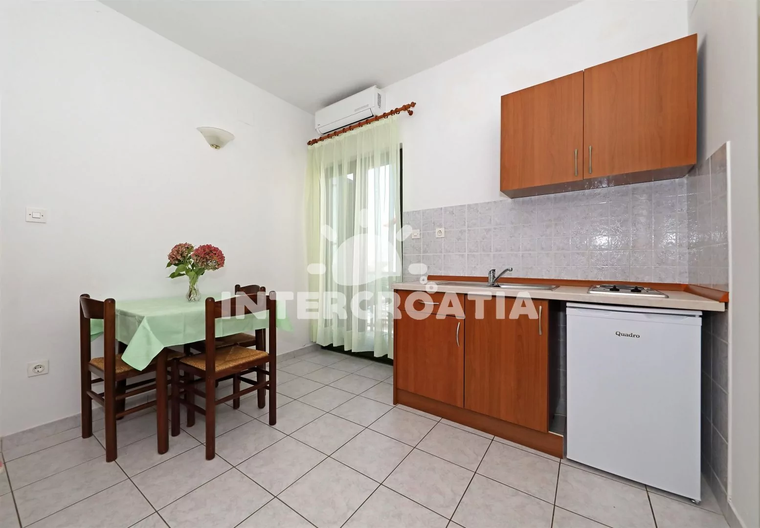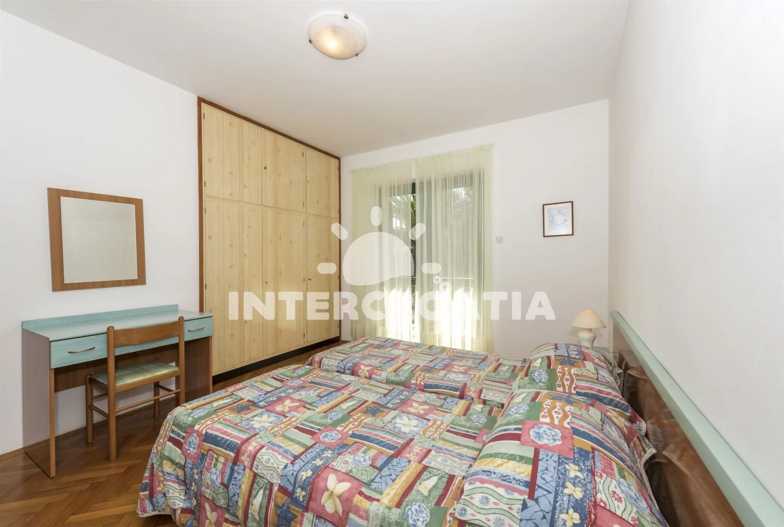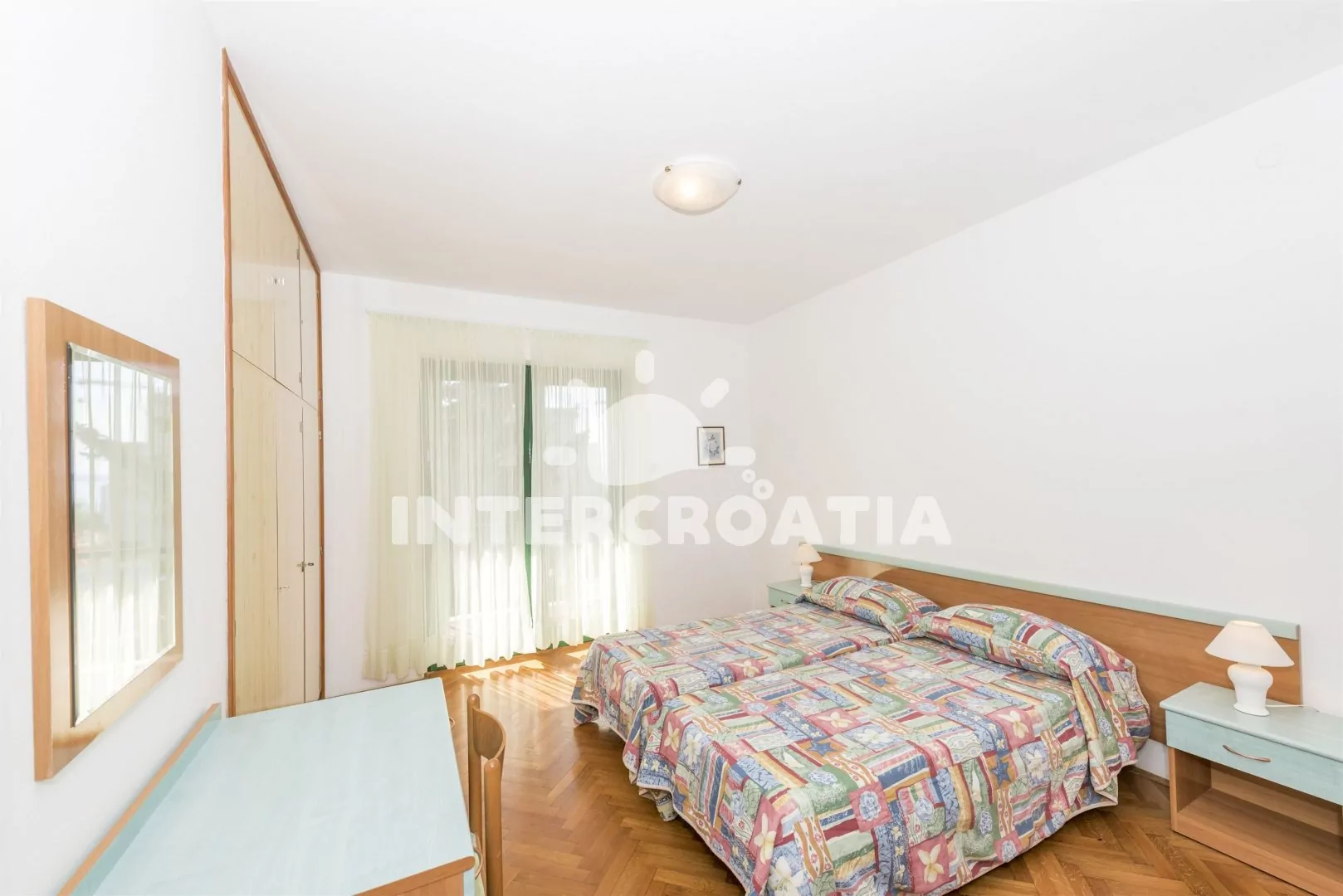Dvoupokojový apartmán s výhledem na moře, nacházející se v 1. patře domu. Vstup, obývací místnost spojená s kuchyní. Kuchyňská linka s dvouplotýnkovým elektrickým vařičem, rychlovarnou konvicí, kávovarem, nádobím a lednicí s mrazákem. Obývací místnost s jídelním stolem pro 3 osoby, pohovkou, televizí se satelitním programem, radiem a klimatizací. Ložnice je vybavena jedním dvoulůžkem. Koupelna se sprchovým koutem, umyvadlem a wc. Hostům je k dispozici balkon s posezením a parkování u objektu zdarma.