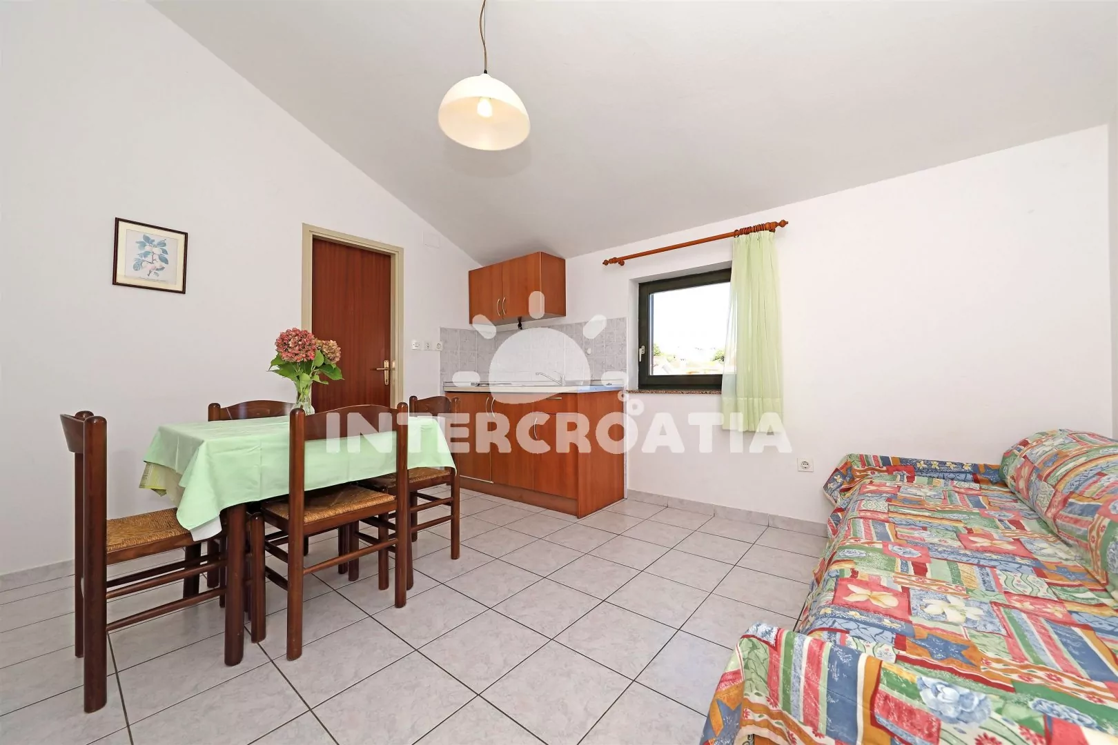 Prostorný a světlý apartmán se dvěma místnostmi, nacházející se v 2. patře domu. Vstup, obývací místnost spojená s kuchyní. Kuchyňská linka s dvouplotýnkovým elektrickým vařičem, rychlovarnou konvicí, kávovarem, nádobím a lednicí s mrazákem. Obývací místnost s jídelním stolem pro 4 osoby, rozkládací pohovkou (extra lůžko pro 1 osobu), televizí se satelitním programem, radiem a klimatizací. Ložnice s jedním dvoulůžkem a vstupem na balkon. Koupelna se sprchovým koutem, umyvadlem a wc. Hostům je k dispozici balkon s posezením a parkování u objektu zdarma.