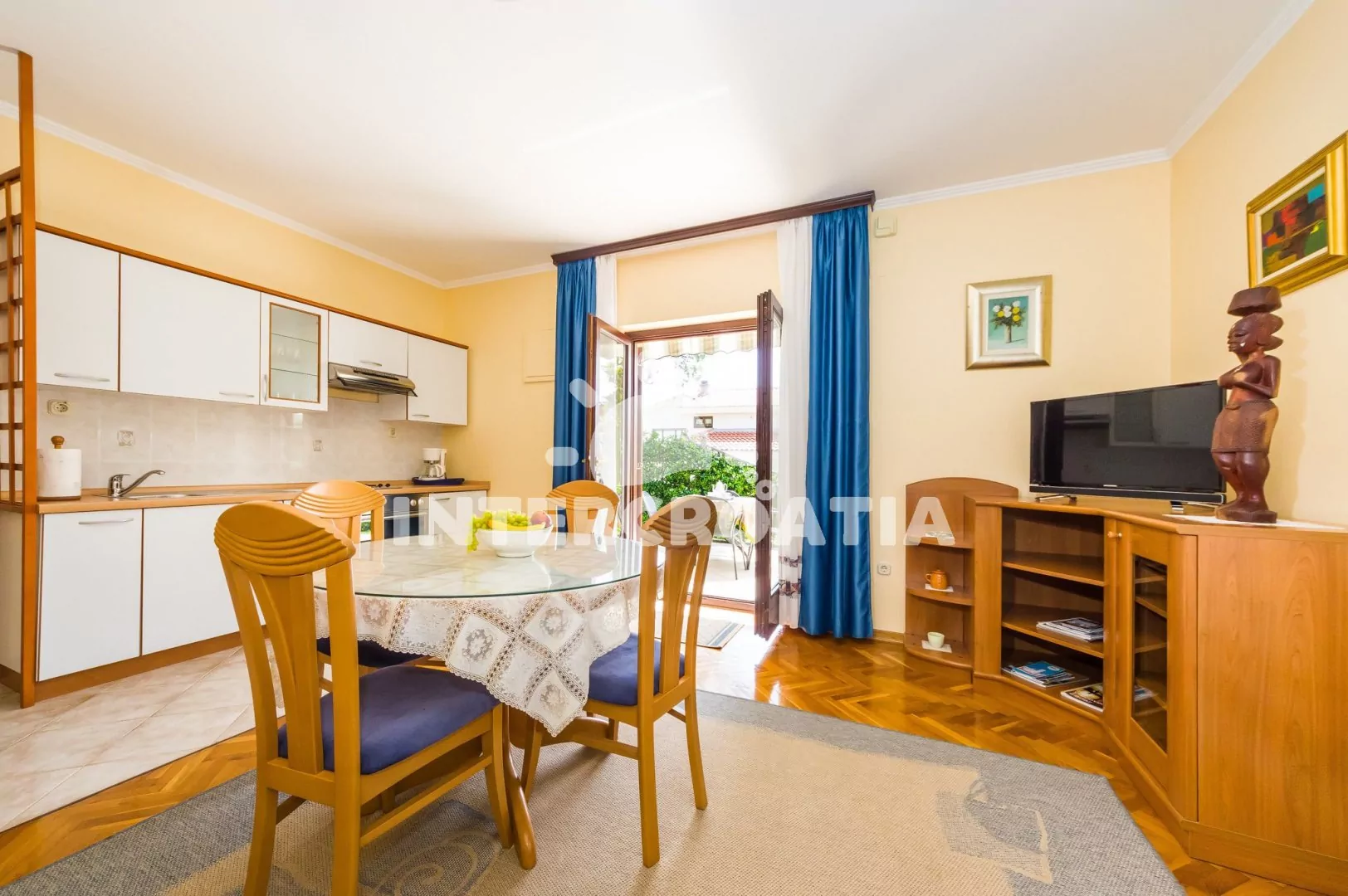 Komfortně zařízený apartmán s vlastní terasou a posezením, nachází se v přízemí vily. Z apartmánu výhled do zahrady. Obývací pokoj je spojený s kuchyní. Kuchyňská linka je vybavena varnou deskou, digestoří, vestavěnou troubou, kávovarem, nádobím a lednicí s mrazákem. Obývací pokoj s jídelním stolem pro 4 osoby, pohovkou (rozložitelná na extra lůžko pro 2 osoby), televizí se satelitním programem, klimatizací a vstupem na terasu. Ložnic je vybavena jedním dvoulůžkem. Koupelna s vanou, sprchovou zástěnou, umyvadlem, fénem a wc. Hostům je k dispozici parkování u objektu, nebo v garáži zdarma.