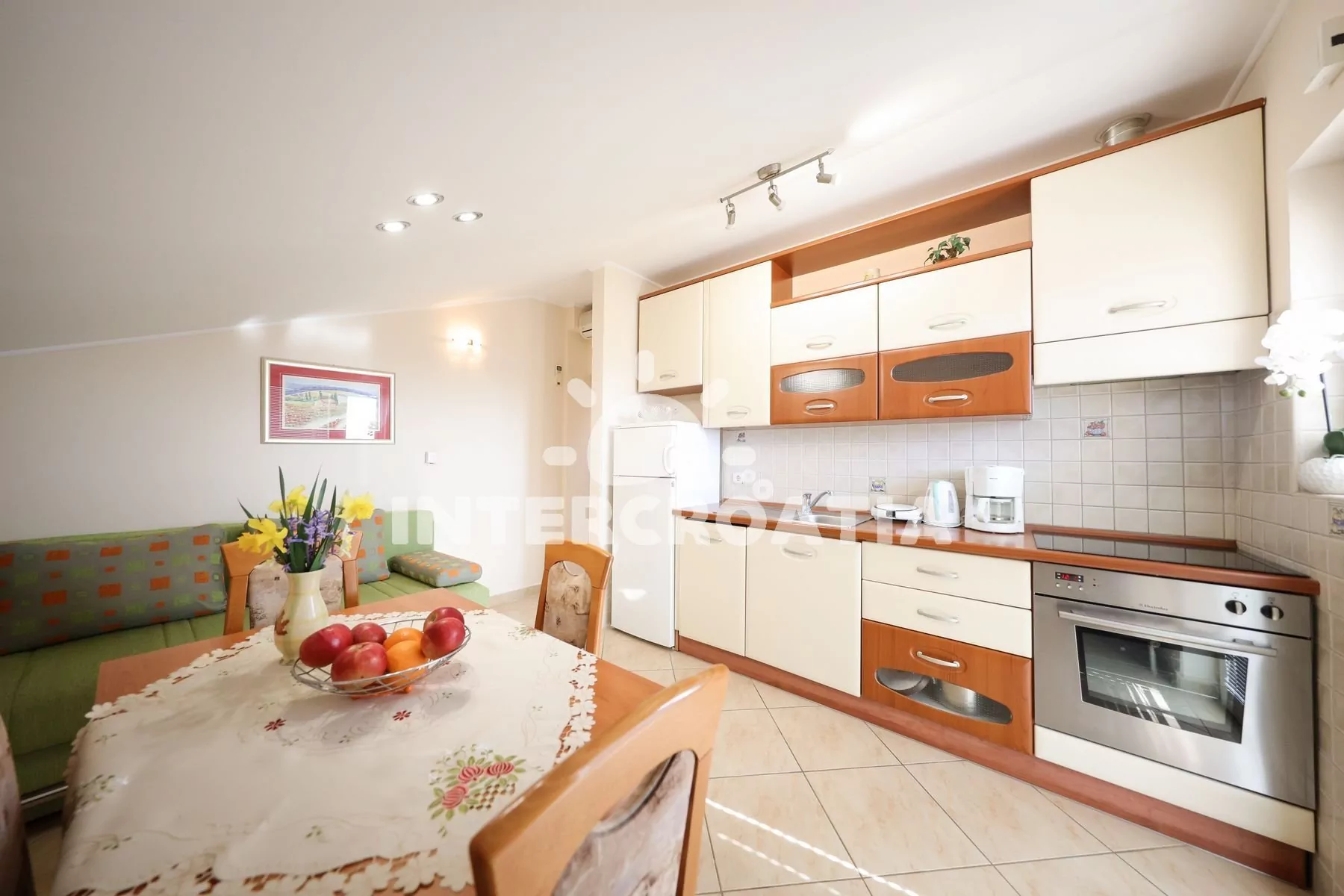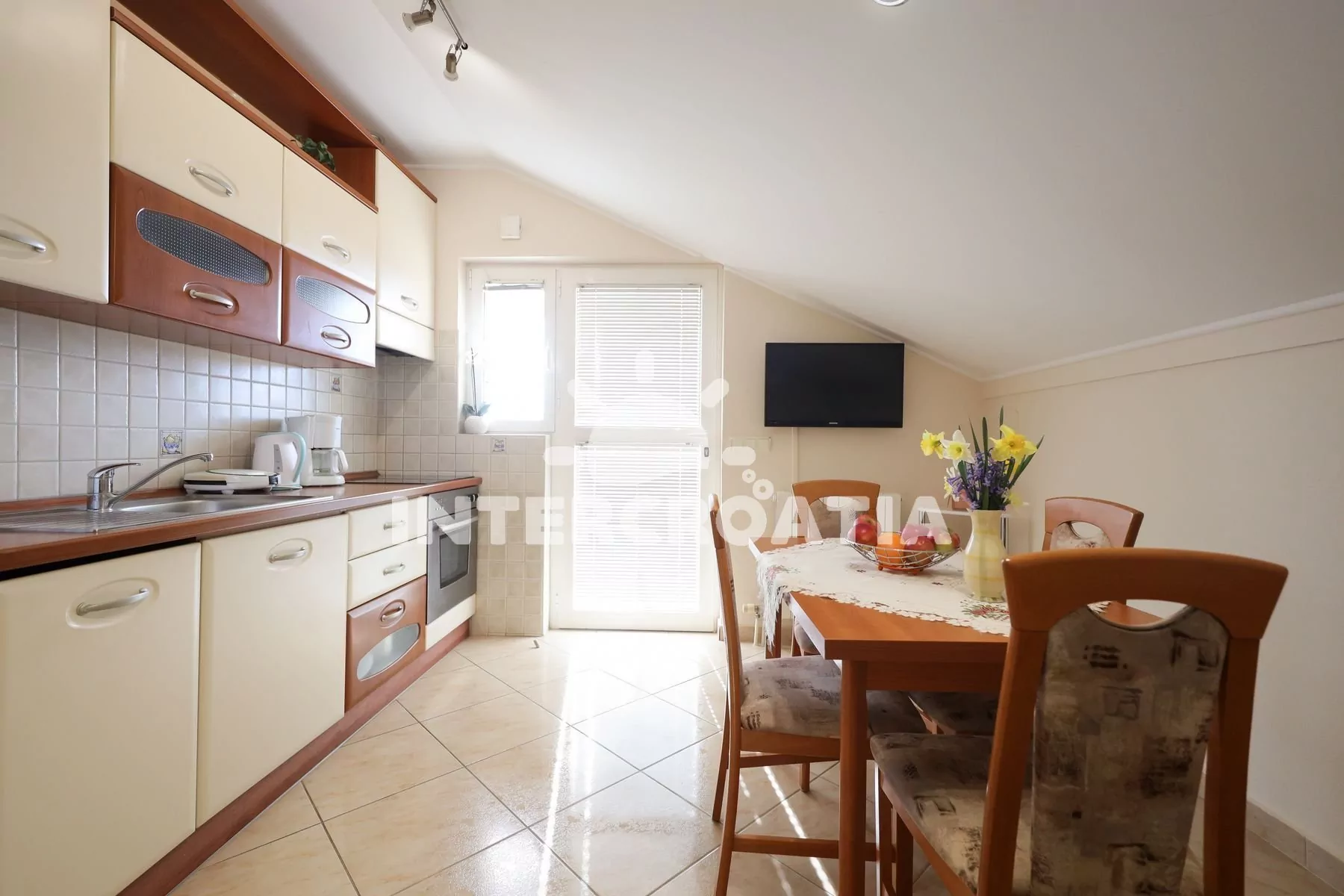 Apartmán (38 m2) s terasou, posezením a částečným výhledem na moře se nachází ve 2. patře domu. Apartmán má 1 ložnici a je vhodný pro 2 až 3 osoby. Obývací pokoj je spojený s kuchyní. Kuchyňská linka…