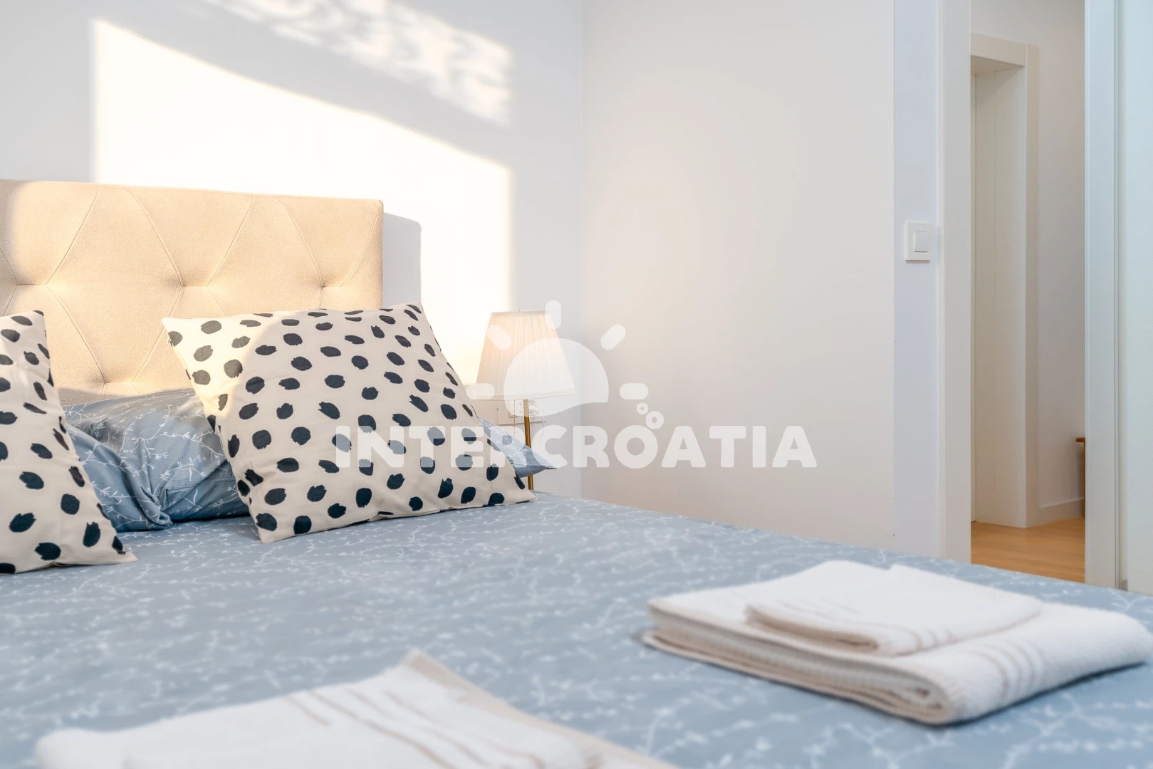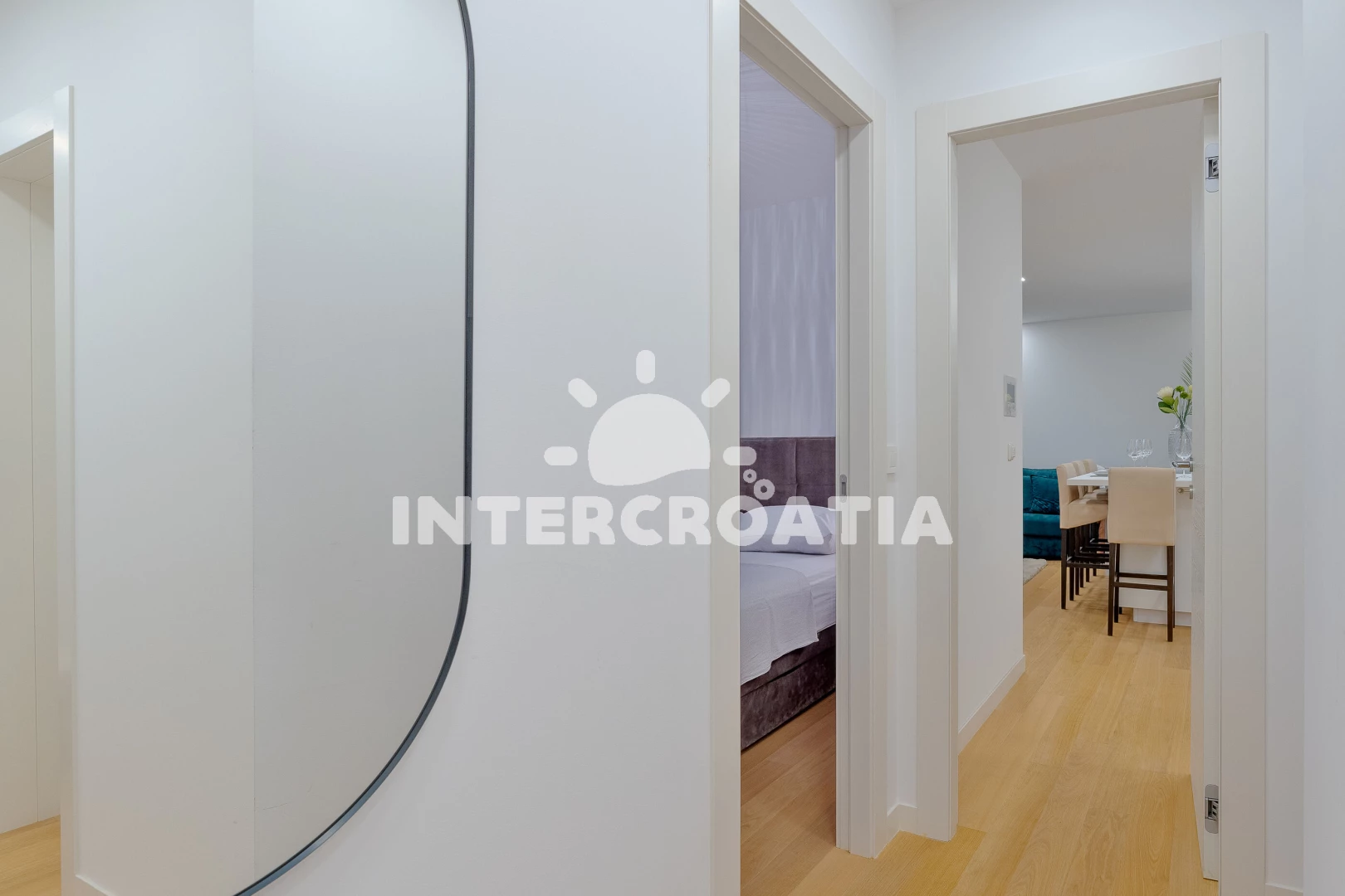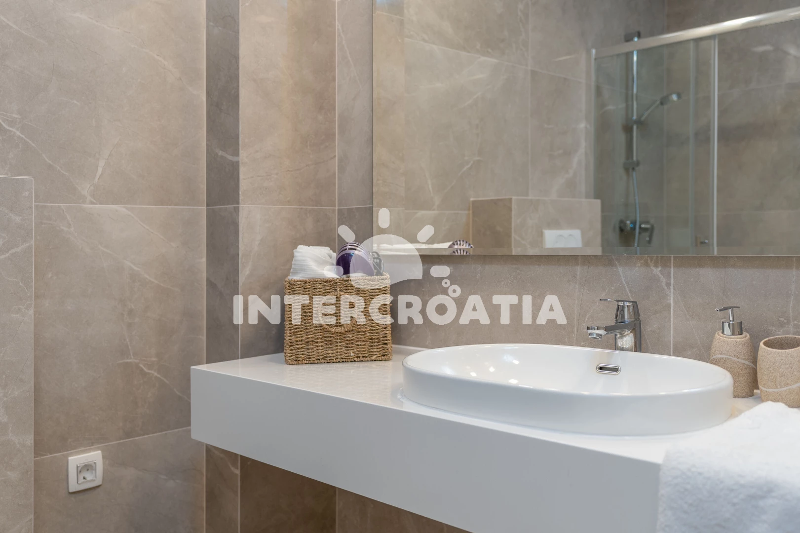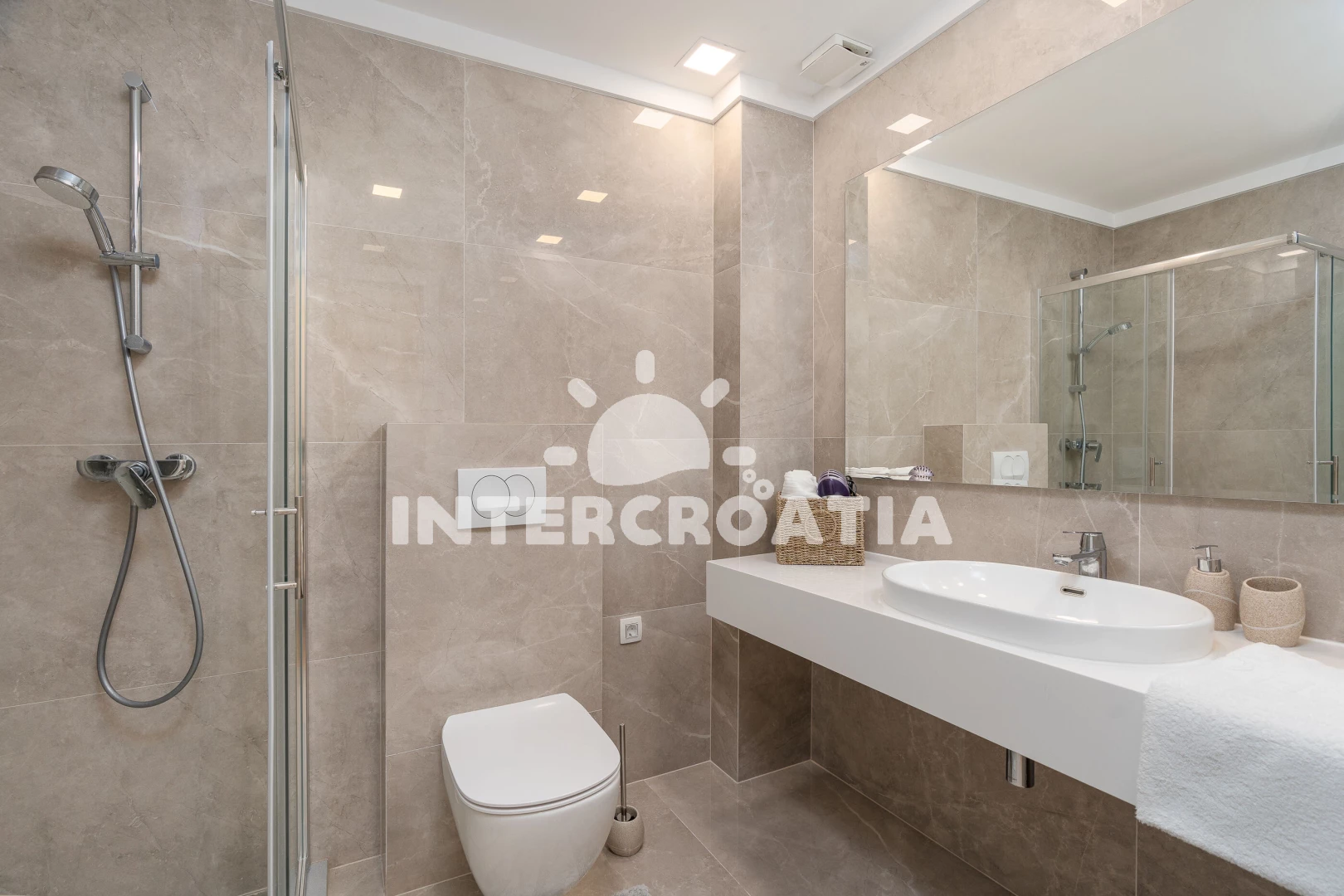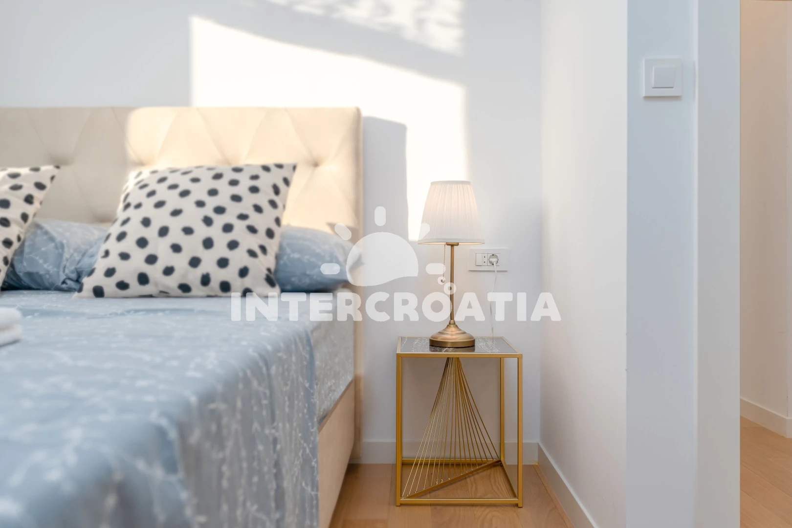 Apartmán (65 m2) s terasou, venkovním posezením a výhledem na moře se nachází ve 3. patře domu. Apartmán má 2 ložnice a je vhodný pro až 4 osoby. Obývací pokoj je spojený s kuchyní. Kuchyňská linka je vybavena varnou deskou, digestoří, vestavěnou troubou, myčkou na nádobí, mikrovlnnou troubou, rychlovarnou konvicí, toustovačem, nádobím a lednicí s mrazákem. Obývací pokoj s jídelním stolem, pohovkou, televizí se satelitním programem, klimatizací a vstupem na terasu. První i druhá ložnice je vybavena vždy s jedním dvoulůžkem. Koupelna se sprchovým koutem, umyvadlem a wc. Hostům je k dispozici parkování u objektu zdarma.