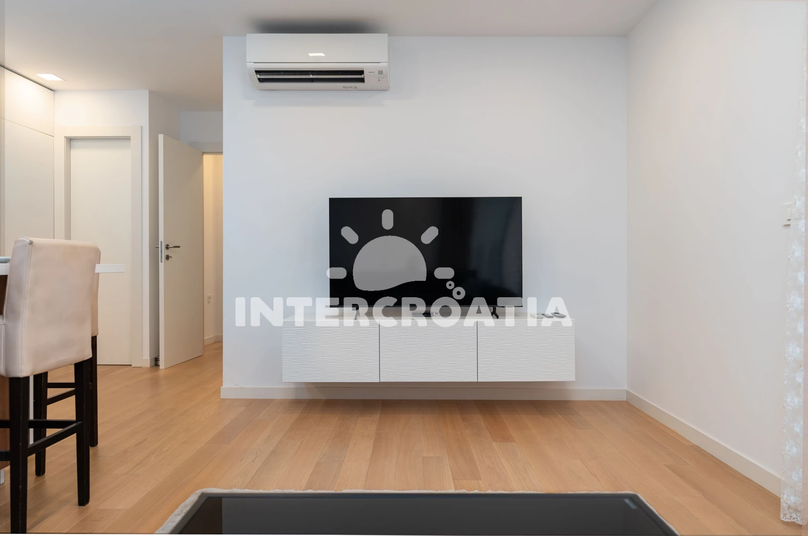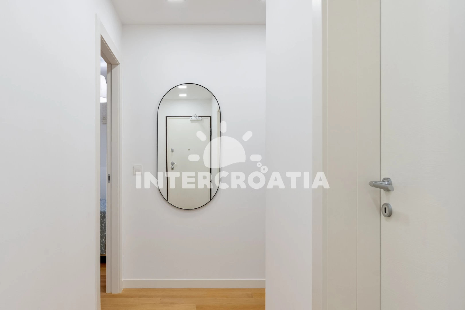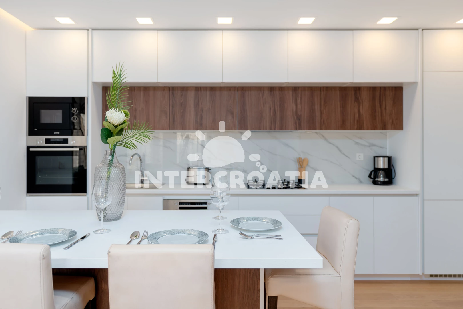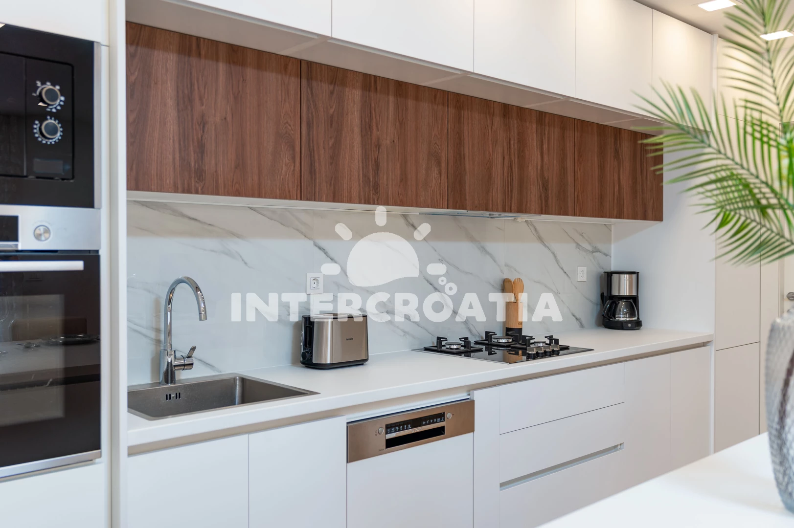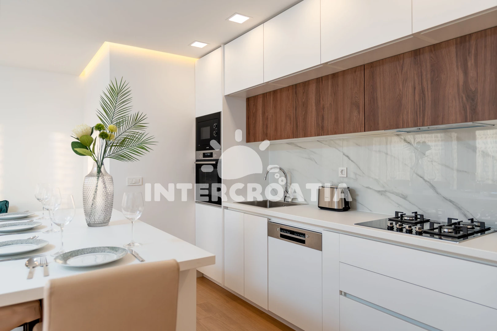 Apartmán (65 m2) s terasou, venkovním posezením a výhledem na moře se nachází ve 3. patře domu. Apartmán má 2 ložnice a je vhodný pro až 4 osoby. Obývací pokoj je spojený s kuchyní. Kuchyňská linka je vybavena varnou deskou, digestoří, vestavěnou troubou, myčkou na nádobí, mikrovlnnou troubou, rychlovarnou konvicí, toustovačem, nádobím a lednicí s mrazákem. Obývací pokoj s jídelním stolem, pohovkou, televizí se satelitním programem, klimatizací a vstupem na terasu. První i druhá ložnice je vybavena vždy s jedním dvoulůžkem. Koupelna se sprchovým koutem, umyvadlem a wc. Hostům je k dispozici parkování u objektu zdarma.