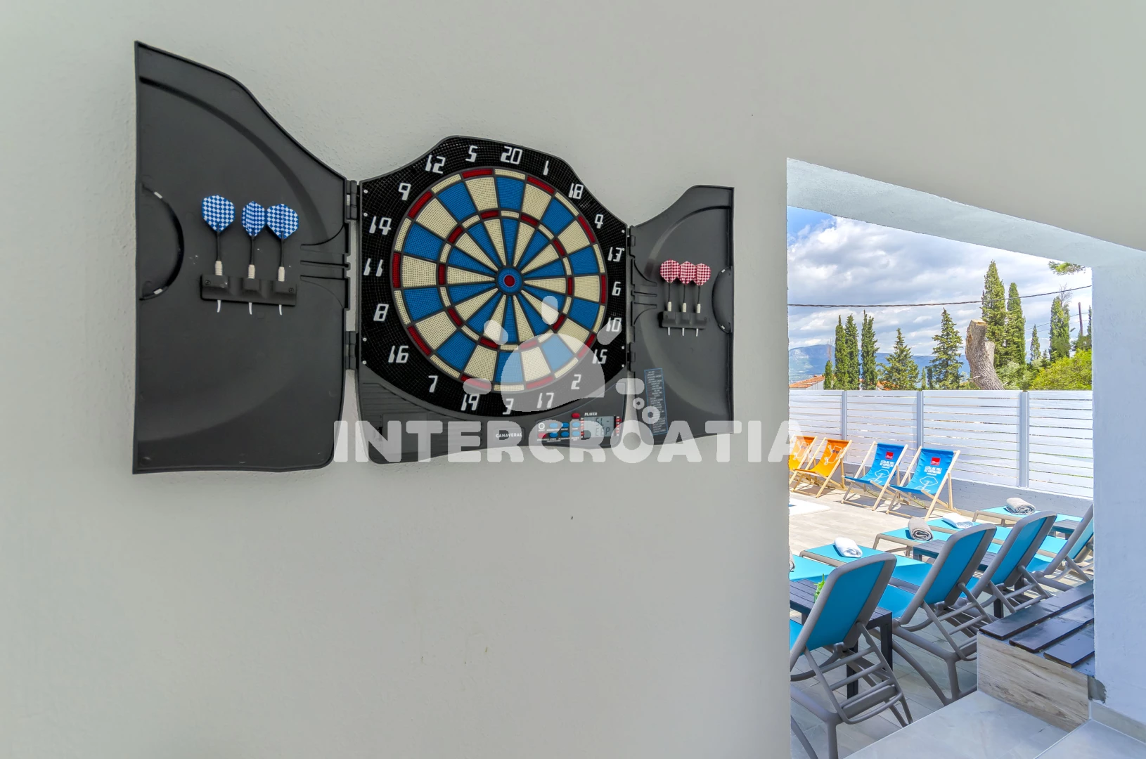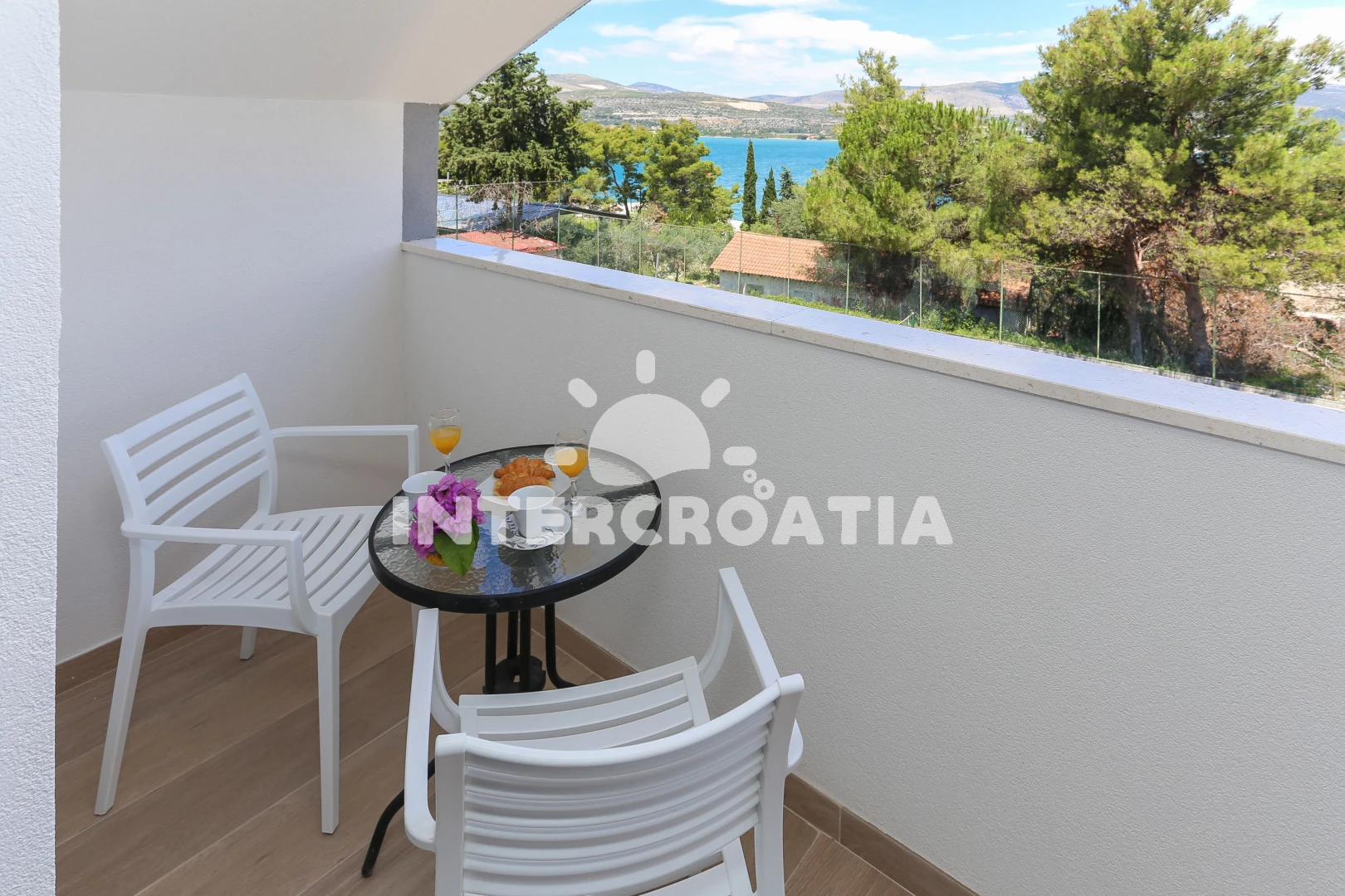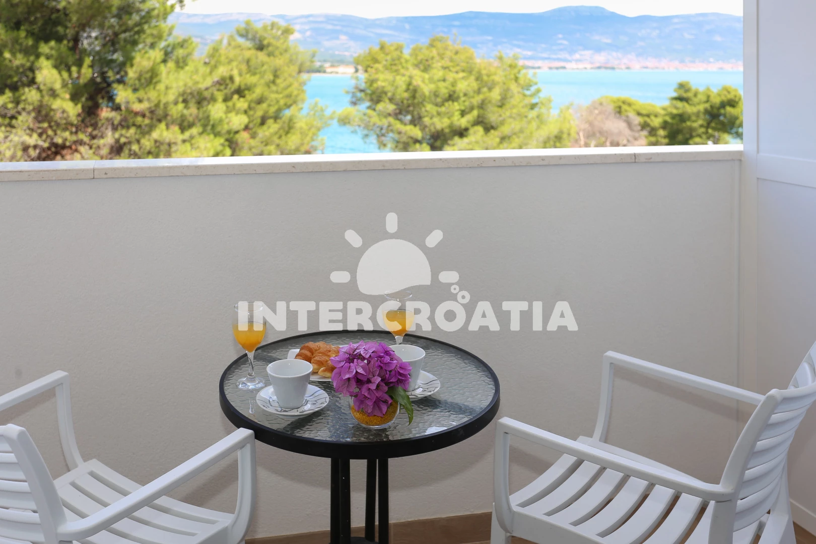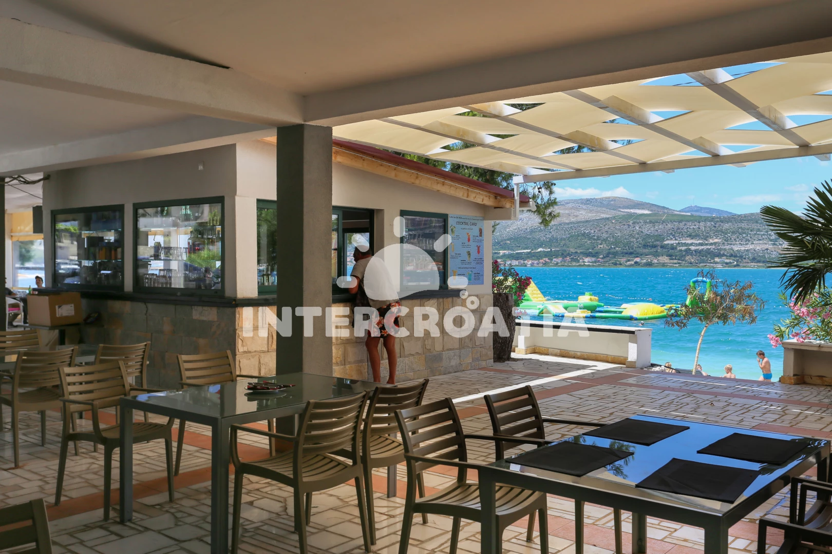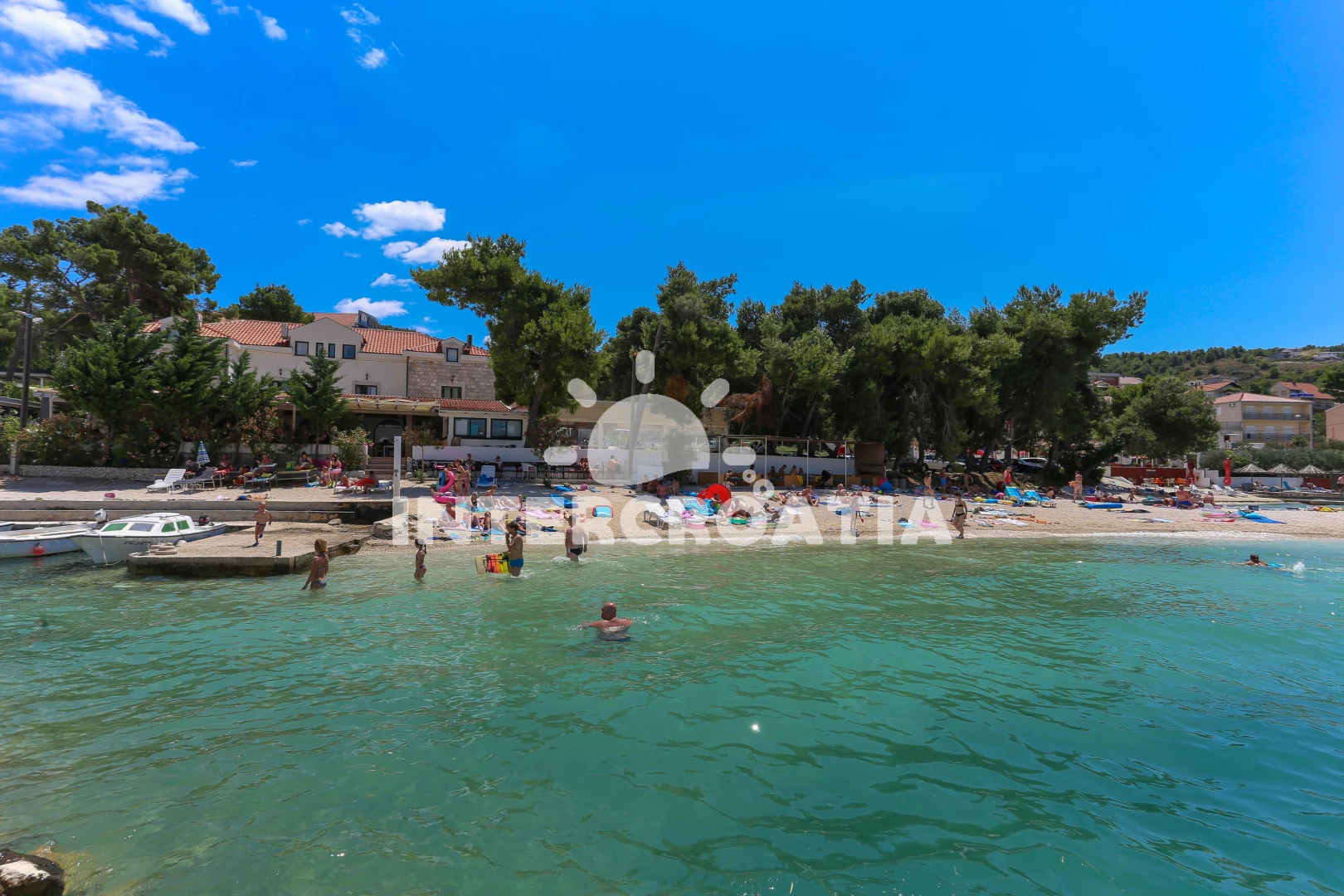 Vzdálenosti: Moře 49 m, pláž 49 m (oblázky), tenisové kurty 10 m, bar 10 m, restaurace 10 m, supermarket 15 m, veřejná doprava 20 m, půjčovna kol 20 m, centrum 3 km, směnárna 3 km, banka 3 km, ambulance 3 km, lékárna 3 km, marina 3 km, pošta 3 km, muzeum 3 km, čerpací stanice 4 km, letiště (Split) 8 km, trajekt (Split) 28 km,