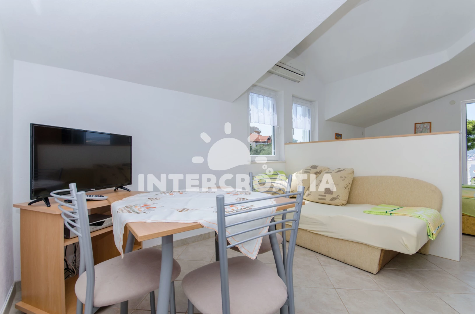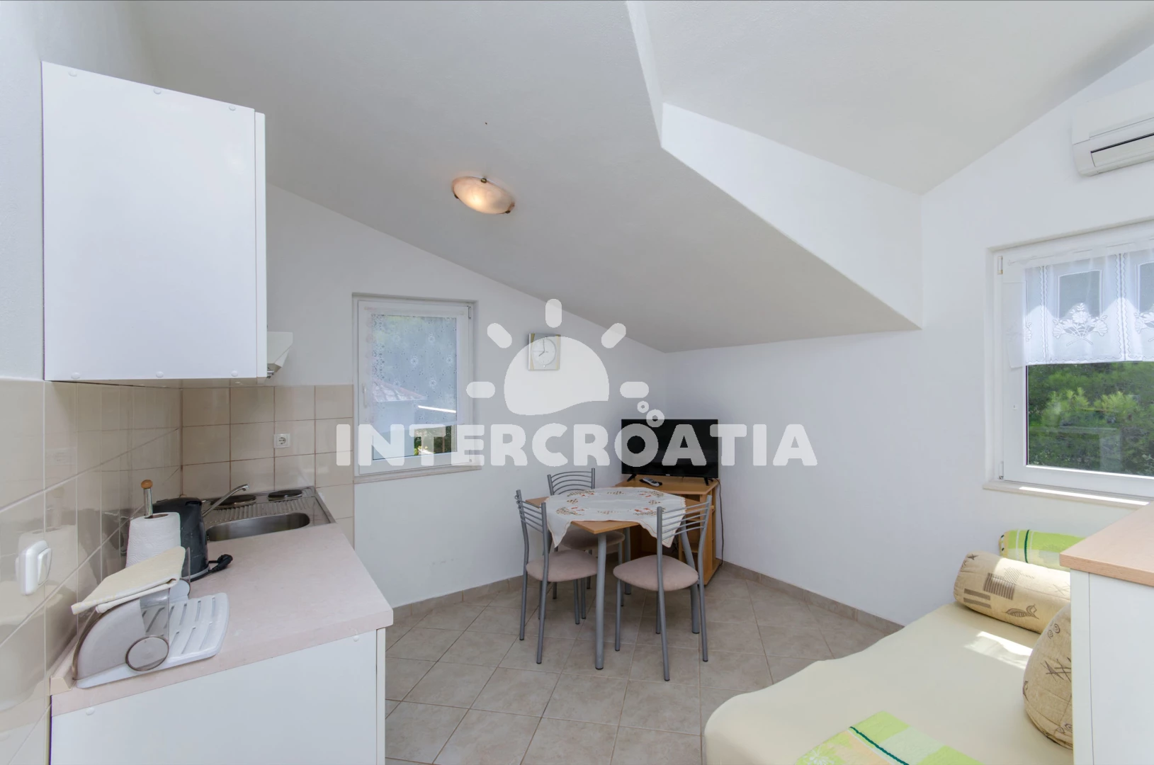 Apartmán typu studio (28 m2) s balkonem, a výhledem na moře. Nachází se v 1. patře objektu. Kuchyňská linka je vybavena varnou deskou, toustovačem, troubou, kávovarem, rychlovarnou konvicí, nádobím, lednicí. K dispozici dvoulůžko, televize se satelitním programem, žehlička. Koupelna se sprchovým koutem, umyvadlem, fénem a WC.