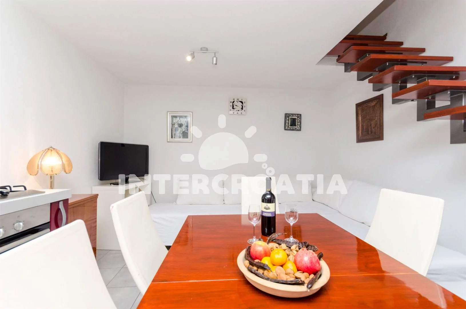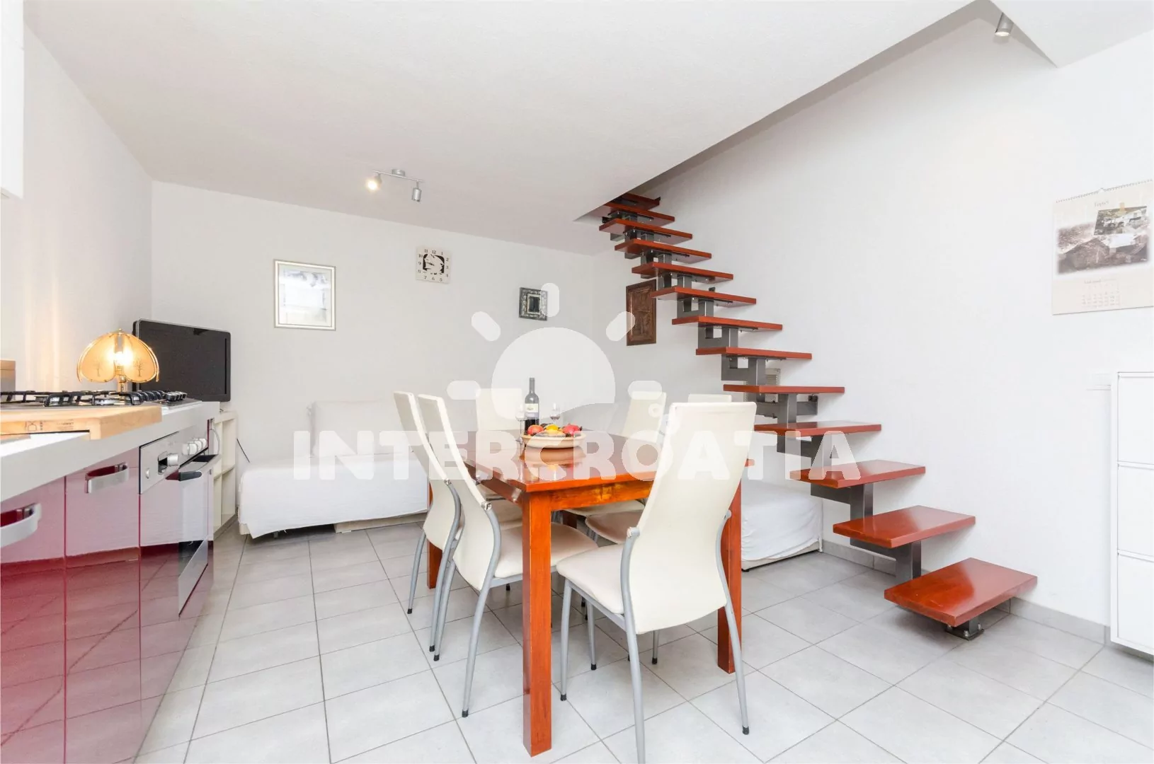 Apartmán rozdělen na dvě patra. První patro s kuchyňským koutem a obývacím pokojem. Kuchyňský kout s pracovní deskou, nádobím, elektrickým/plynovým sporákem, troubou, lednicí s mrazákem, myčkou na…