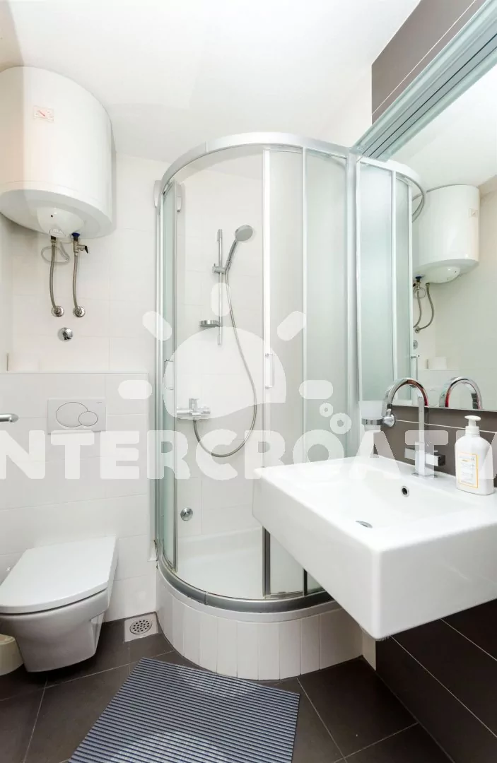 Apartmán rozdělen na dvě patra. První patro s kuchyňským koutem a obývacím pokojem. Kuchyňský kout s pracovní deskou, nádobím, elektrickým/plynovým sporákem, troubou, lednicí s mrazákem, myčkou na nádobí a jídelním stolem. Obývací část s pohovkou (extra lůžko pro dvě osoby) a televizí se satelitním programem. Druhé patro: ložnice s dvoulůžkem. Apartmán má dvě koupelny, první koupelna s vanou, umyvadlem a wc. Druhá koupelna se sprchovým koutem, umyvadlem a wc. K dispozici: WiFi, klimatizace, fén, žehlička a dětská postýlka (služba na požádání).