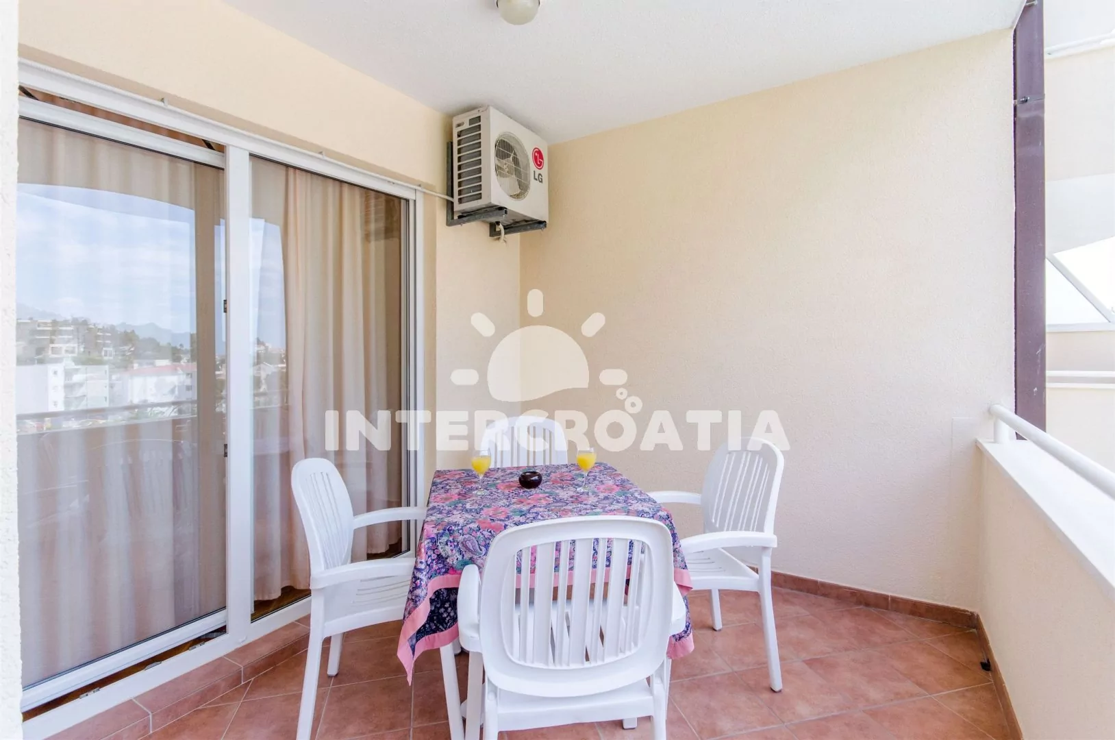 Apartmán s výhledem na moře a klidnou ulici, pro 2 až 4 osoby se nachází v prvním patře domu. Kuchyň je spojena s obývacím pokojem. Kuchyňský kout je vybaven nádobím, elektrickým sporákem, digestoří, rychlovarnou konvicí a lednicí s mrazákem. Obývací část s jídelním stolem, rozkládací pohovkou (extra lůžko pro 2 osoby), televizí se satelitním programem a vstupem na terasu. Ložnice s jedním manželským dvoulůžkem a vstupem na balkon. Koupelna se sprchovým koutem, umyvadlem, fénem a wc. K dispozici: klimatizace, žehlička a terasa s posezením.