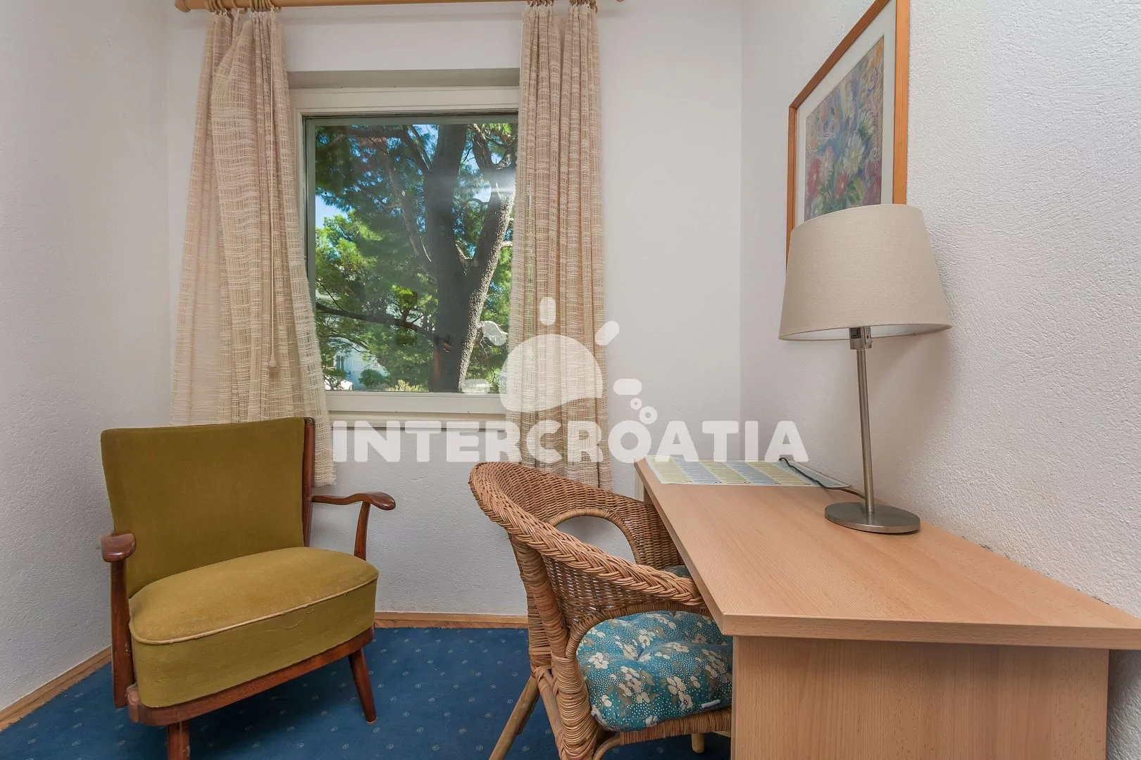 Apartmán (40 m2) pro 2 až 3 osoby, v prvním patře vily s posezením na terase (10 m2). Vstup: Obývací pokoj spojený s kuchyní. Kuchyňská linka se sporákem, troubou, mikrovlnnou troubou, rychlovarnou konvicí, kávovarem a lednicí s mrazákem. Obývací pokoj s jídelním stolem pro 4 osoby, rozložitelnou pohovkou (extra lůžko pro 1 osobu), televizí se satelitním programem, klimatizací a vstupem na terasu. Ložnice s jedním dvoulůžkem. Koupelna se sprchovým koutem, umyvadlem a wc. Hostům je k dispozici: sejf, venkovní posezení na terase a parkování u objektu zdarma.