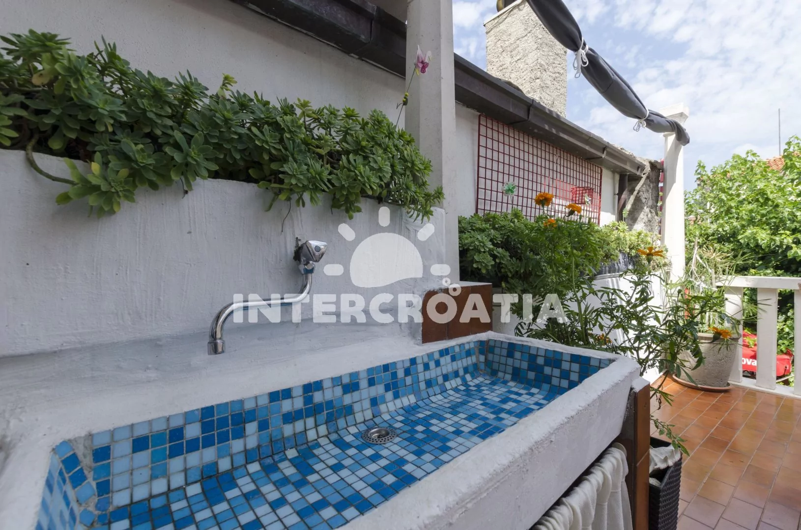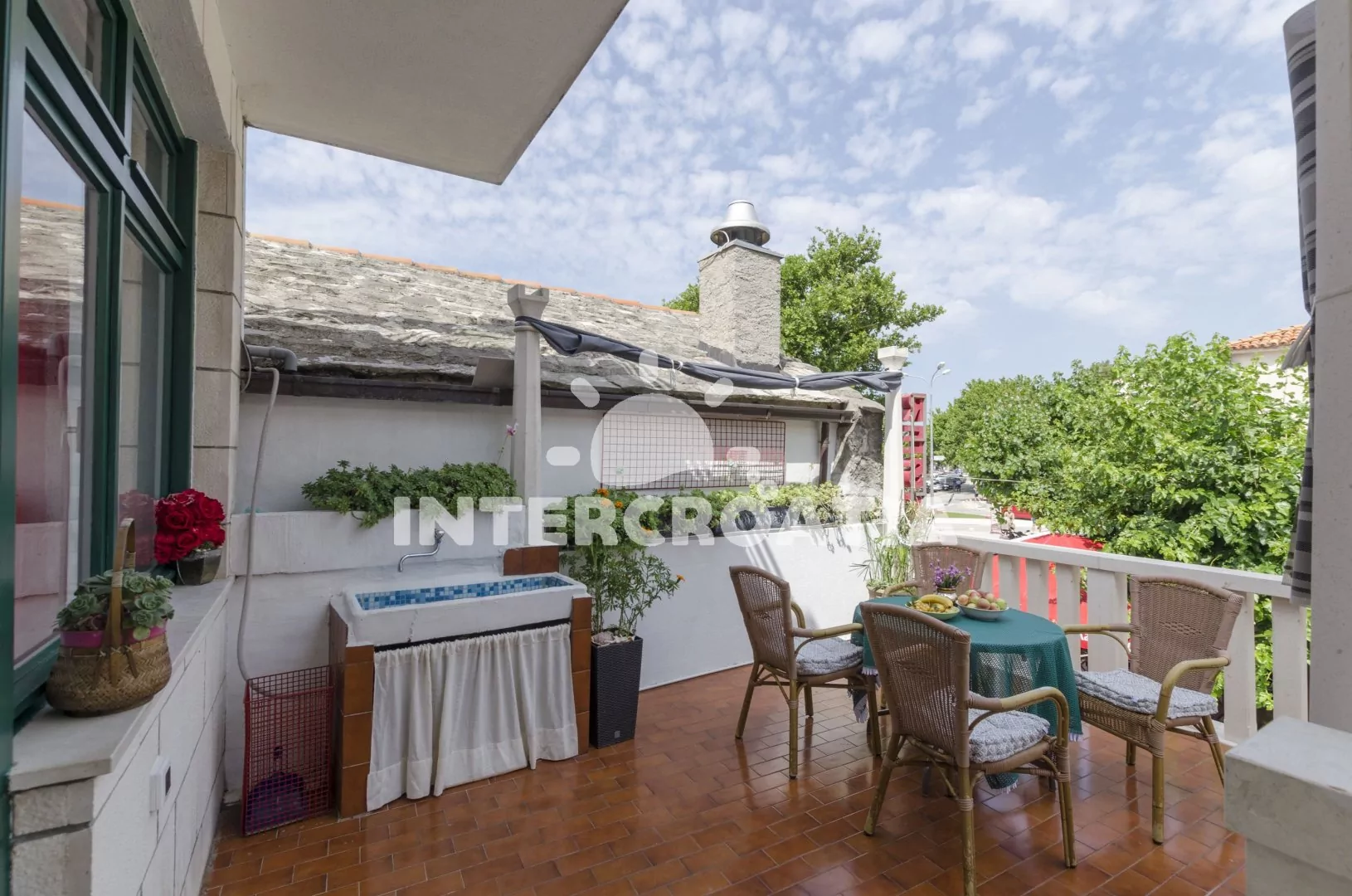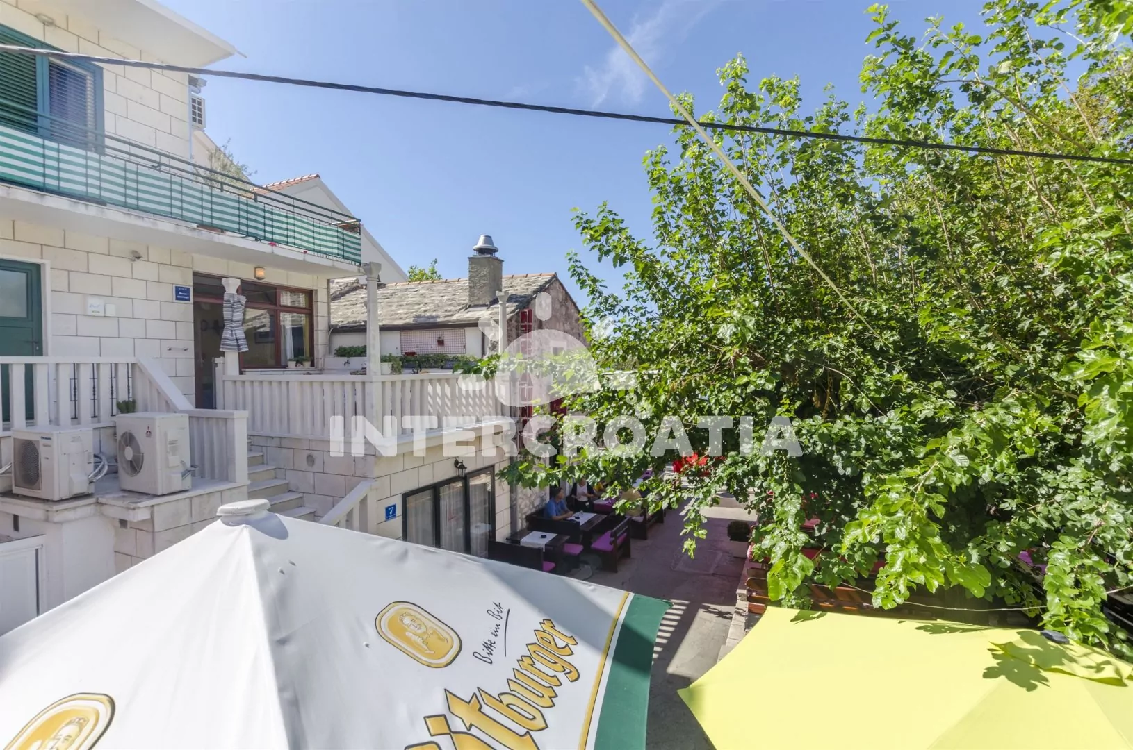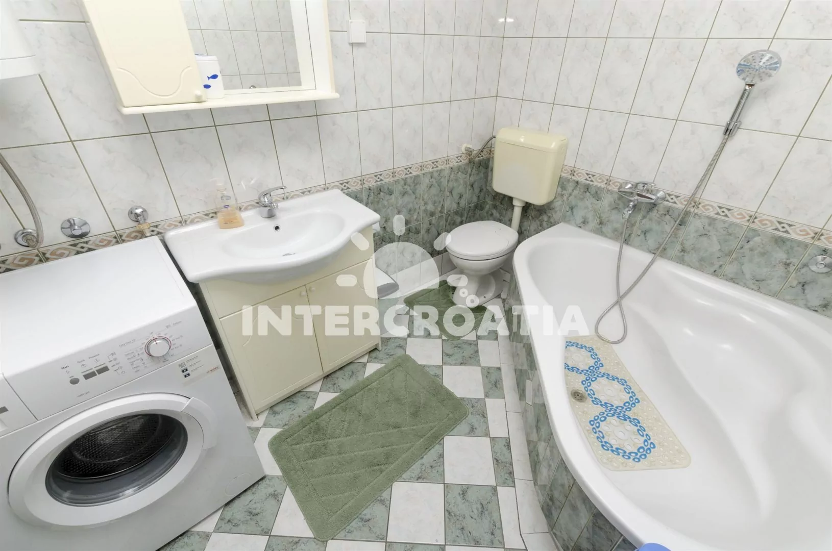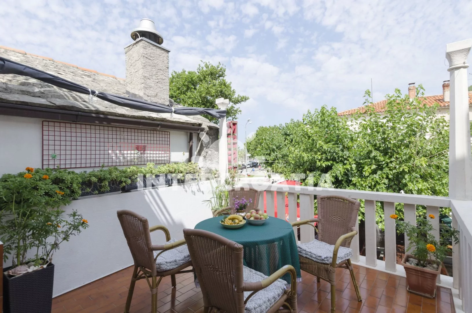 Apartmán s bočním výhledem na moře se nachází v prvním patře domu a je vhodný pro 5 osob. Obývací pokoj je spojený s kuchyní. Kuchyňská linka je vybavena sporákem, digestoří, troubou, myčkou na nádobí, mikrovlnnou troubou, rychlovarnou konvicí, kávovarem, nádobím a lednicí s mrazákem. Obývací pokoj s jídelním stolem pro 4 osoby, televizí se satelitním programem, klimatizací a vstupem na terasu. První ložnice s jedním dvoulůžkem. Druhá ložnice s dvoulůžkem a jednolůžkem. Koupelna s vanou, sprchou, umyvadlem, fénem, pračkou a wc. Vzhledem k umístění domu v centru je hostům k dispozici parkování 300 až 500 m od objektu.