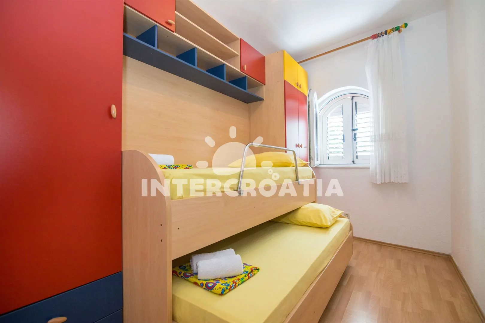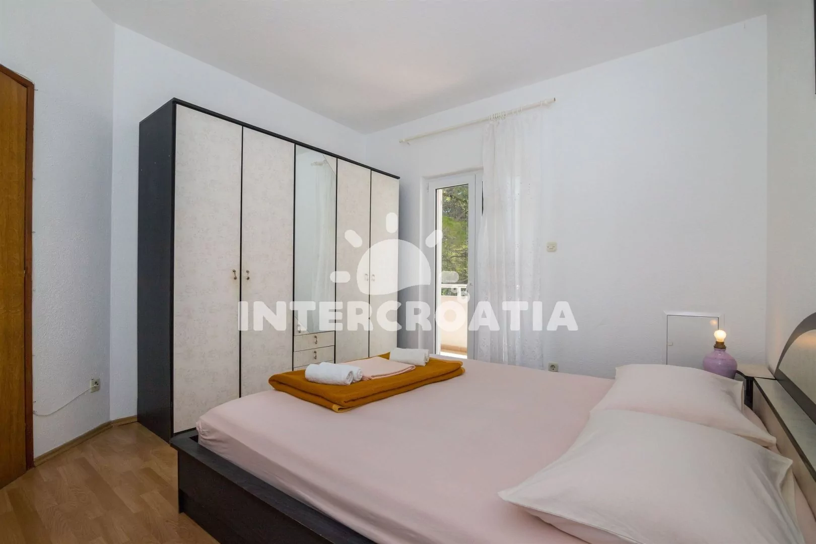 Velký apartmán s třemi ložnicemi se nachází v prvním patře s výhledem do klidné ulice. Apartmán je vhodný až pro 7 osob. Obývací pokoj je spojený s kuchyní. Kuchyňská linka je vybavena sporákem, digestoří, troubou, myčkou na nádobí, nádobím a lednicí s mrazákem. Obývací pokoj s jídelním stolem pro 6 osob, sedací soupravou s rohovou pohovkou, televizí se satelitním programem, radiem, DVD přehrávačem, klimatizací a vstupem na balkon. První ložnice s jedním dvoulůžkem a vstupem na balkon. Druhá ložnice s dvoulůžkem a jednolůžkem. Třetí ložnice s patrovou postelí (dvě jednolůžka). První koupelna s vanou, sprchou, umyvadlem, pračkou, fénem a wc. Druhá koupelna se sprchovým koutem, umyvadlem a wc. Hostům je k dispozici parkování u objektu zdarma.