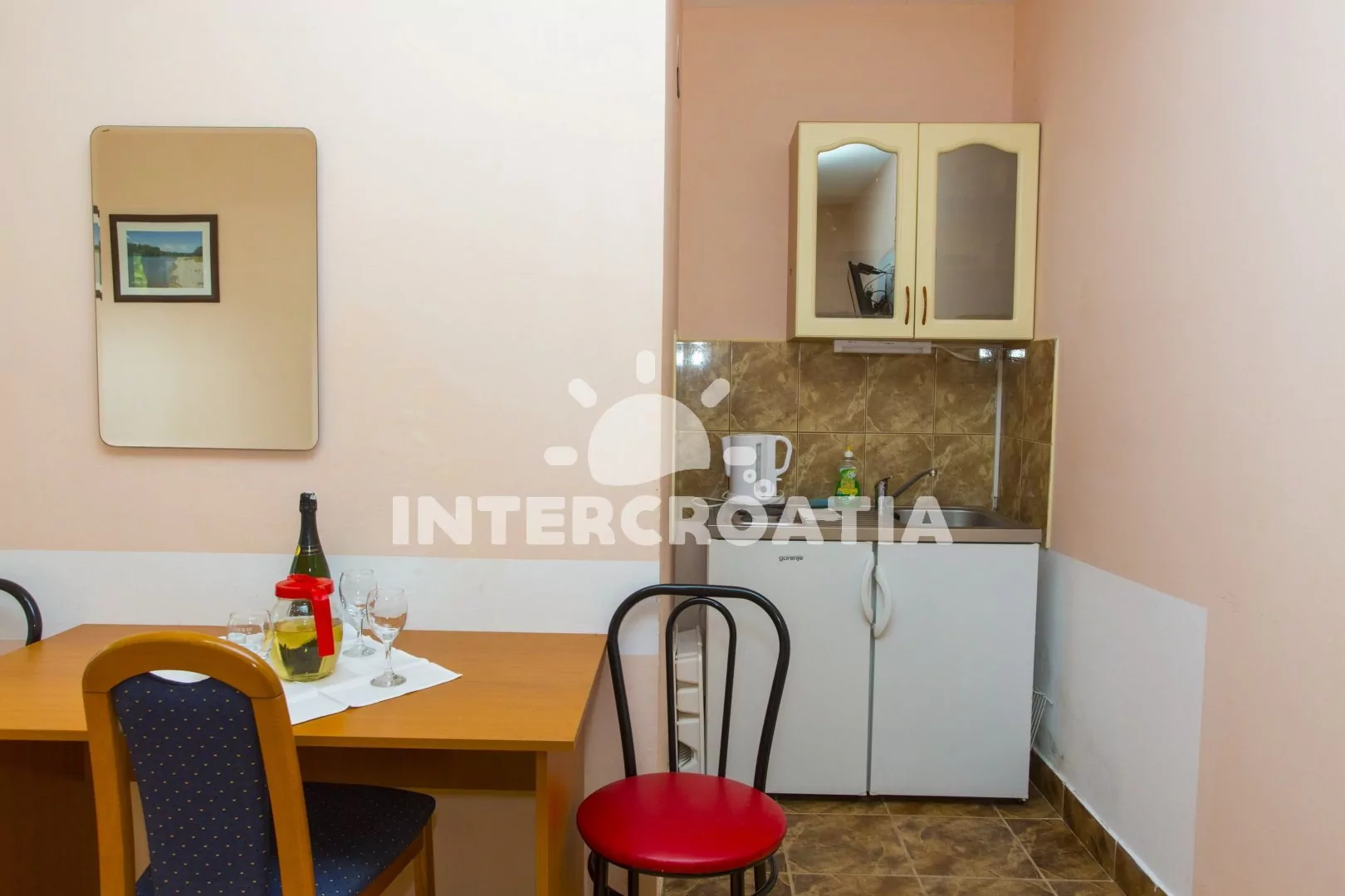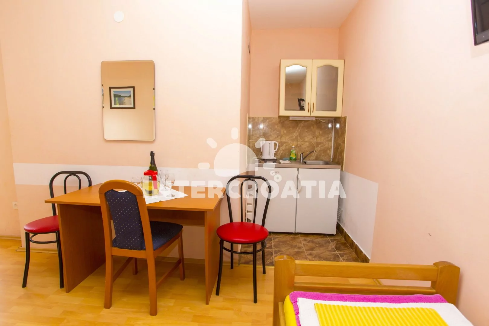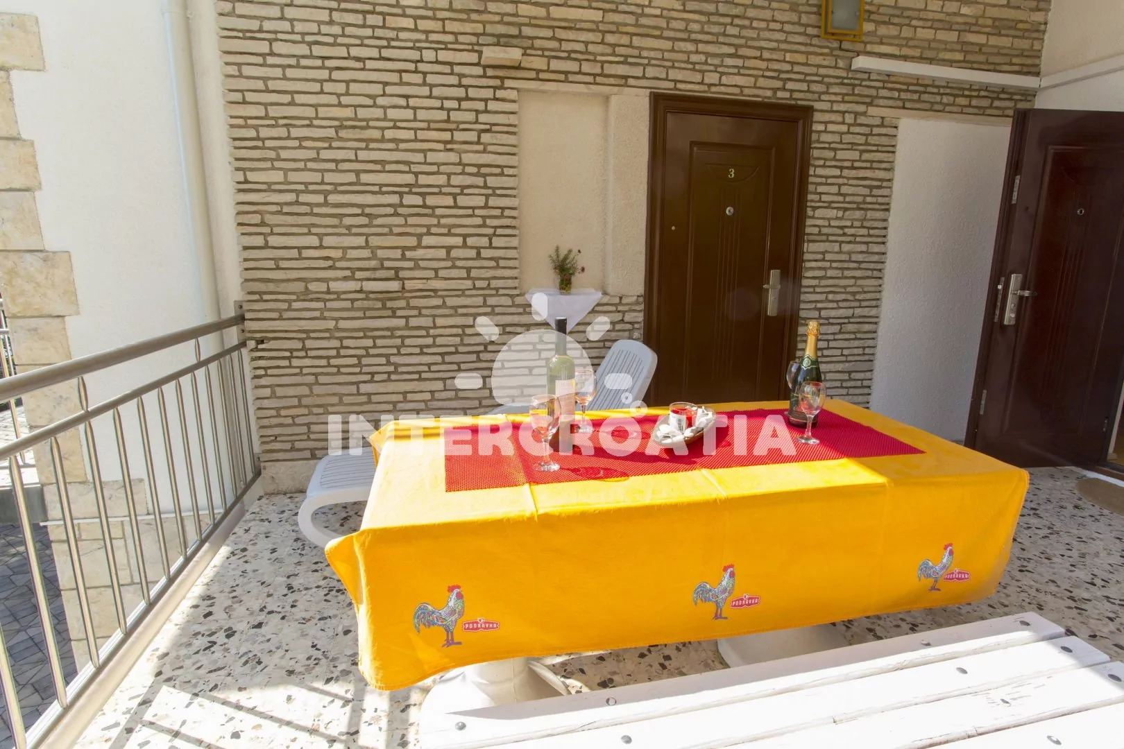 Apartmán (25 m2) s terasou, částečným výhledem na moře a venkovním posezením se nachází v 1. patře domu. Apartmán je vhodný pro až 3 osoby. Obývací místnost s jídelním stolem, televizí, kuchyňskou linkou, dvoulůžkem, jedním jednolůžkem, klimatizací a vstupem na terasu. Kuchyňská linka je vybavena dvouplotýnkovým vařičem, kávovarem, nádobím a lednicí s mrazákem. Koupelna se sprchovým koutem, umyvadlem, fénem a wc. Hostům je k dispozici parkování u objektu zdarma.