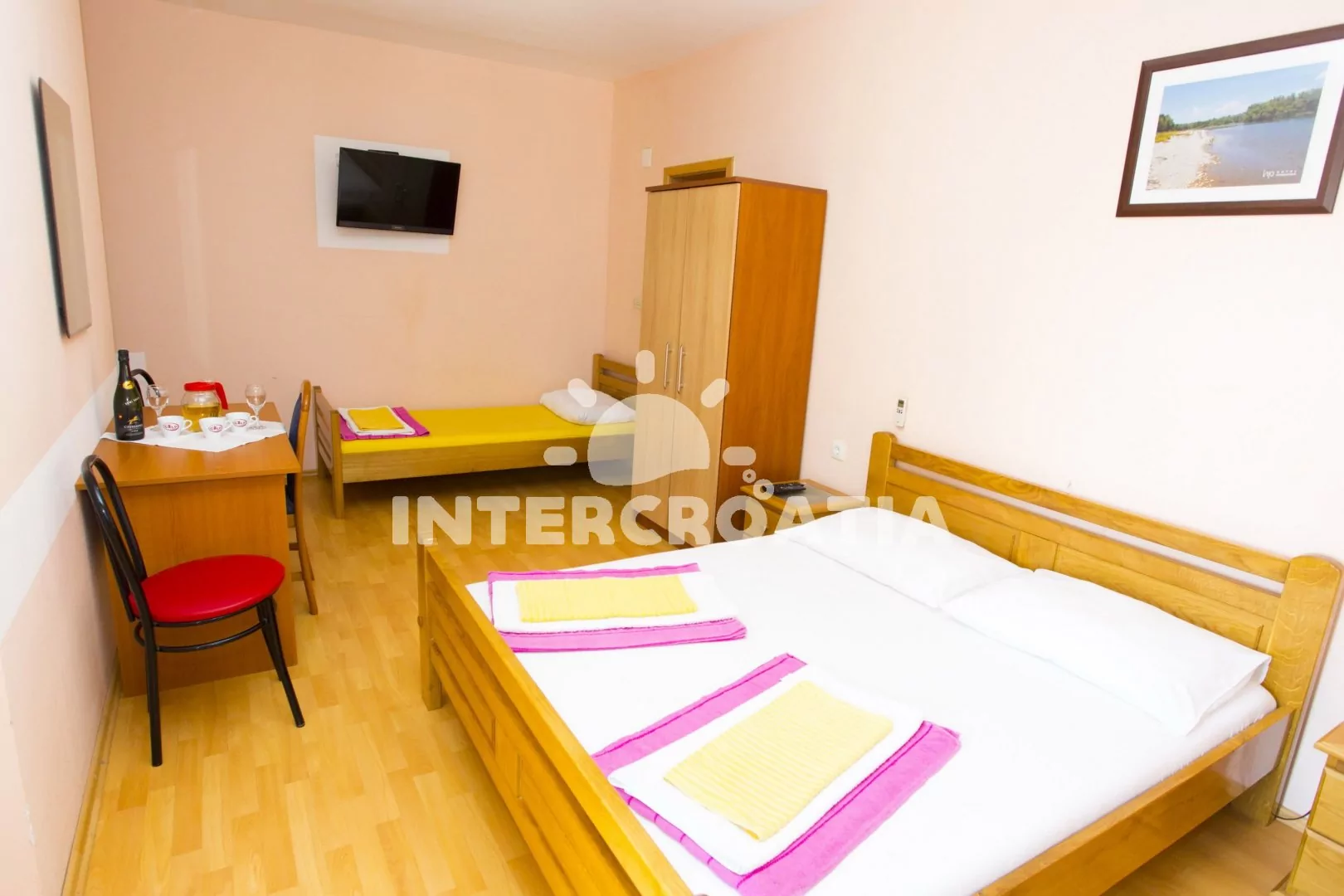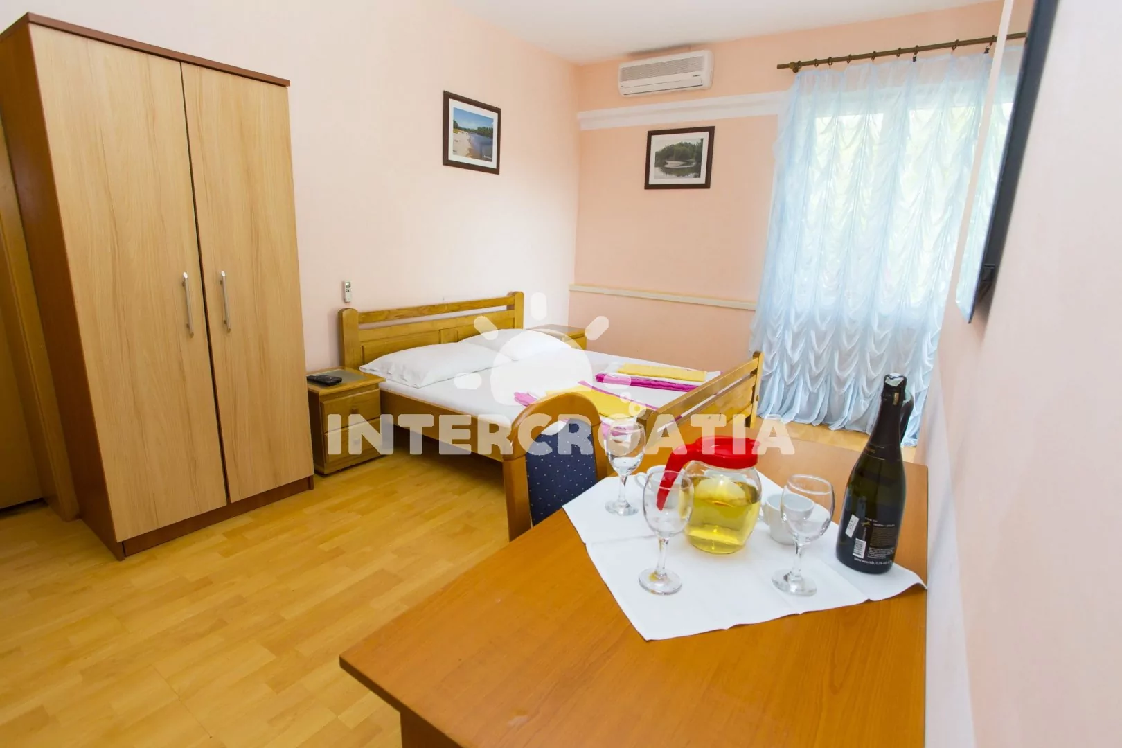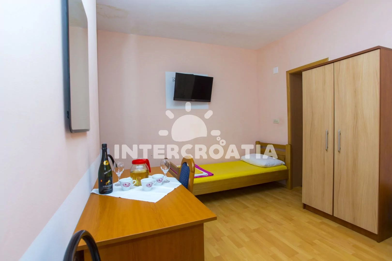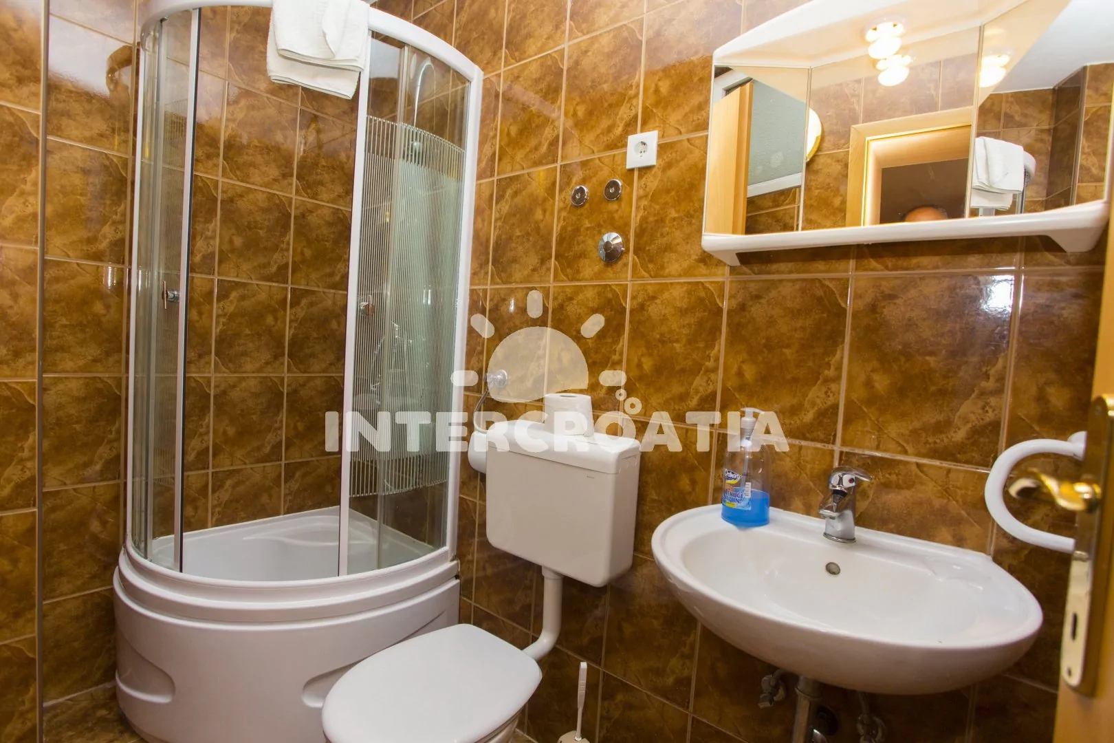 Apartmán (25 m2) s terasou, částečným výhledem na moře a venkovním posezením se nachází v 1. patře domu. Apartmán je vhodný pro až 3 osoby. Obývací místnost s jídelním stolem, televizí, kuchyňskou linkou, dvoulůžkem, jedním jednolůžkem, klimatizací a vstupem na terasu. Kuchyňská linka je vybavena dvouplotýnkovým vařičem, kávovarem, nádobím a lednicí s mrazákem. Koupelna se sprchovým koutem, umyvadlem, fénem a wc. Hostům je k dispozici parkování u objektu zdarma.