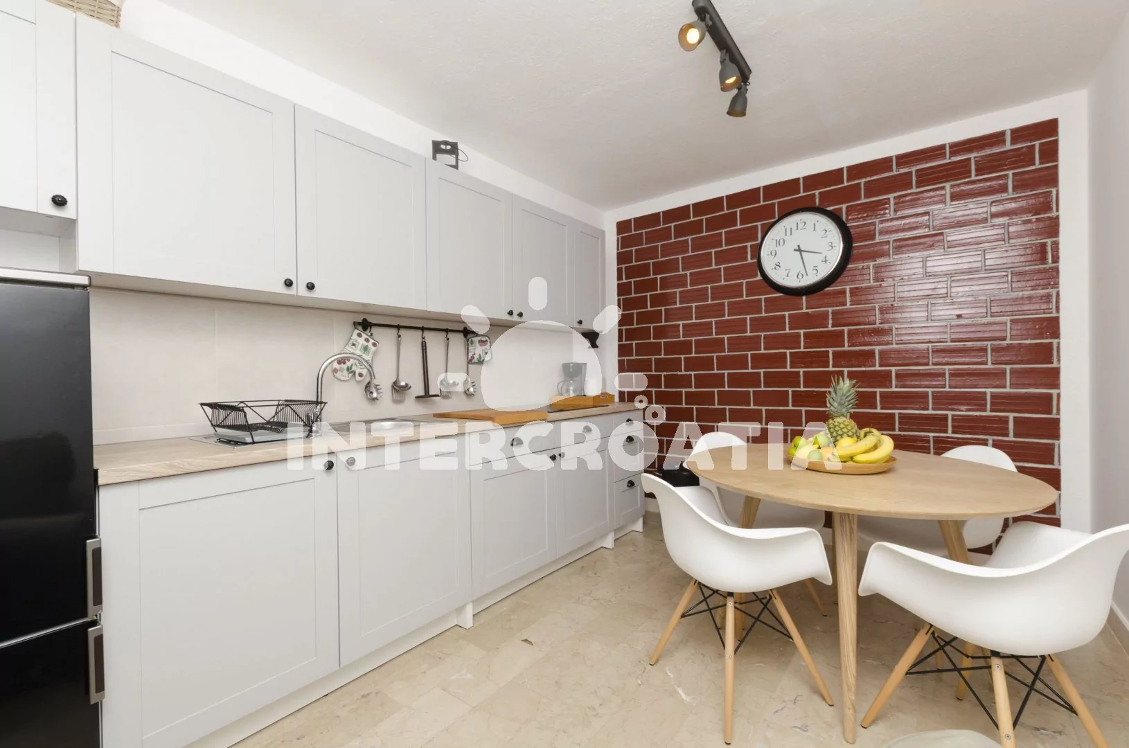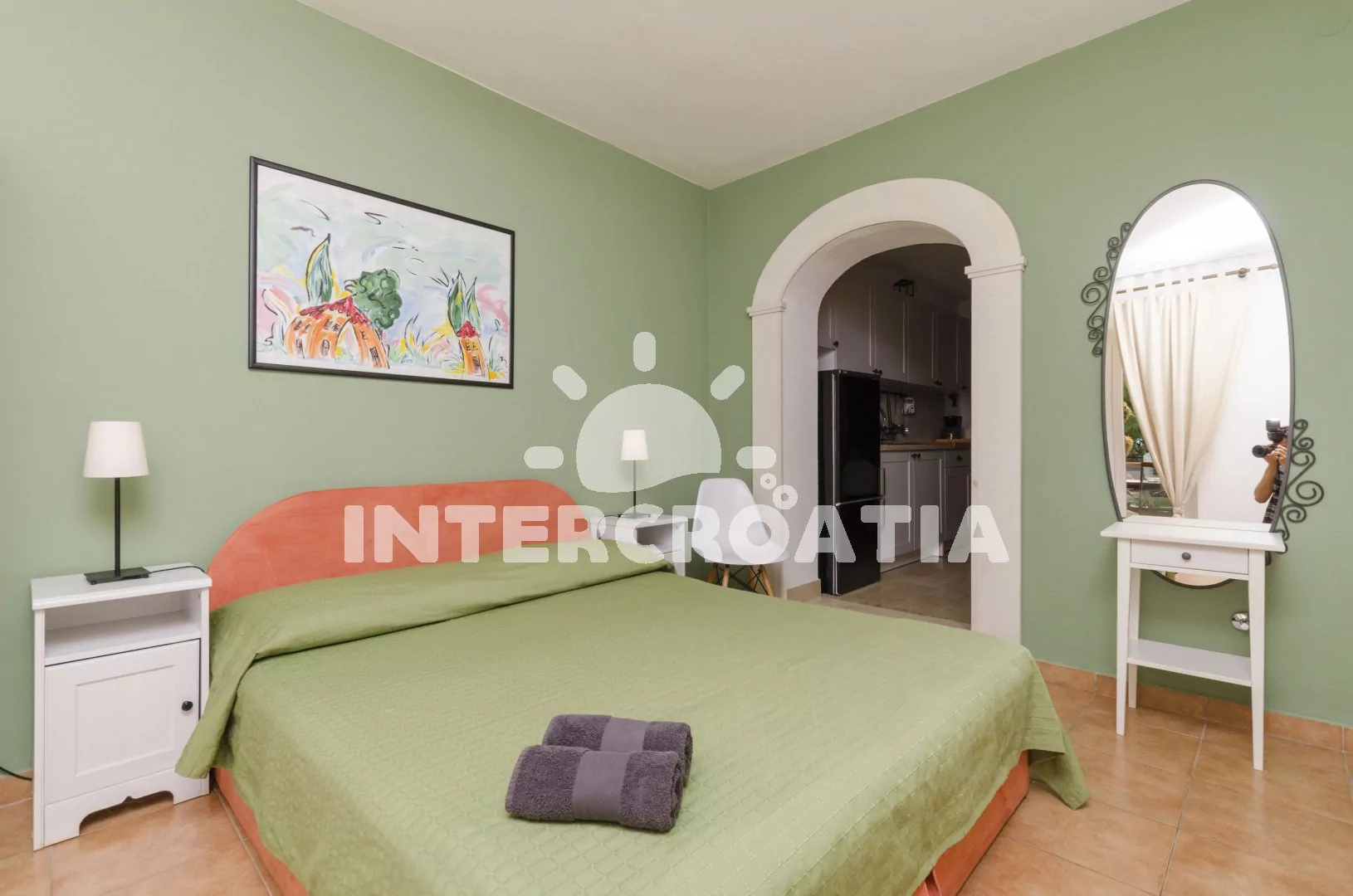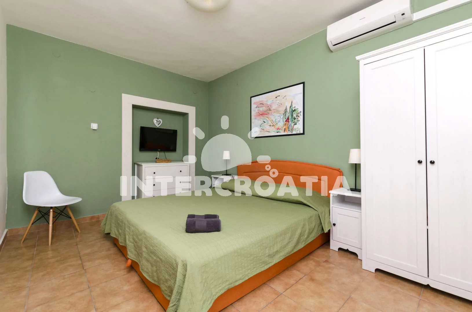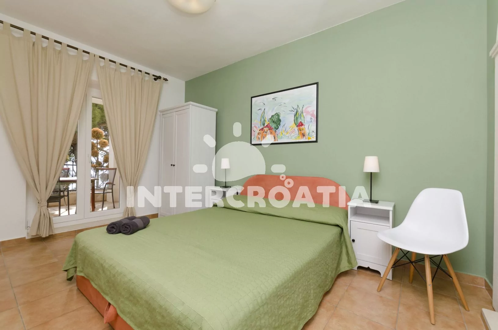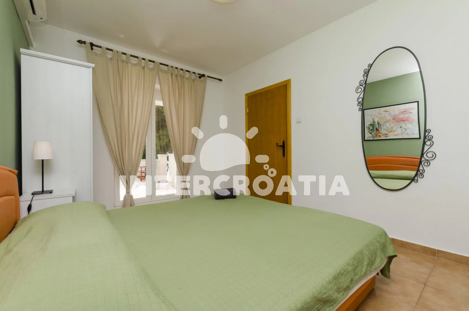 Moderně zařízený apartmán (40 m2) pro 4 osoby se nachází v přízemí objektu. Kuchyň je vybavena sklokeramickou varnou deskou, kávovarem, rychlovarnou konvicí, nádobím, chladničkou s mrazákem a jídelním stolem. První ložnice s jedním dvoulůžkem a vstupem na terasu. Druhá ložnice s jedním dvoulůžkem, televizí, klimatizací a vstupem na terasu. Koupelna se sprchovým koutem, umyvadlem, fénem a wc. K dispozici: WiFi, klimatizace, dětská postýlka (služba na požádání), terasa s lehátky (60m2), posezením a výhledem na moře.