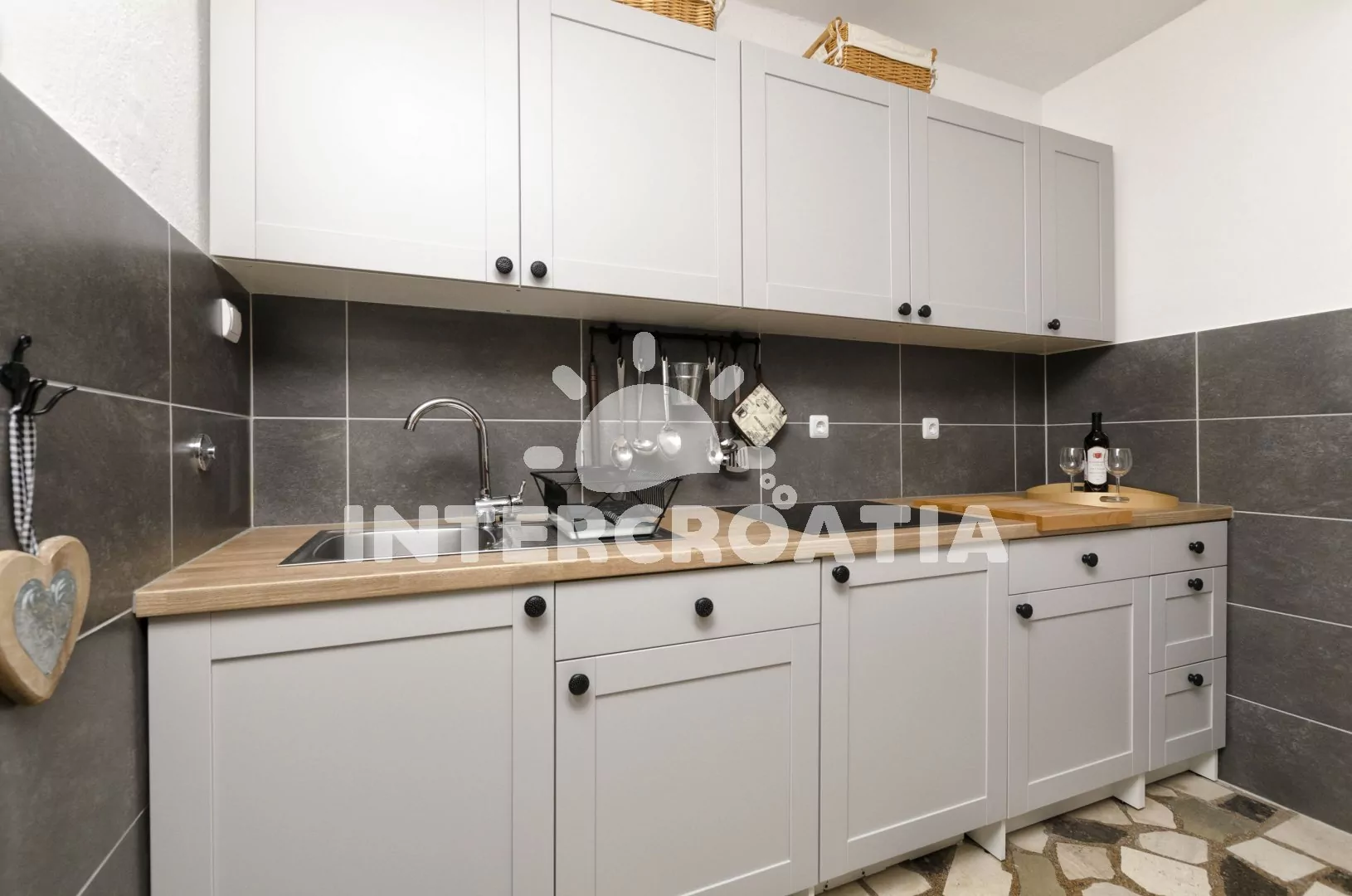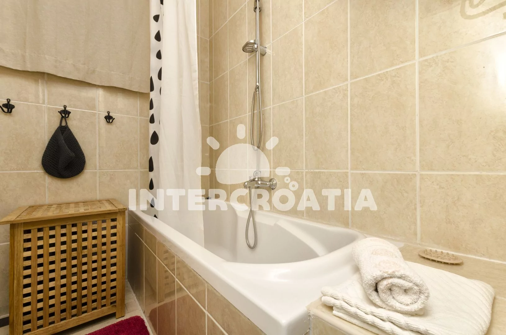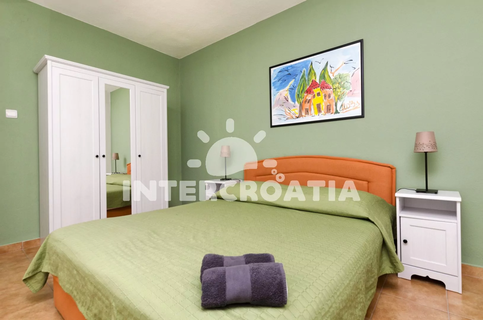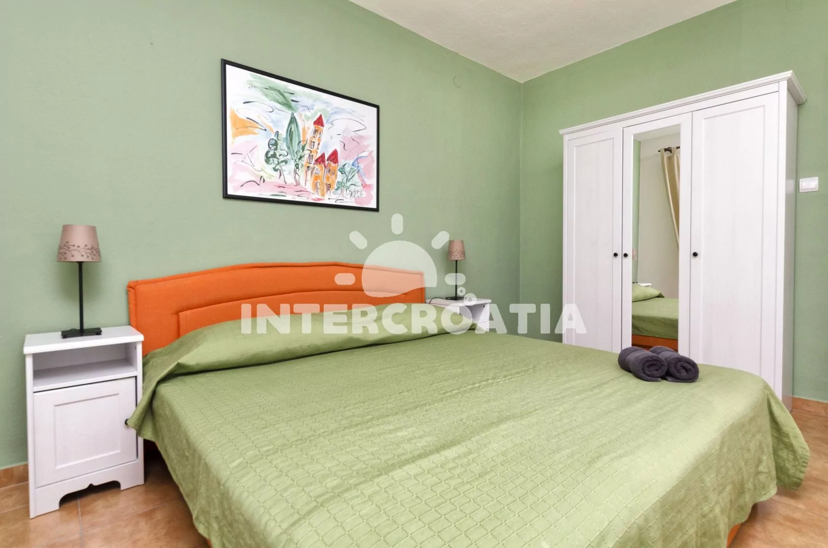 Moderně zařízený apartmán pro 4 osoby se nachází v prvním patře objektu. Kuchyň je vybavena sklokeramickou varnou deskou, kávovarem, rychlovarnou konvicí, nádobím, chladničkou s mrazákem, jídelním stolem a televizí. První i druhá ložnice je vybavena jedním dvoulůžkem. Koupelna s vanou, sprchovou zástěnou, umyvadlem, fénem a wc. K dispozici: WiFi, klimatizace, dětská postýlka (služba na požádání), terasa s lehátky, posezením a výhledem na moře.