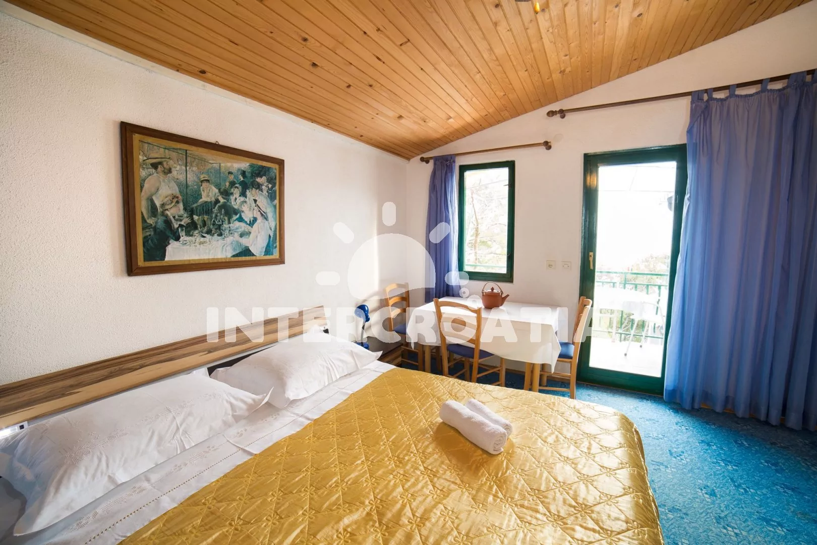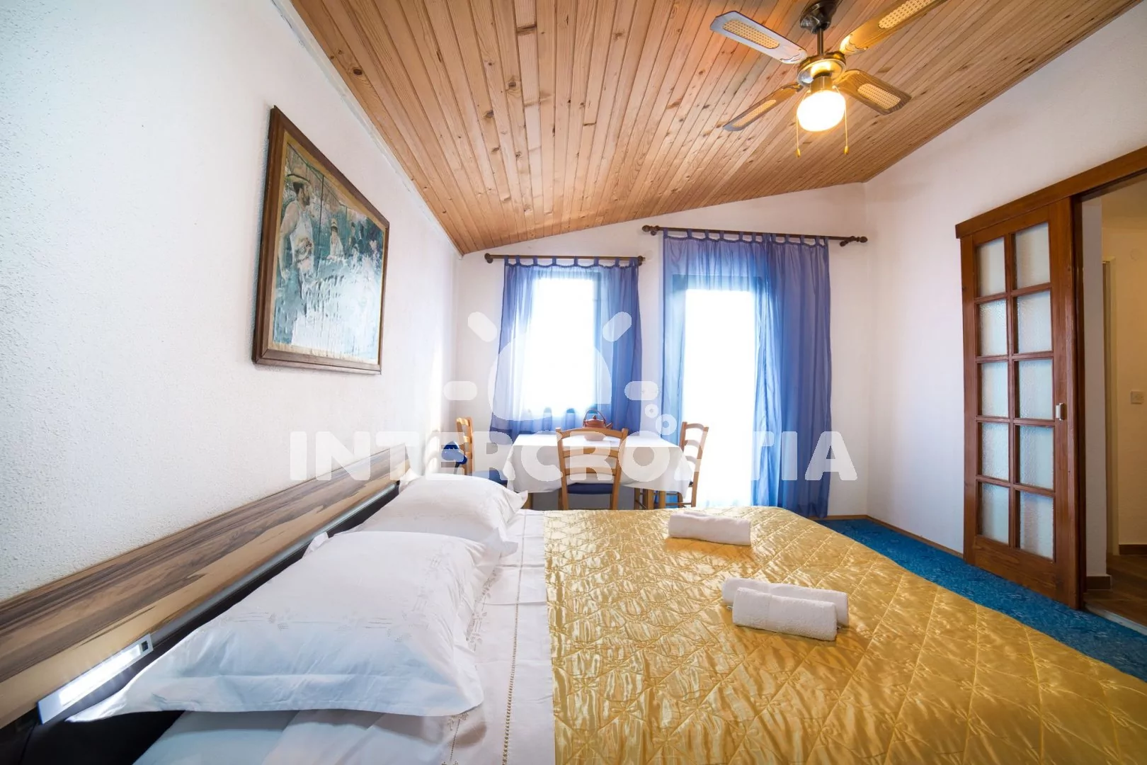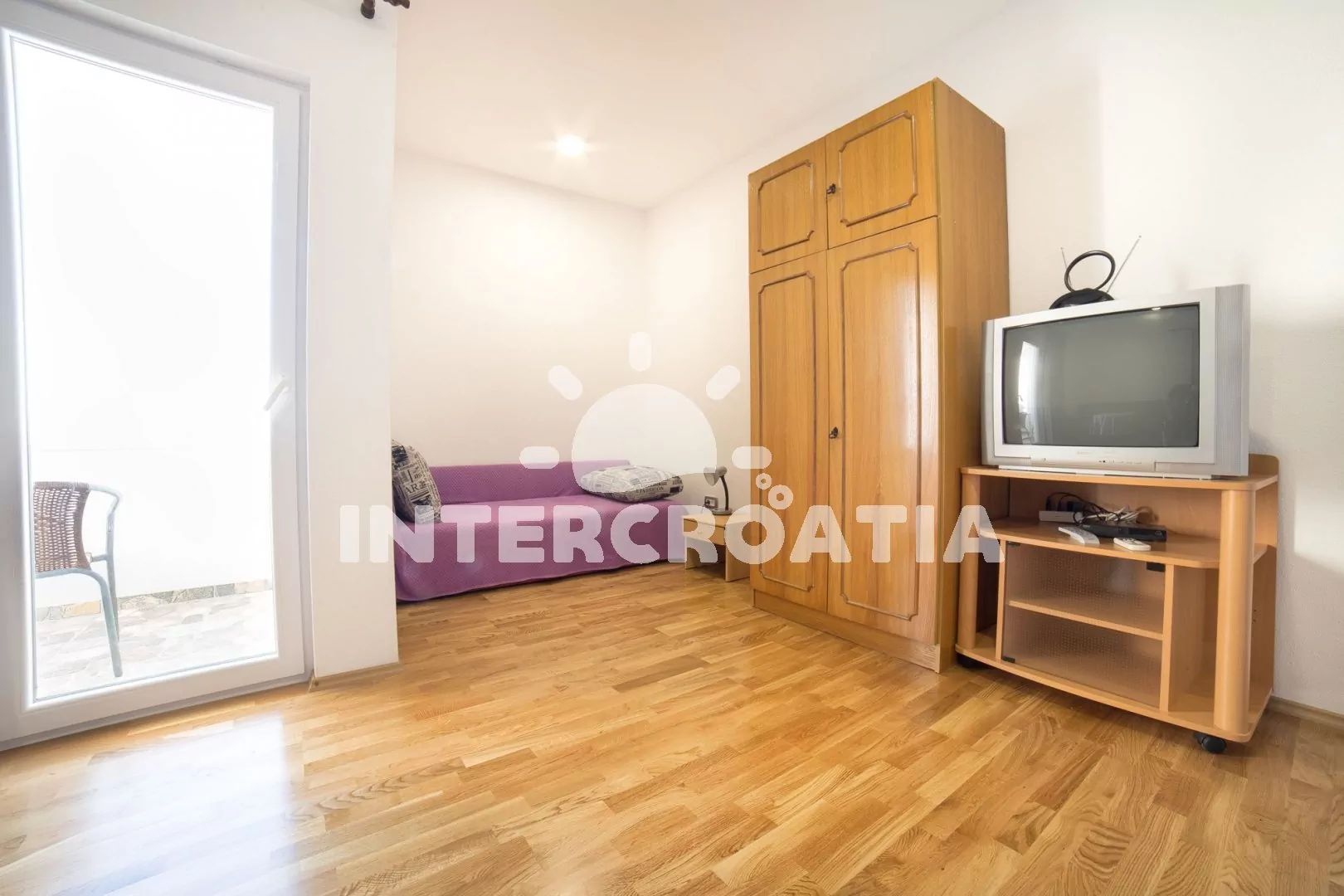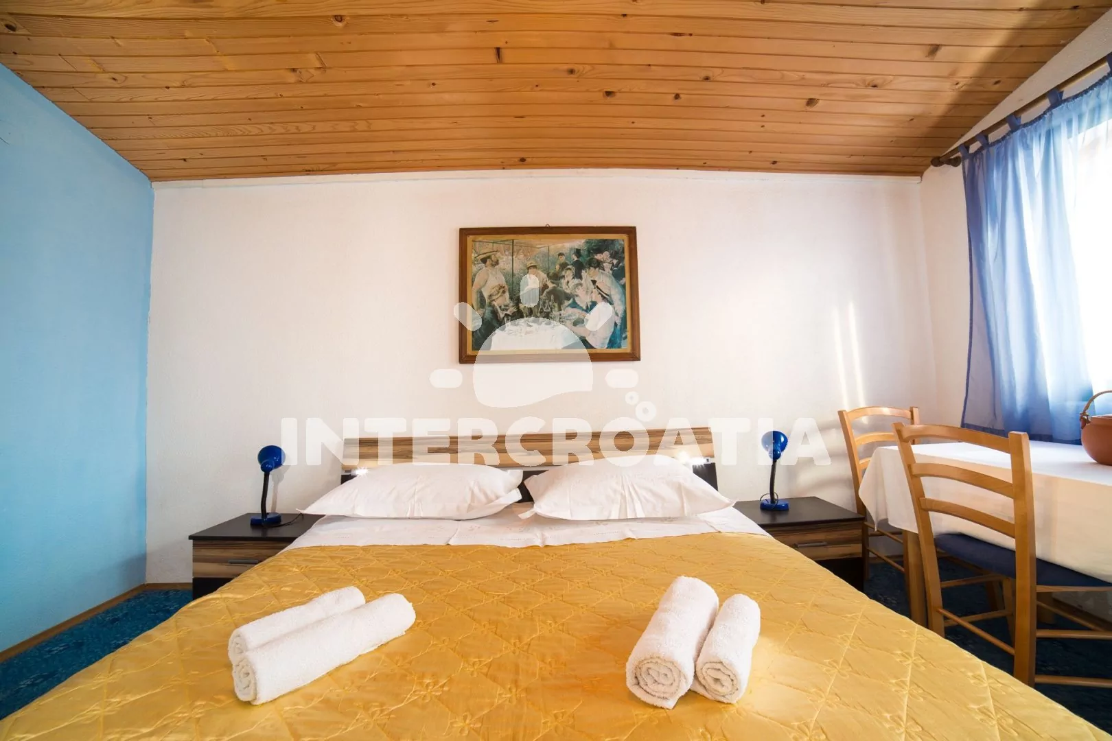 Apartmán až pro 4 osoby (2+2) s terasou a balkonem, nachází se v prvním patře domu. Kuchyňský kout je vybaven pracovní deskou, nádobím, elektrickým sporákem, troubou, kávovarem, rychlovarnou konvicí a lednicí s mrazákem. Obývací pokoj s dvěma rozložitelnými pohovkami (extra lůžka pro dvě osoby), televizí se satelitem a vstupem na balkon. Ložnice s jedním manželským lůžkem a vstupem na terasu. Koupelna se sprchovým koutem, umyvadlem a wc. K dispozici: WiFi, klimatizace, dětská postýlka (služba na požádání), terasa, balkon s posezením a výhledem na moře.