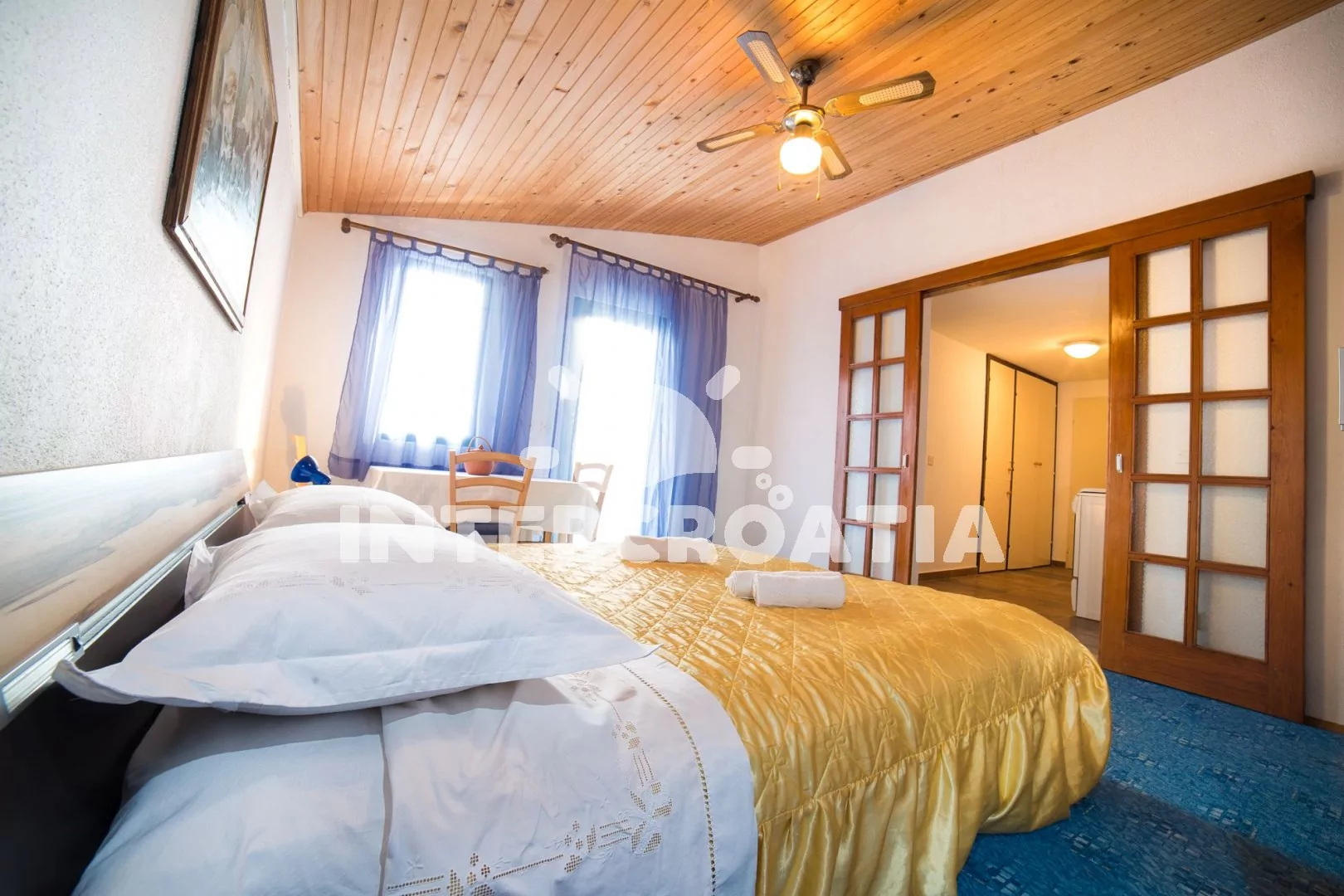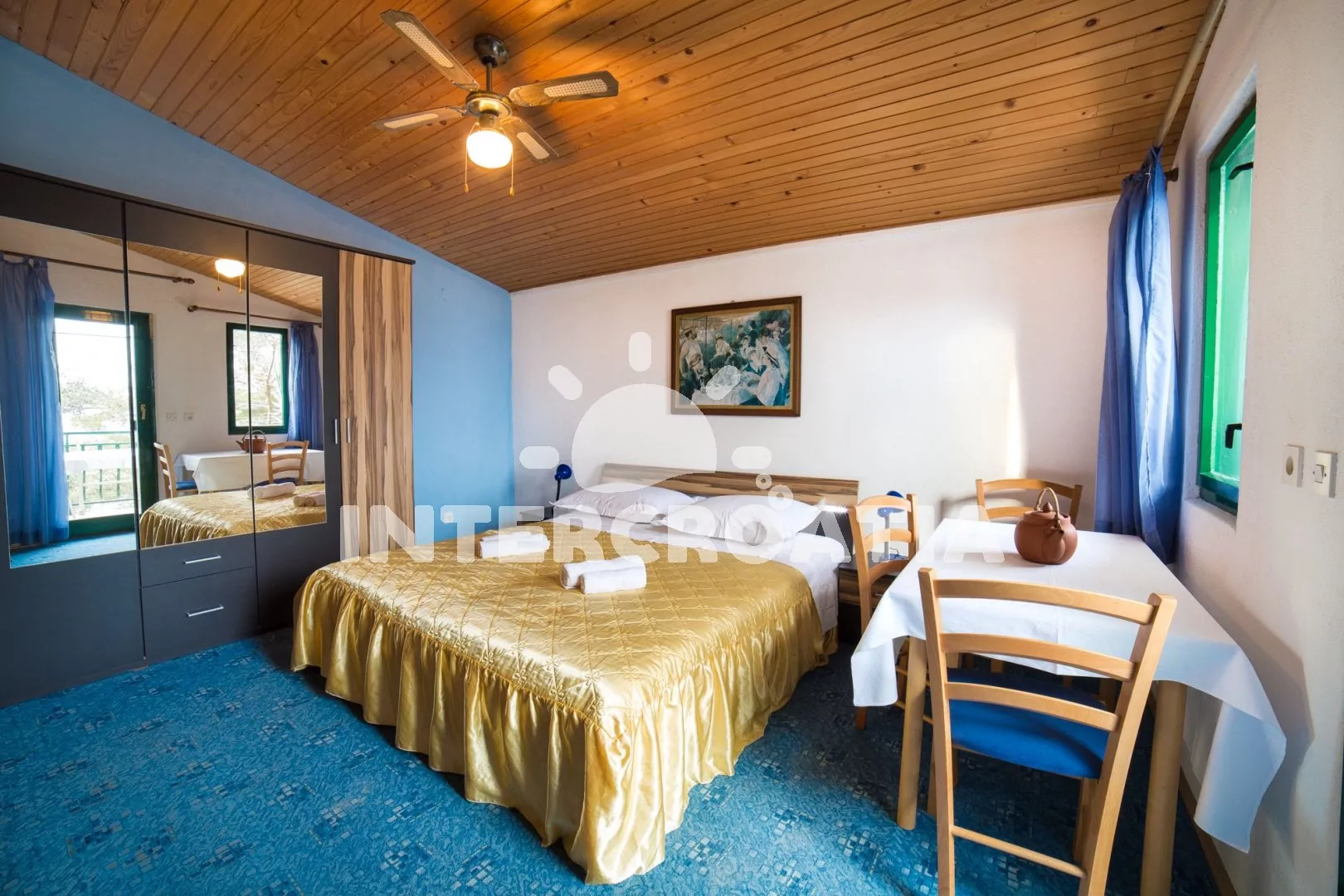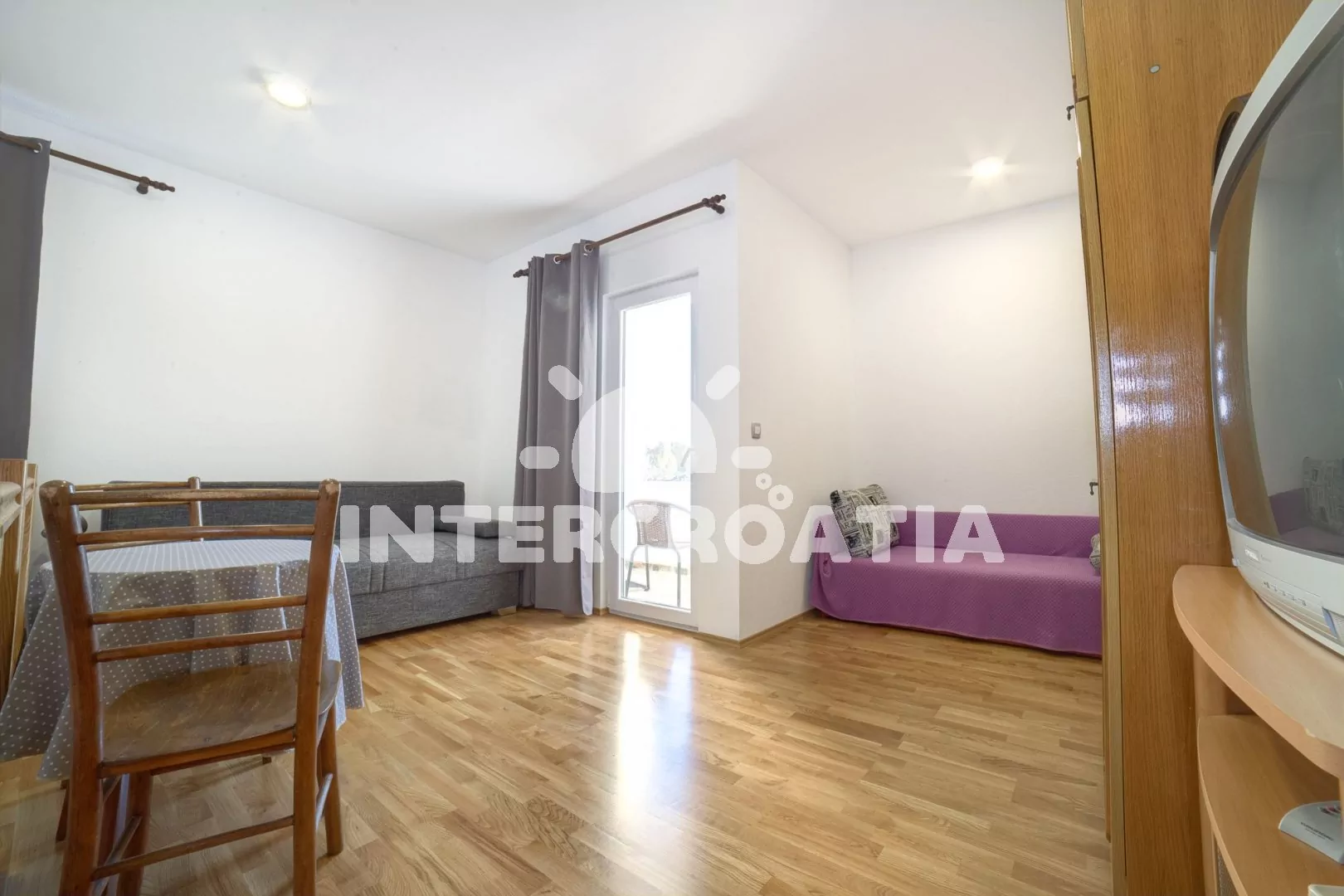 Apartmán až pro 4 osoby (2+2) s terasou a balkonem, nachází se v prvním patře domu. Kuchyňský kout je vybaven pracovní deskou, nádobím, elektrickým sporákem, troubou, kávovarem, rychlovarnou konvicí a lednicí s mrazákem. Obývací pokoj s dvěma rozložitelnými pohovkami (extra lůžka pro dvě osoby), televizí se satelitem a vstupem na balkon. Ložnice s jedním manželským lůžkem a vstupem na terasu. Koupelna se sprchovým koutem, umyvadlem a wc. K dispozici: WiFi, klimatizace, dětská postýlka (služba na požádání), terasa, balkon s posezením a výhledem na moře.