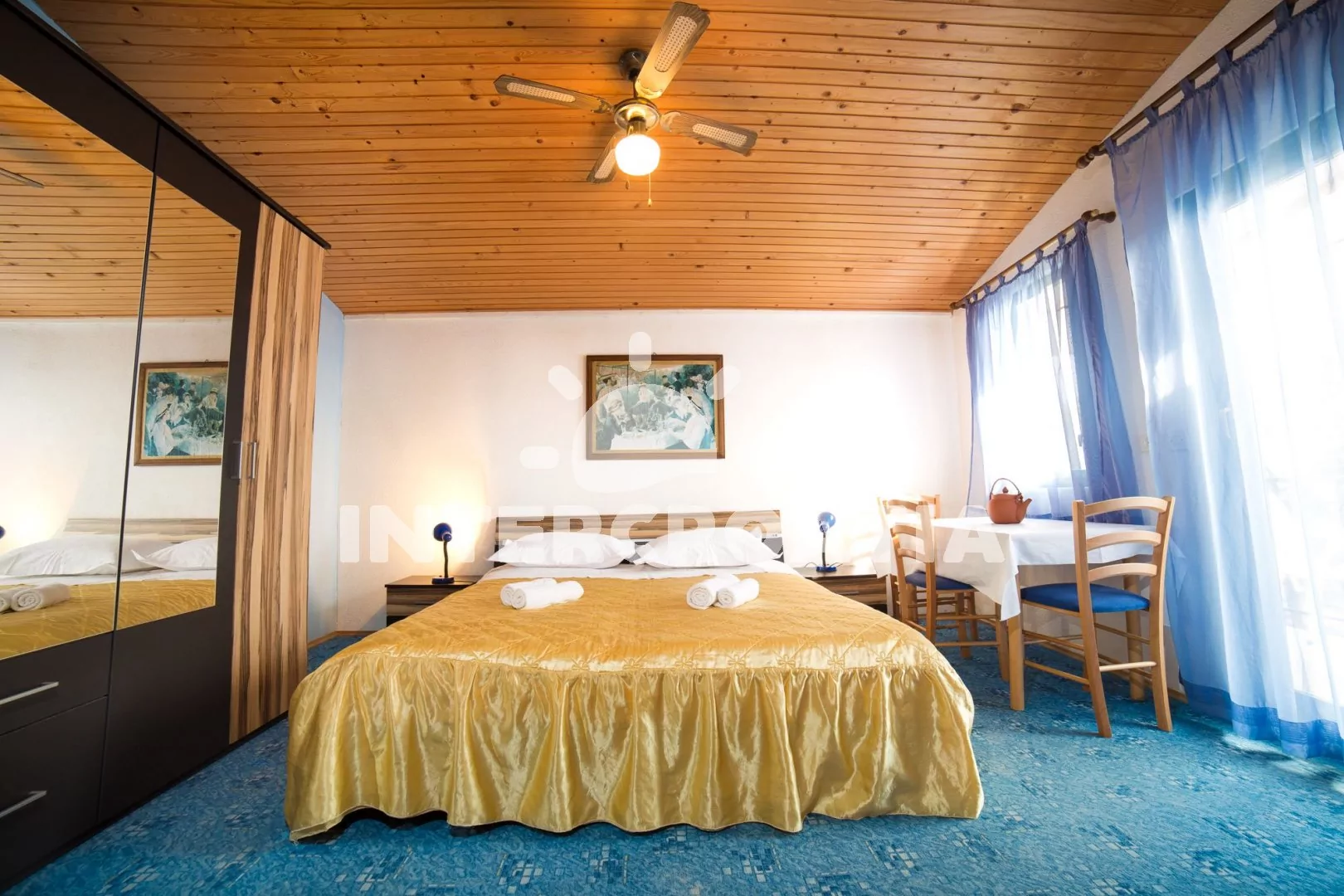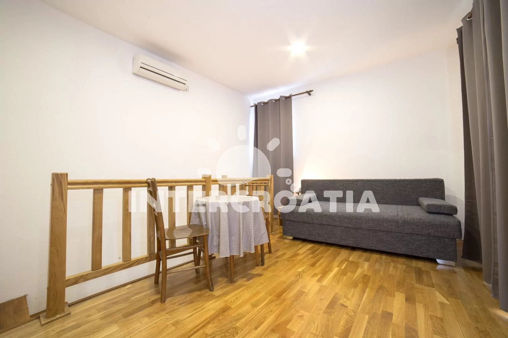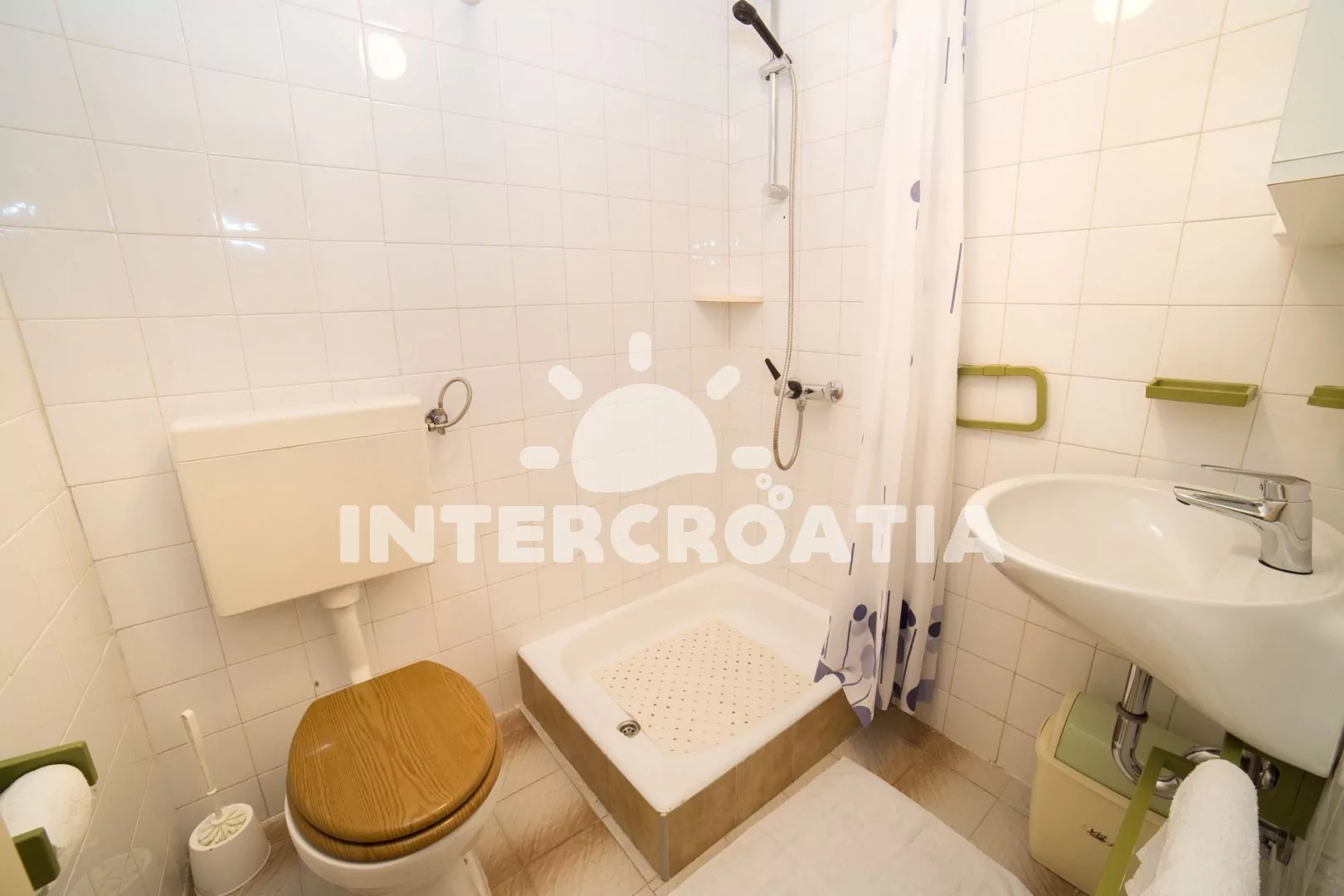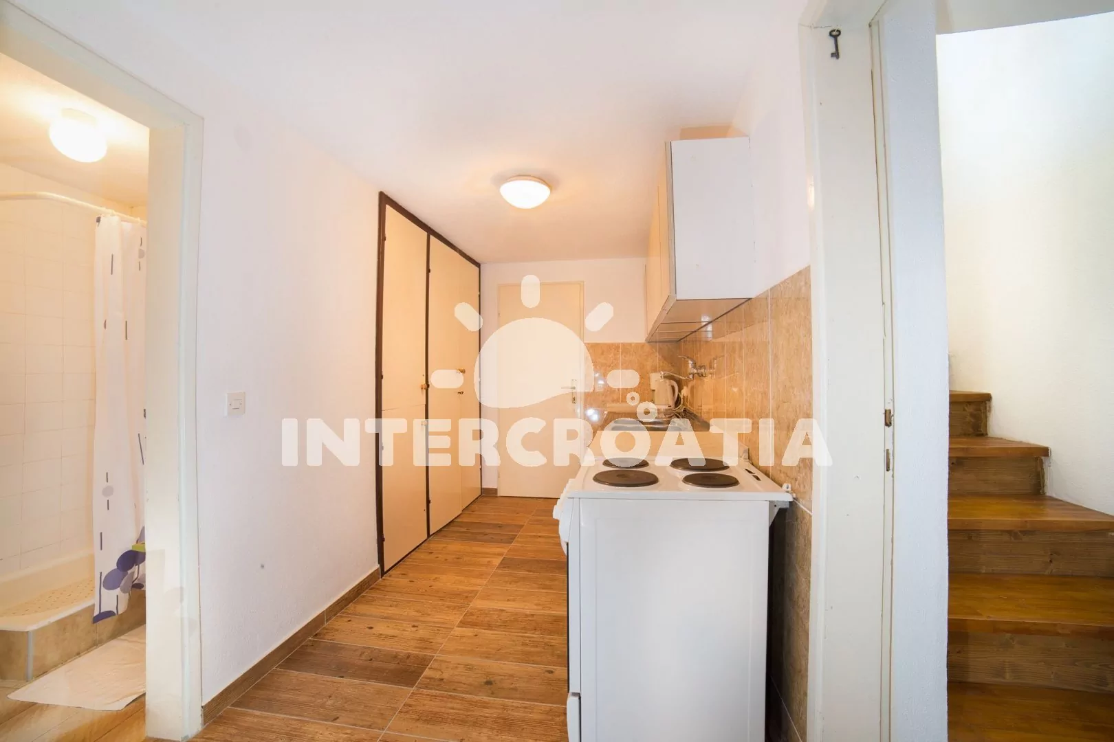 Apartmán až pro 4 osoby (2+2) s terasou a balkonem, nachází se v prvním patře domu. Kuchyňský kout je vybaven pracovní deskou, nádobím, elektrickým sporákem, troubou, kávovarem, rychlovarnou konvicí a lednicí s mrazákem. Obývací pokoj s dvěma rozložitelnými pohovkami (extra lůžka pro dvě osoby), televizí se satelitem a vstupem na balkon. Ložnice s jedním manželským lůžkem a vstupem na terasu. Koupelna se sprchovým koutem, umyvadlem a wc. K dispozici: WiFi, klimatizace, dětská postýlka (služba na požádání), terasa, balkon s posezením a výhledem na moře.