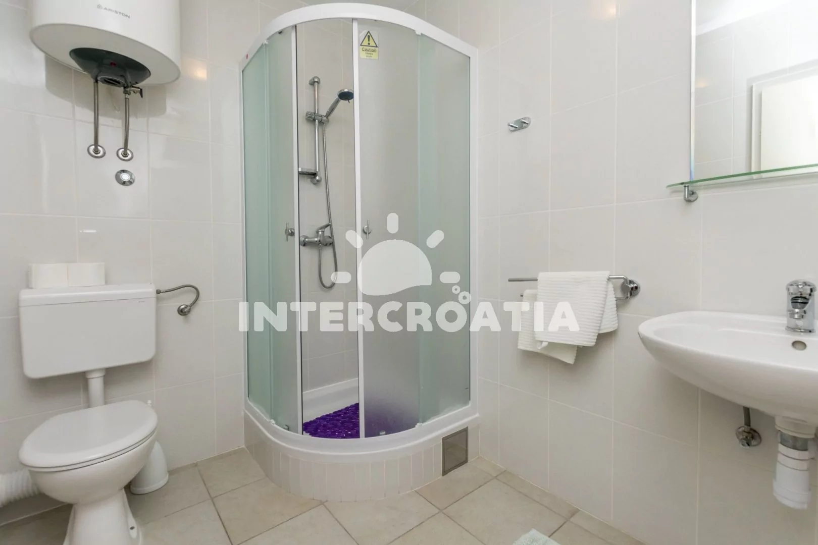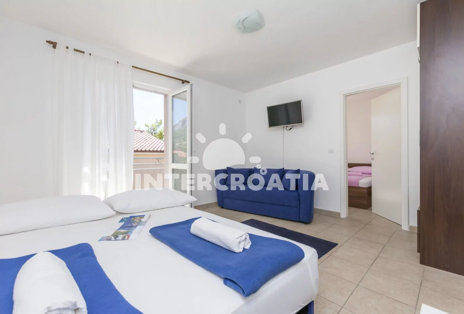 Moderně zařízený apartmán pro 4 osoby se nachází v prvním patře domu. Kuchyň je vybavena kuchyňskou linkou, nádobím, sporákem, horkovzdušnou troubou, kávovarem, rychlovarnou konvicí, chladničkou s mrazákem a jídelním stolem. Obývací pokoj s pohovkou, televizí se satelitním programem a lůžkem pro 2 osoby. Ložnice s jedním manželským dvoulůžkem a vstupem na balkon. Koupelna se sprchovým koutem, umyvadlem a wc. K dispozici: klimatizace, WiFi, radio a venkovní posezení.