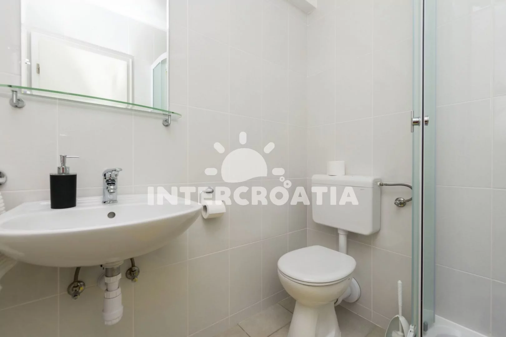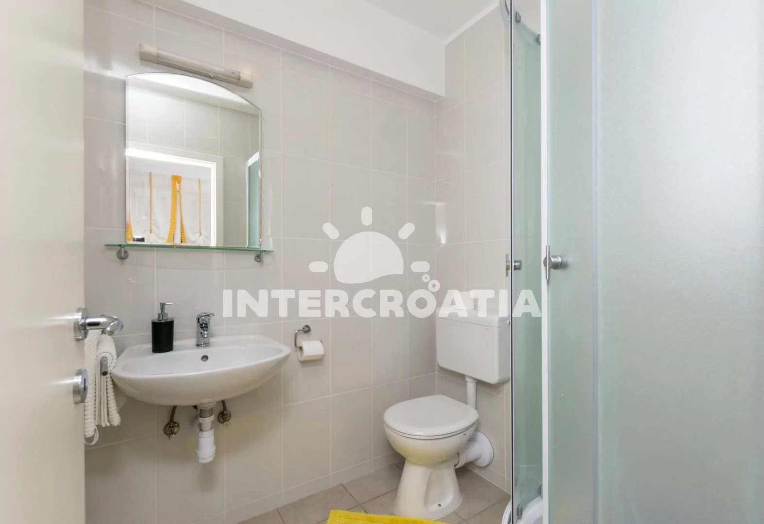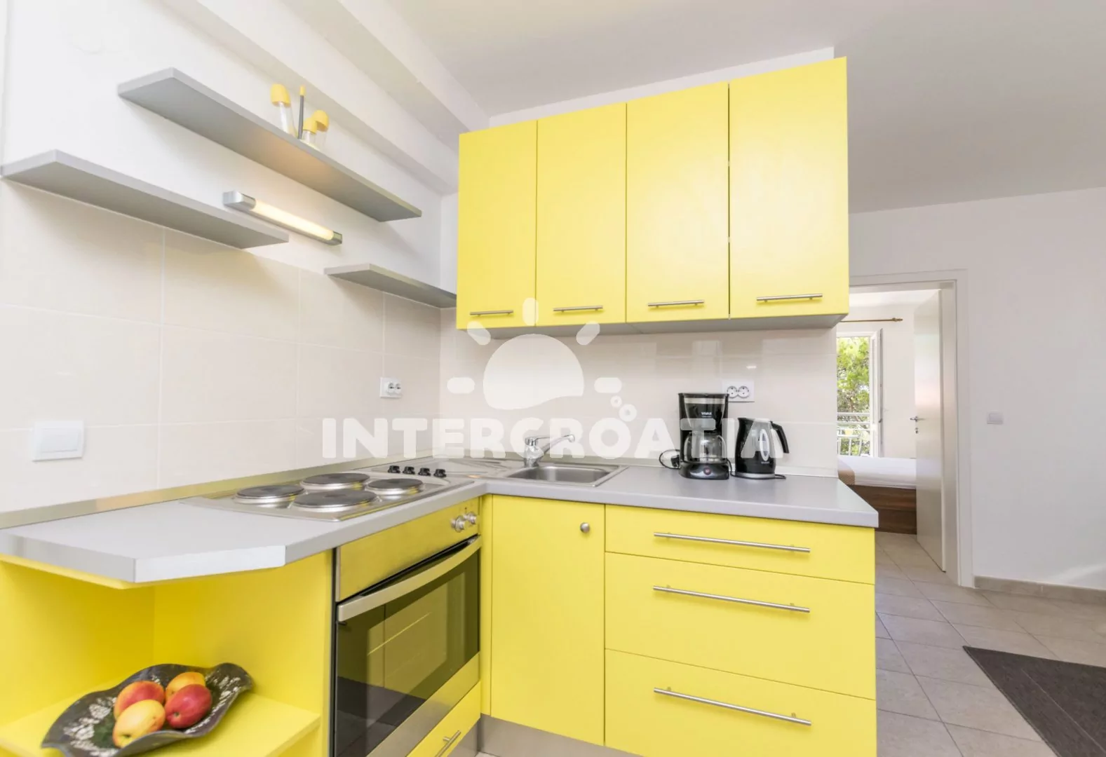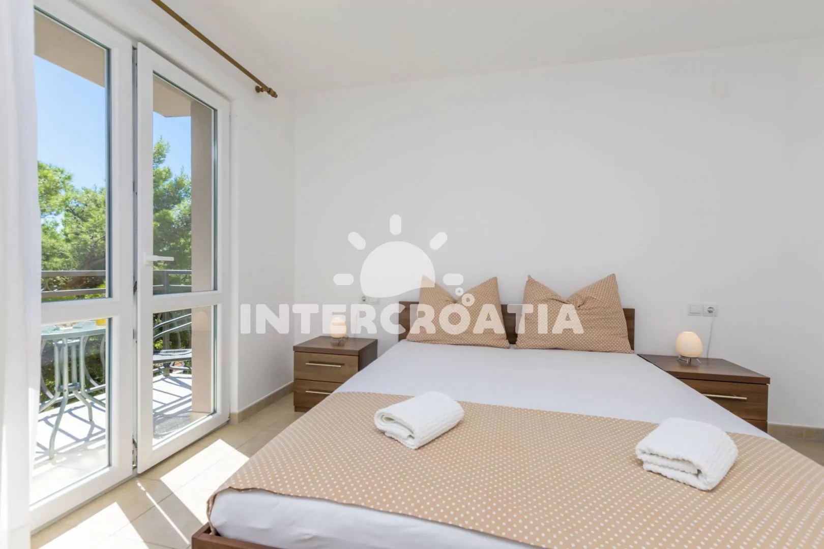Apartmán s moderním zařízením pro 4 osoby se nachází v prvním patře domu. Kuchyň je vybavena kuchyňskou linkou, nádobím, sporákem, horkovzdušnou troubou, kávovarem, rychlovarnou konvicí, chladničkou s mrazákem a jídelním stolem. Ložnice s jedním manželským dvoulůžkem, jedním jednolůžkem, televizí se satelitním programem a vstupem na balkon. Koupelna se sprchovým koutem, umyvadlem a wc. K dispozici: klimatizace, WiFi, radio a venkovní posezení.
