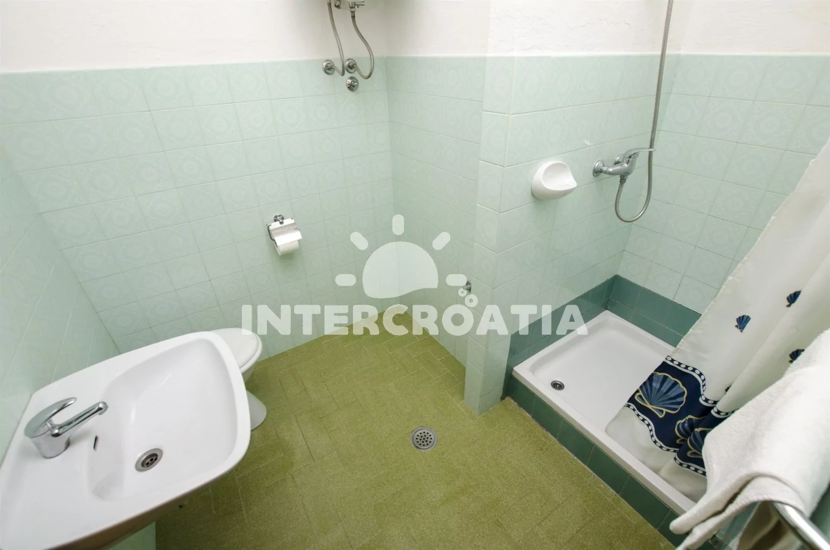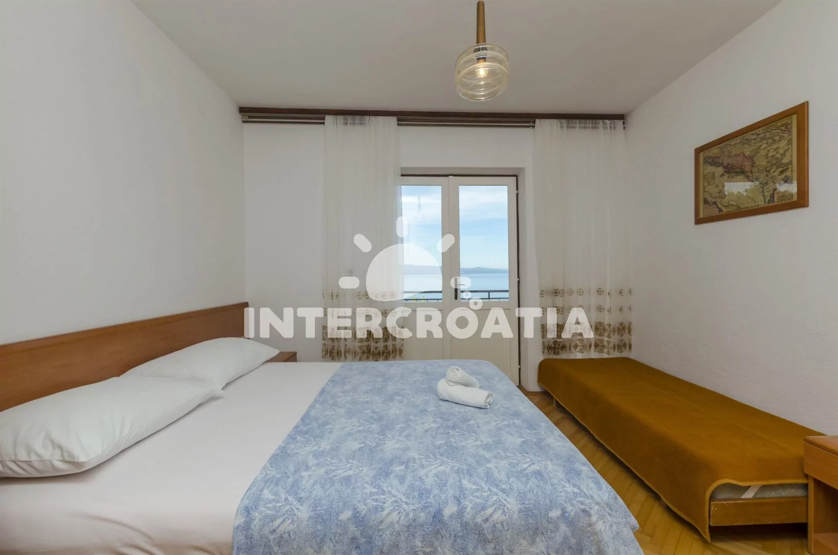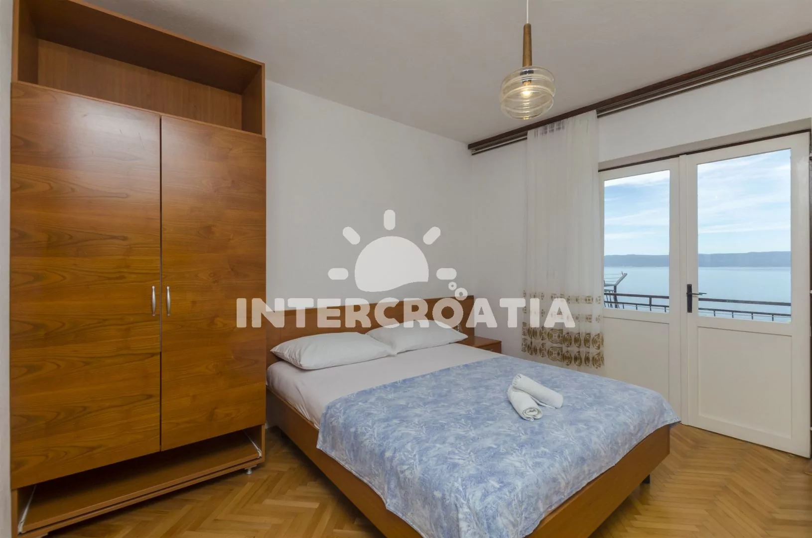 Velký apartmán (120 m2) s výhledem na moře, vlastní terasou, čtyřmi ložnicemi a čtyřmi koupelnami se nachází v prvním patře domu. Obývací pokoj je spojený s kuchyní. Kuchyňská linka je vybavena sporákem, digestoří, vestavěnou troubou, rychlovarnou konvicí, mikrovlnnou troubou, kávovarem, nádobím a lednicí s mrazákem. Obývací pokoj s jídelním stolem pro 7 osob, televizí, klimatizací a vstupem na terasu. První i druhá ložnice je vybavena jedním dvoulůžkem a vlastní koupelnou. Třetí a čtvrtá ložnice je vybavena vždy s dvoulůžkem, jedním jednolůžkem a vlastní koupelnou. Tři koupelny s vanou, sprchovou zástěnou, umyvadlem a wc. Čtvrtá koupelna se sprchovým koutem, umyvadlem a wc. Hostům je k dispozici parkování 50 až 150 m od objektu.