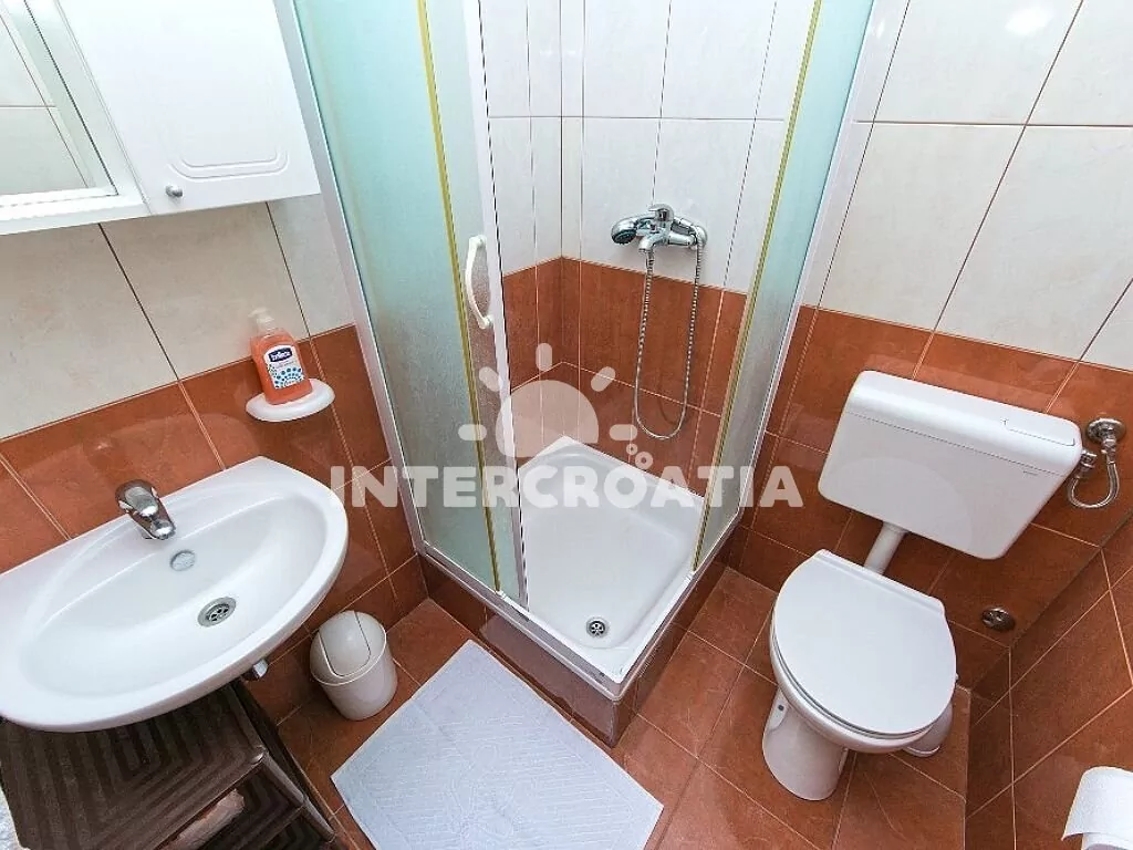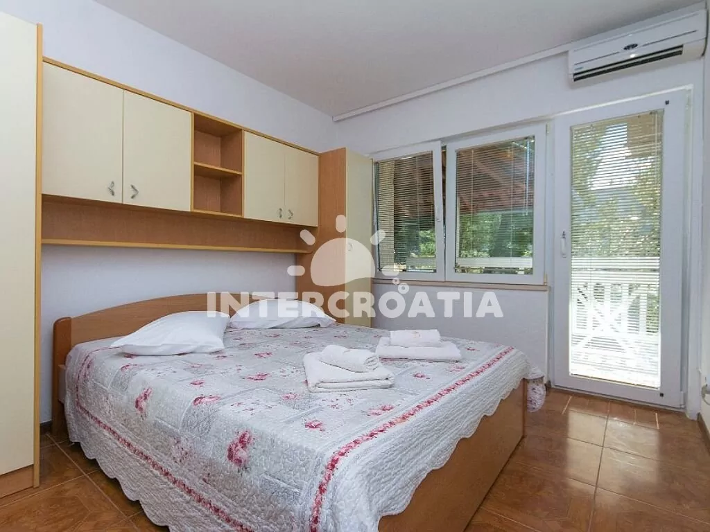 Apartmán (80 m2), s vlastní terasou, posezením, výhledem na moře a do dvora se nachází v 1. patře domu. Apartmán má 2 ložnice a je vhodný pro 4 osoby. Kuchyň se vstupem na terasu, klimatizací, kuchyňskou linkou s dvouplotýnkovým vařičem, rychlovarnou konvicí, mikrovlnnou troubou, kávovarem, nádobím a lednicí s mrazákem. První ložnice s dvoulůžkem, klimatizací a vstupem na terasu. Druhá ložnice s dvoulůžkem, televizí a vstupem na terasu. První koupelna se sprchovým koutem, umyvadlem, fénem a wc. Druhá koupelna s vanou, sprchovou zástěnou, umyvadlem a wc. Hostům je k dispozici parkování u objektu zdarma.
