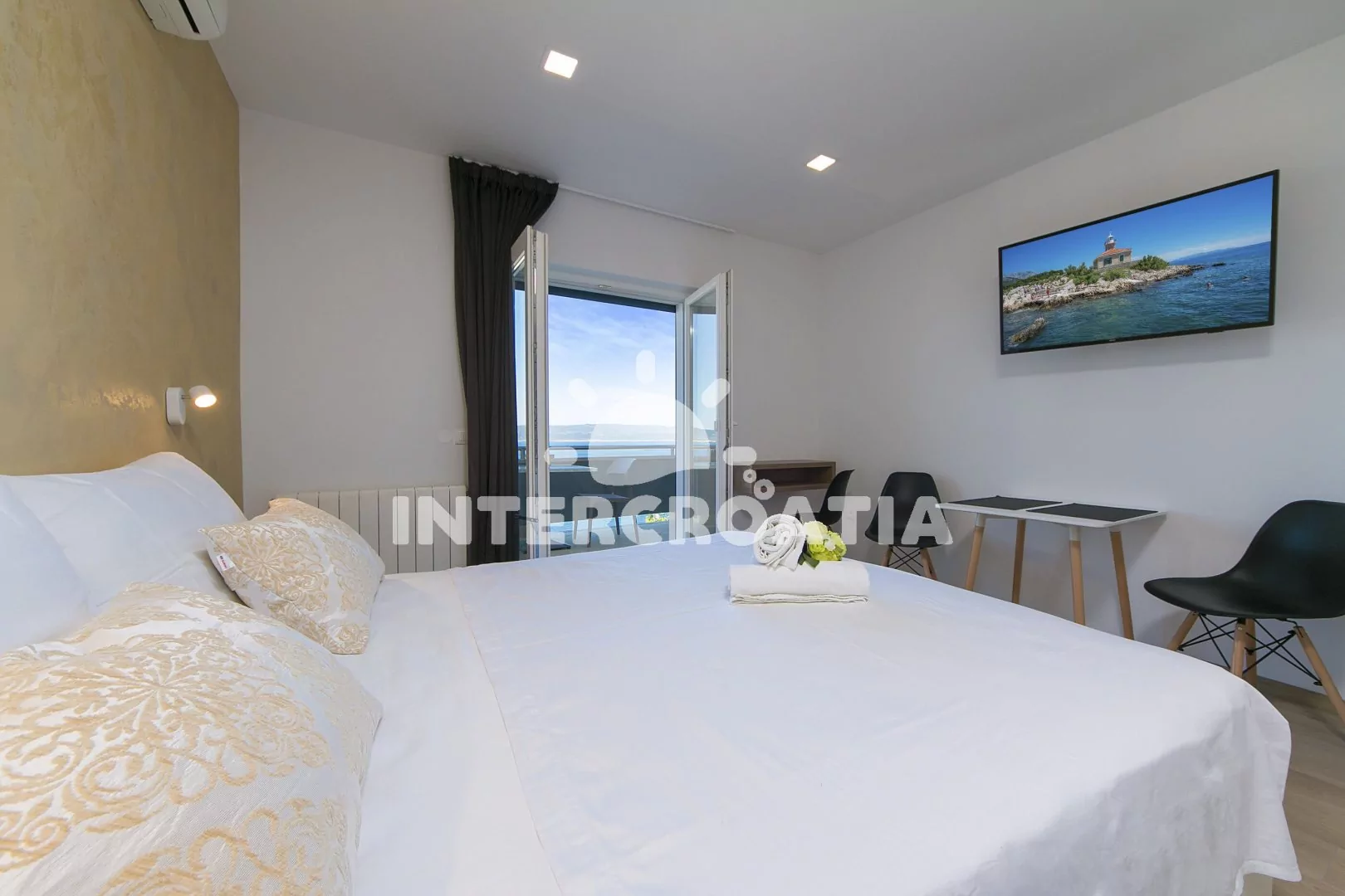 Apartmán (23 m2) typu studio s balkonem, posezením a výhledem na moře se nachází v 1. patře domu. Obývací místnost je spojena s kuchyní. Kuchyňská linka je vybavena dvouplotýnkovým vařičem, digestoří, rychlovarnou konvicí, kávovarem, toustovačem, nádobím a lednicí s mrazákem. Obývací místnost s jídelním stolem, televizí, dvoulůžkem, jedním jednolůžkem, klimatizací a vstupem na balkon. Koupelna se sprchovým koutem, umyvadlem, fénem a wc. Hostům je k dispozici parkování u objektu zdarma.