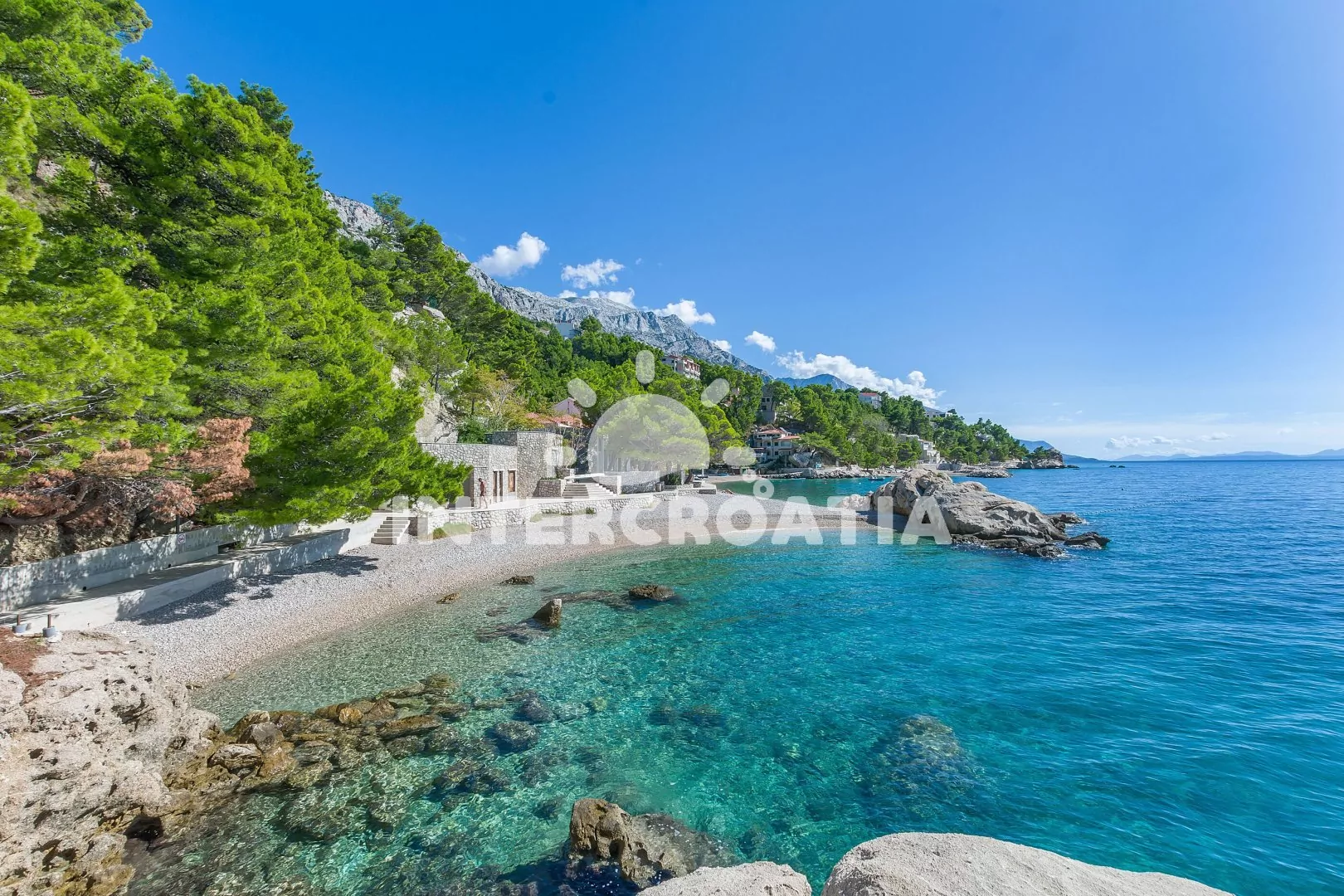 Vzdálenosti: Moře a pláž 420 m, restaurace a bar 300 m, půjčovna motorových člunů 800 m, potápění 1 km, obchod, centrum, veřejná doprava, lékárna, směnárna, tenisové kurty, mini golf, přístav, banka a pošta 3 km, ambulance 4 km, čerpací stanice 10 km, diskotéka 15 km, přístav (Makarska) 15 km, letiště (Split) 65 km.