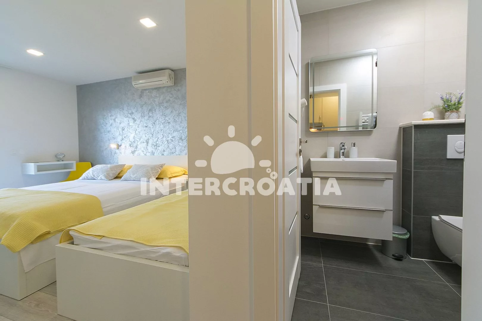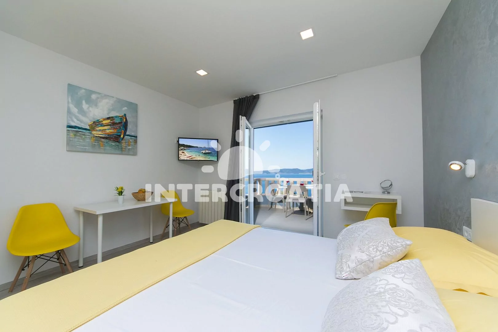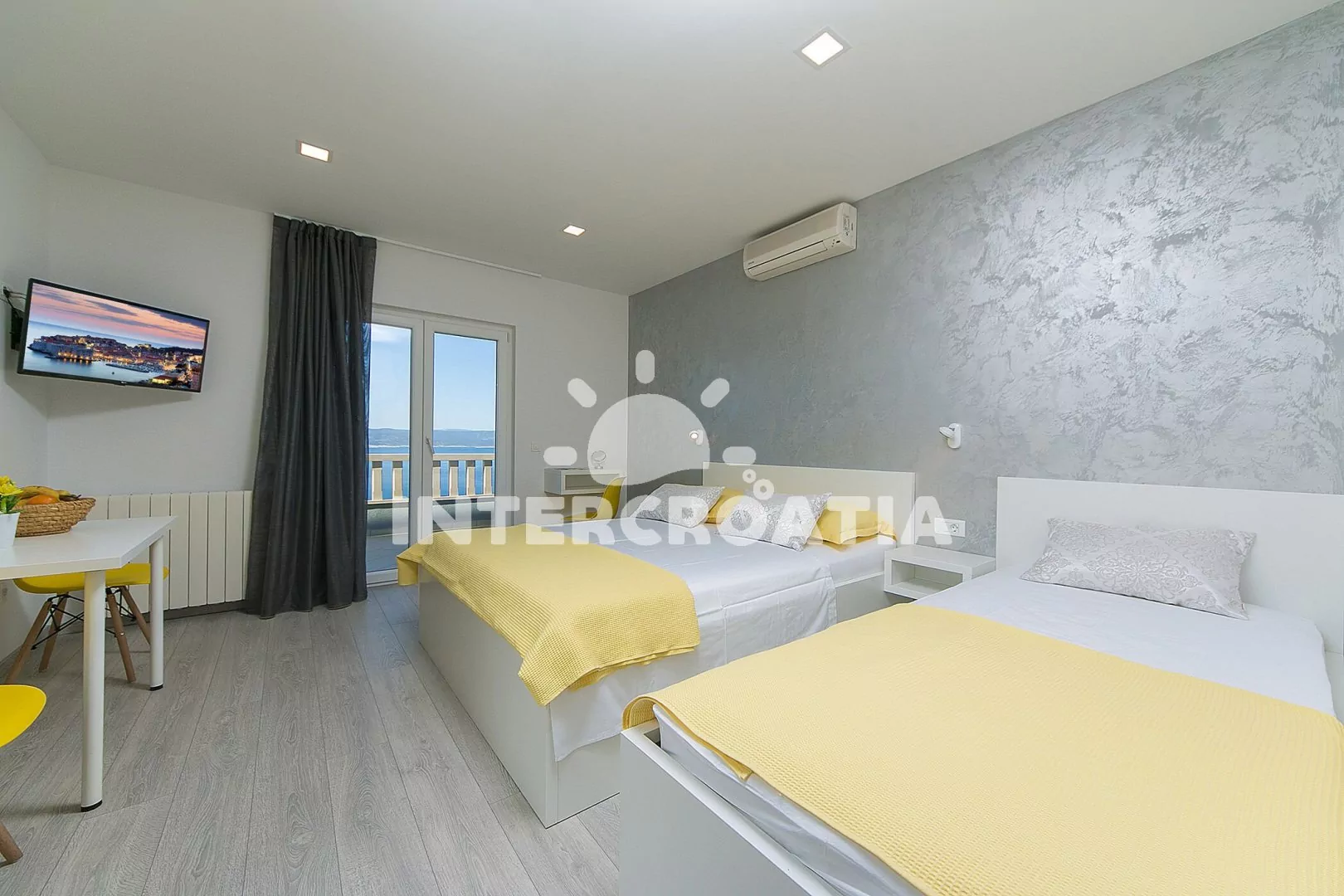 Apartmán (23 m2) typu studio s terasou, posezením a výhledem na moře se nachází v 1. patře domu. Obývací místnost je spojena s kuchyní. Kuchyňská linka je vybavena dvouplotýnkovým vařičem, digestoří, rychlovarnou konvicí, kávovarem, toustovačem, nádobím a lednicí s mrazákem. Obývací místnost s jídelním stolem, televizí, dvoulůžkem, jedním jednolůžkem, klimatizací a vstupem na balkon. Koupelna se sprchovým koutem, umyvadlem, fénem a wc. Hostům je k dispozici parkování u objektu zdarma.