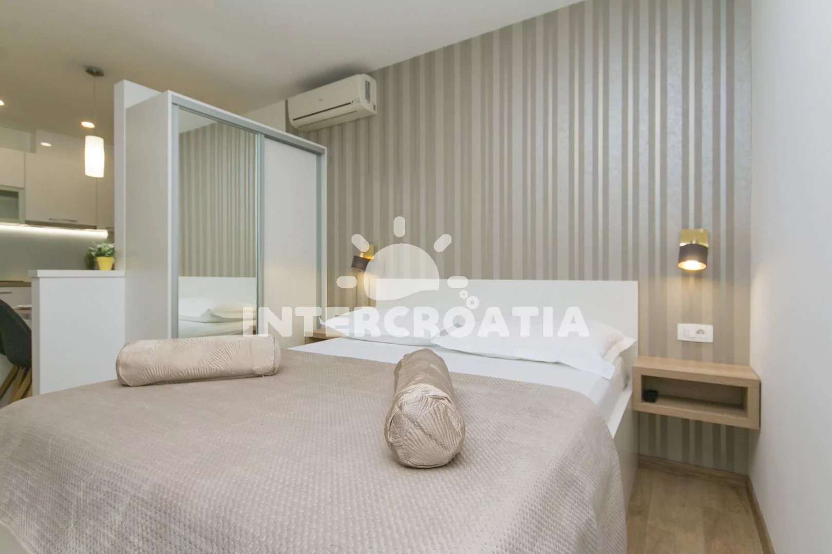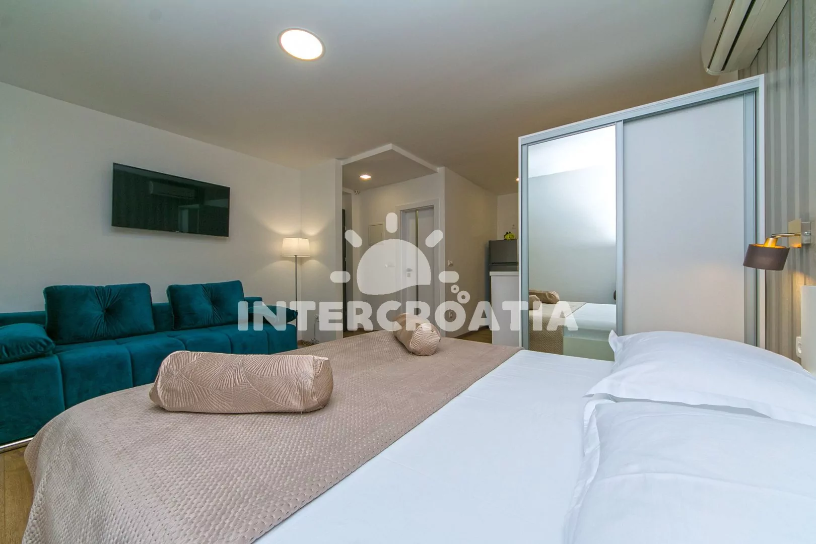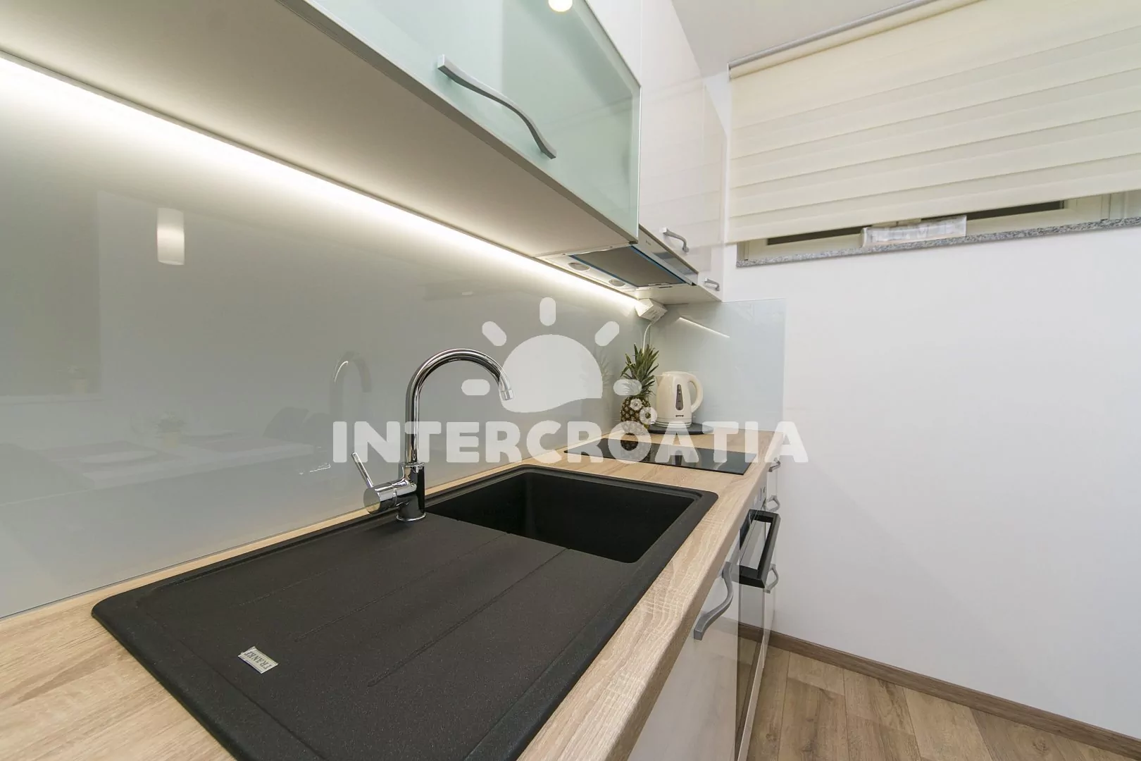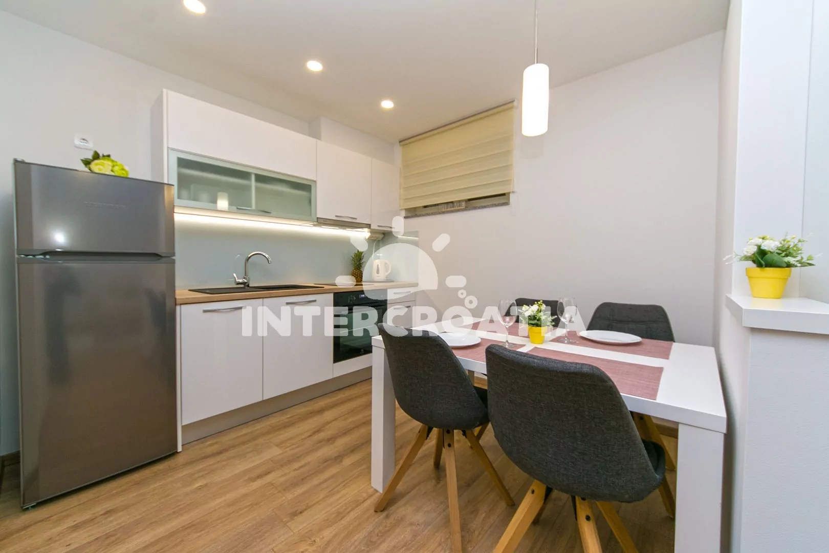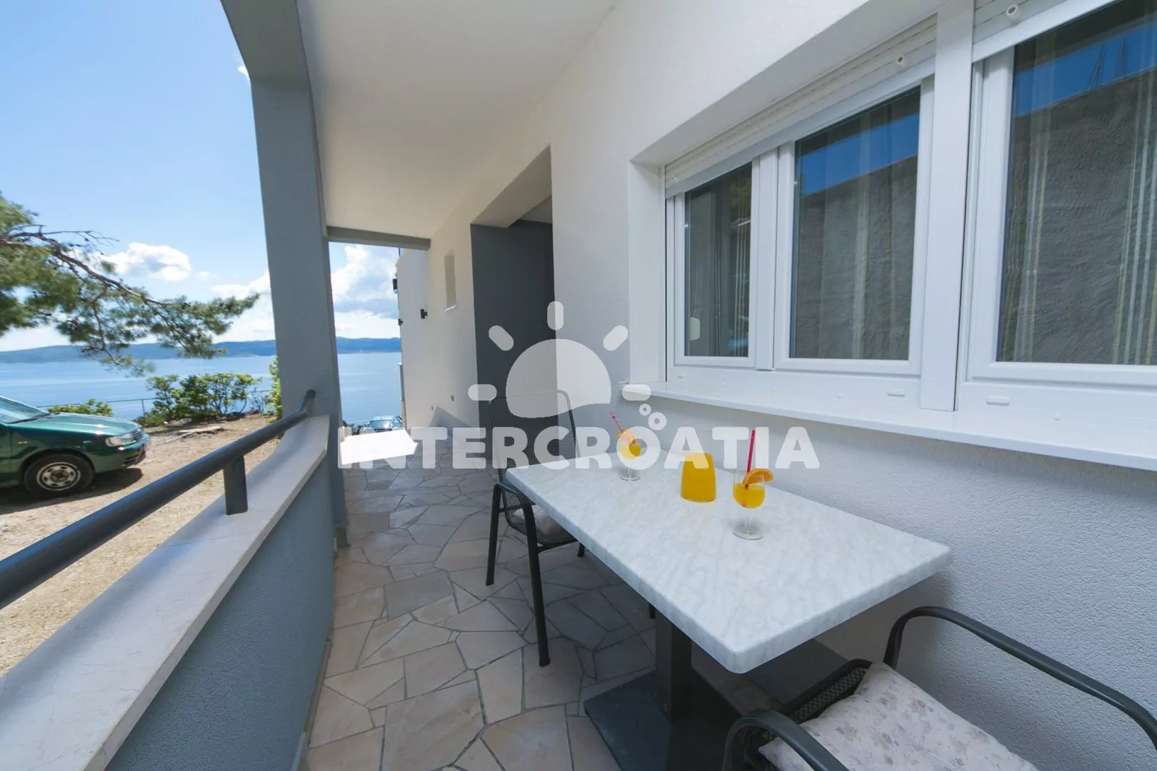 Apartmán (30 m2) typu studio s balkonem, posezením a bočním výhledem na moře se nachází v 1. patře domu. Obývací místnost je spojena s kuchyní. Kuchyňská linka je vybavena dvouplotýnkovým vařičem, digestoří, vestavěnou troubou, myčkou na nádobí, rychlovarnou konvicí, kávovarem, toustovačem, mikrovlnnou troubou, nádobím a lednicí s mrazákem. Obývací místnost s jídelním stolem, televizí, pohovkou (rozložitelná na extra lůžko pro 1 sobu), dvoulůžkem, klimatizací a vstupem na balkon. Koupelna se sprchovým koutem, umyvadlem, fénem a wc. Hostům je k dispozici parkování u objektu zdarma.