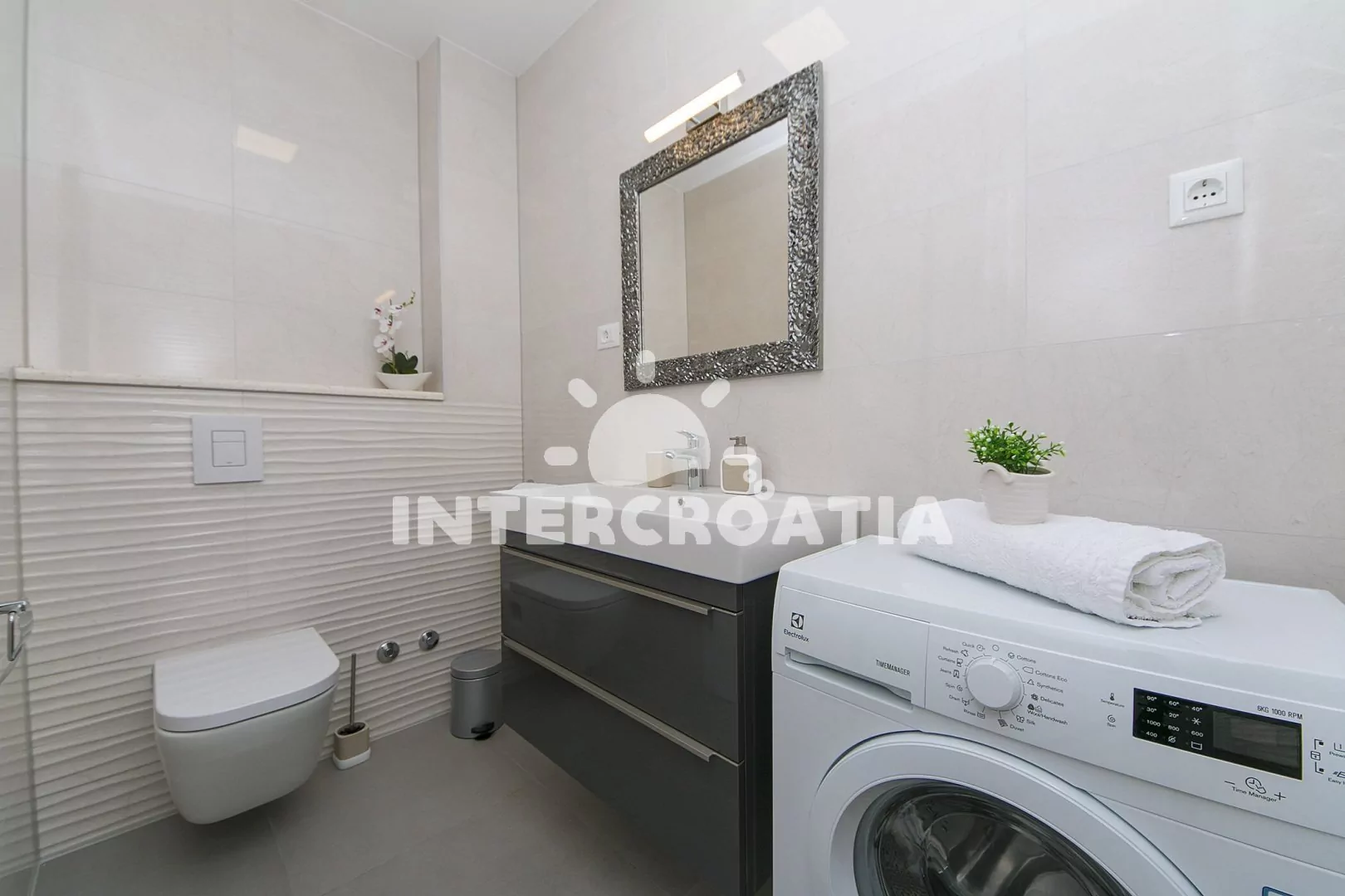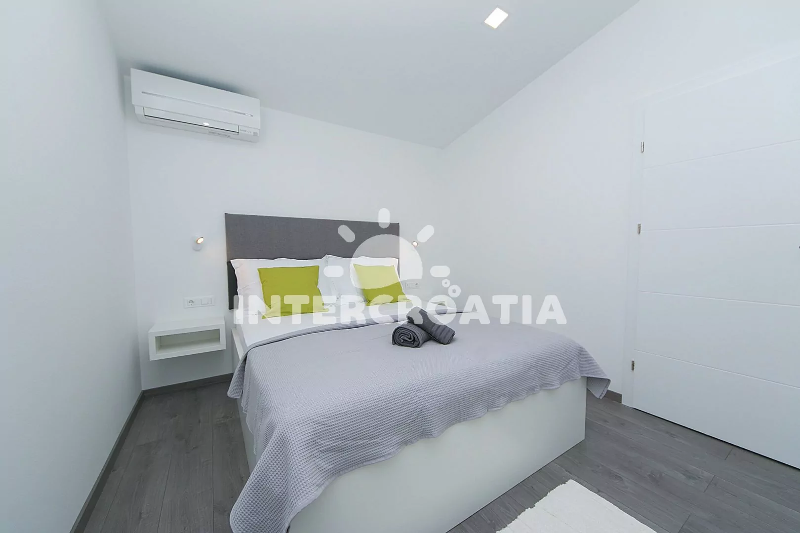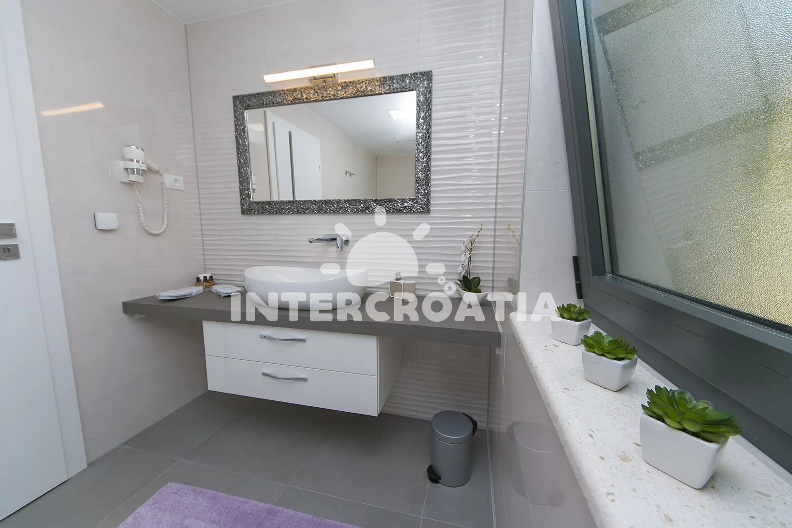 Luxusní apartmán (90 m2) s terasou, vířivkou, posezením a výhledem na moře se nachází ve 2. patře domu. Apartmán má 2 ložnice a je vhodný pro 4 až 5 osob. Obývací pokoj je spojený s kuchyní. Kuchyňská linka je vybavena sklokeramickou varnou deskou, digestoří, vestavěnou troubou, myčkou na nádobí, rychlovarnou konvicí, kávovarem, toustovačem, mikrovlnnou troubou, nádobím a lednicí s mrazákem. Obývací pokoj s jídelním stolem, televizí, pohovkou (rozložitelná na extra lůžko pro 1 sobu), klimatizací a vstupem na terasu. První i druhá ložnice je vybavena vždy s jedním dvoulůžkem, klimatizací a vstupem na terasu. Koupelna se sprchovým koutem, umyvadlem, fénem, pračkou a wc. Dále samostatné wc s umyvadlem. Hostům je k dispozici parkování u objektu zdarma. Dále sejf, dětská postýlka a žehlička.