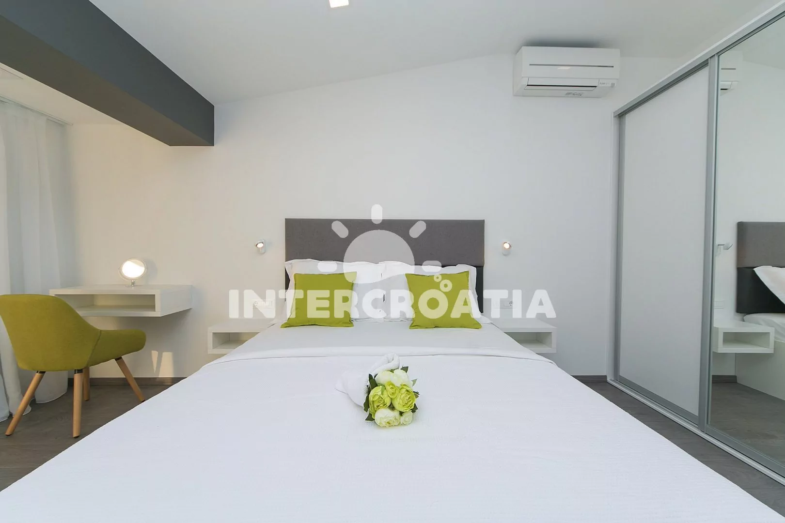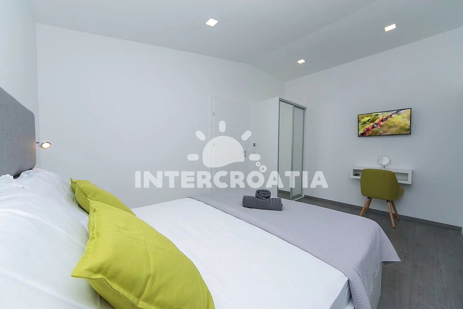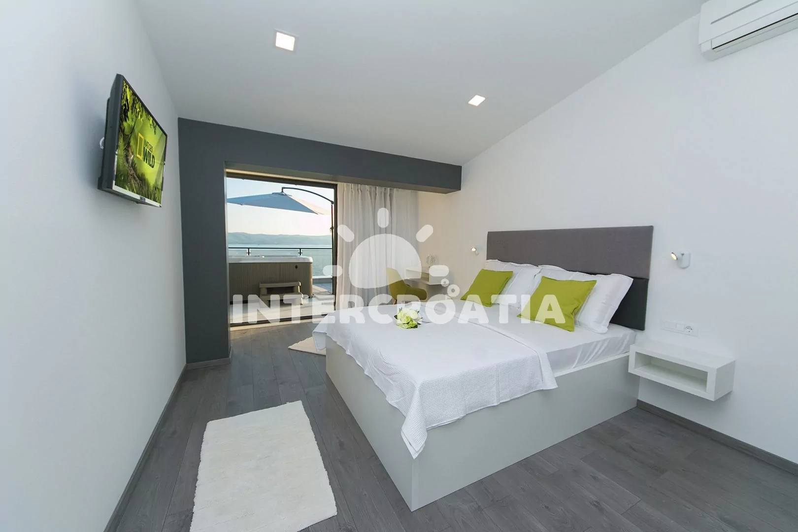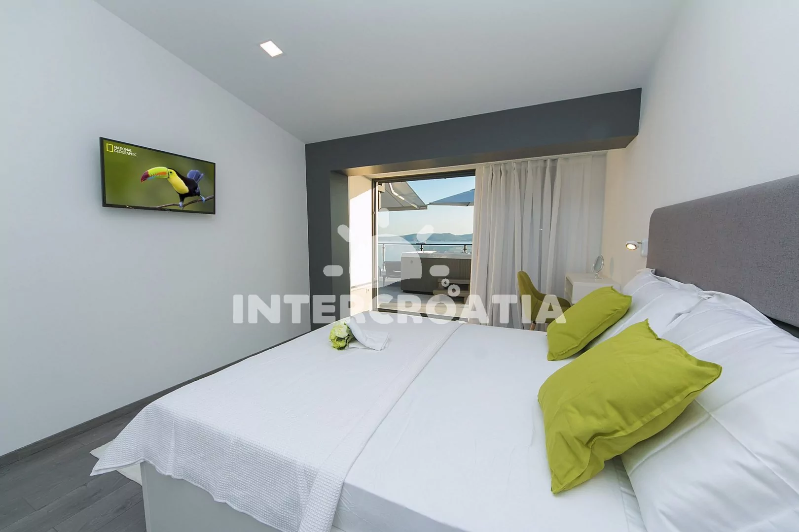Luxusní apartmán (90 m2) s terasou, vířivkou, posezením a výhledem na moře se nachází ve 2. patře domu. Apartmán má 2 ložnice a je vhodný pro 4 až 5 osob. Obývací pokoj je spojený s kuchyní.…