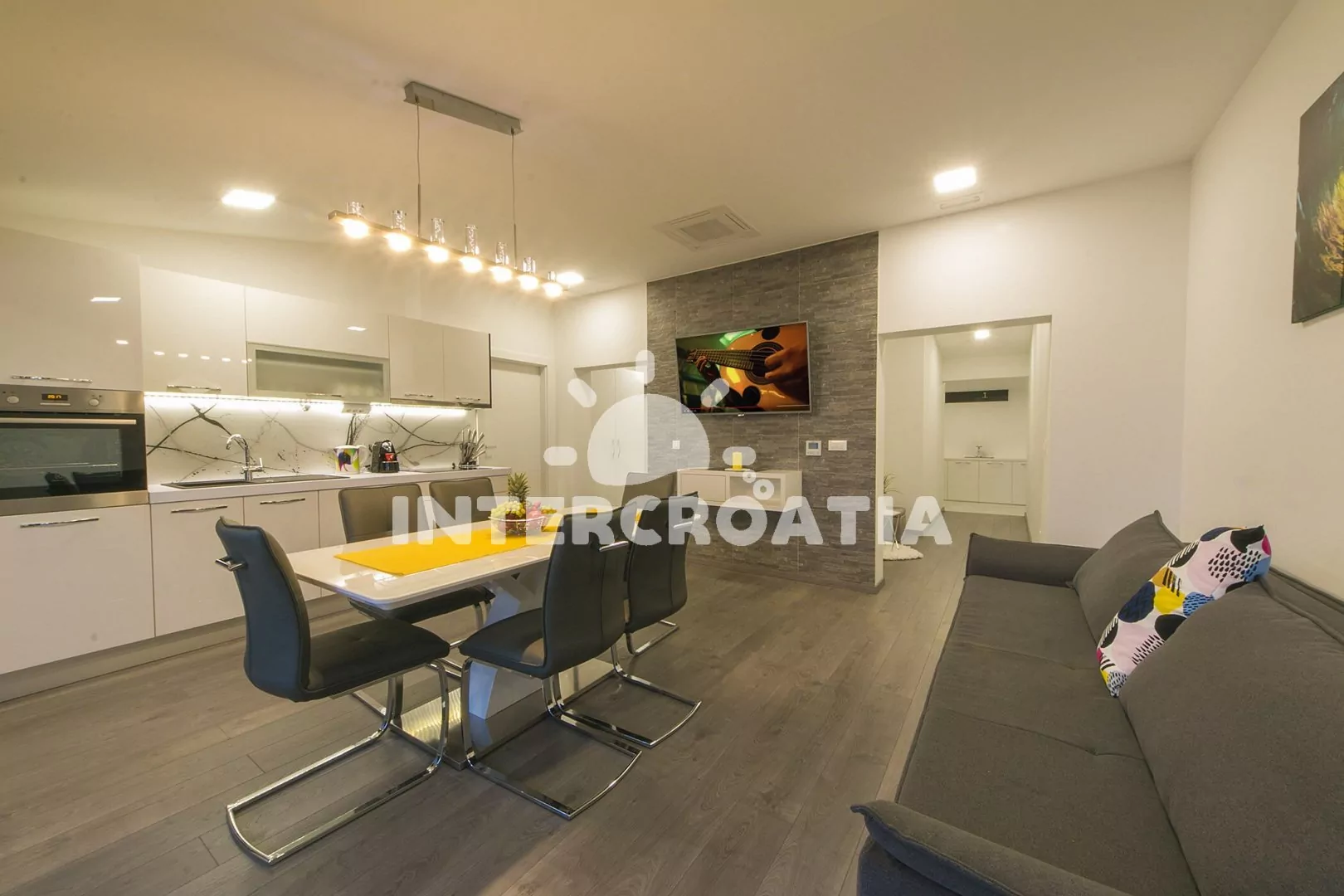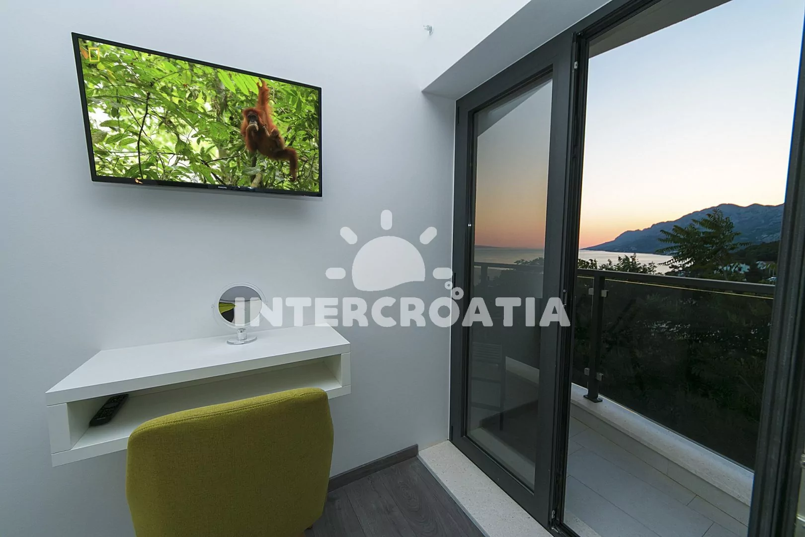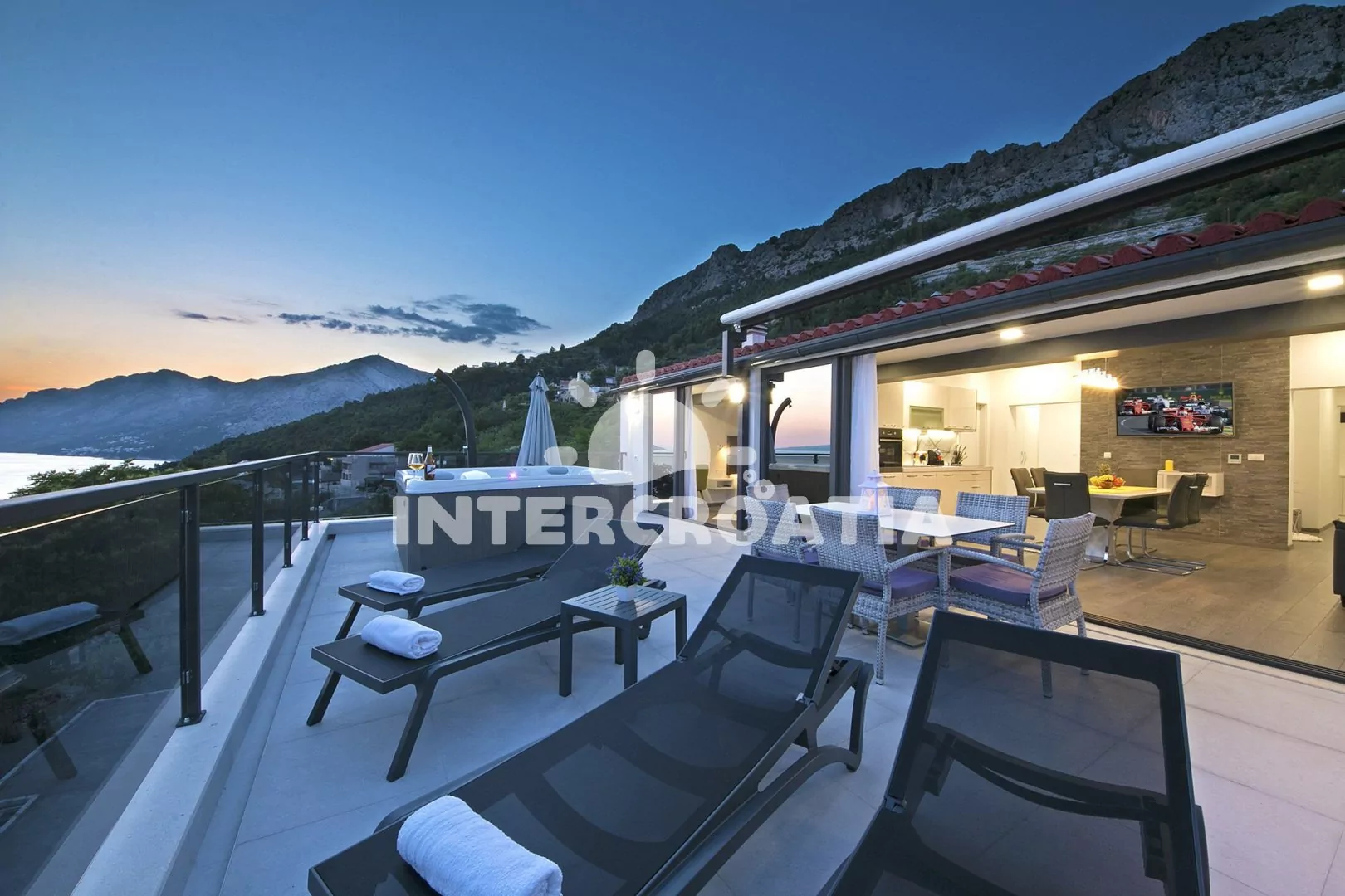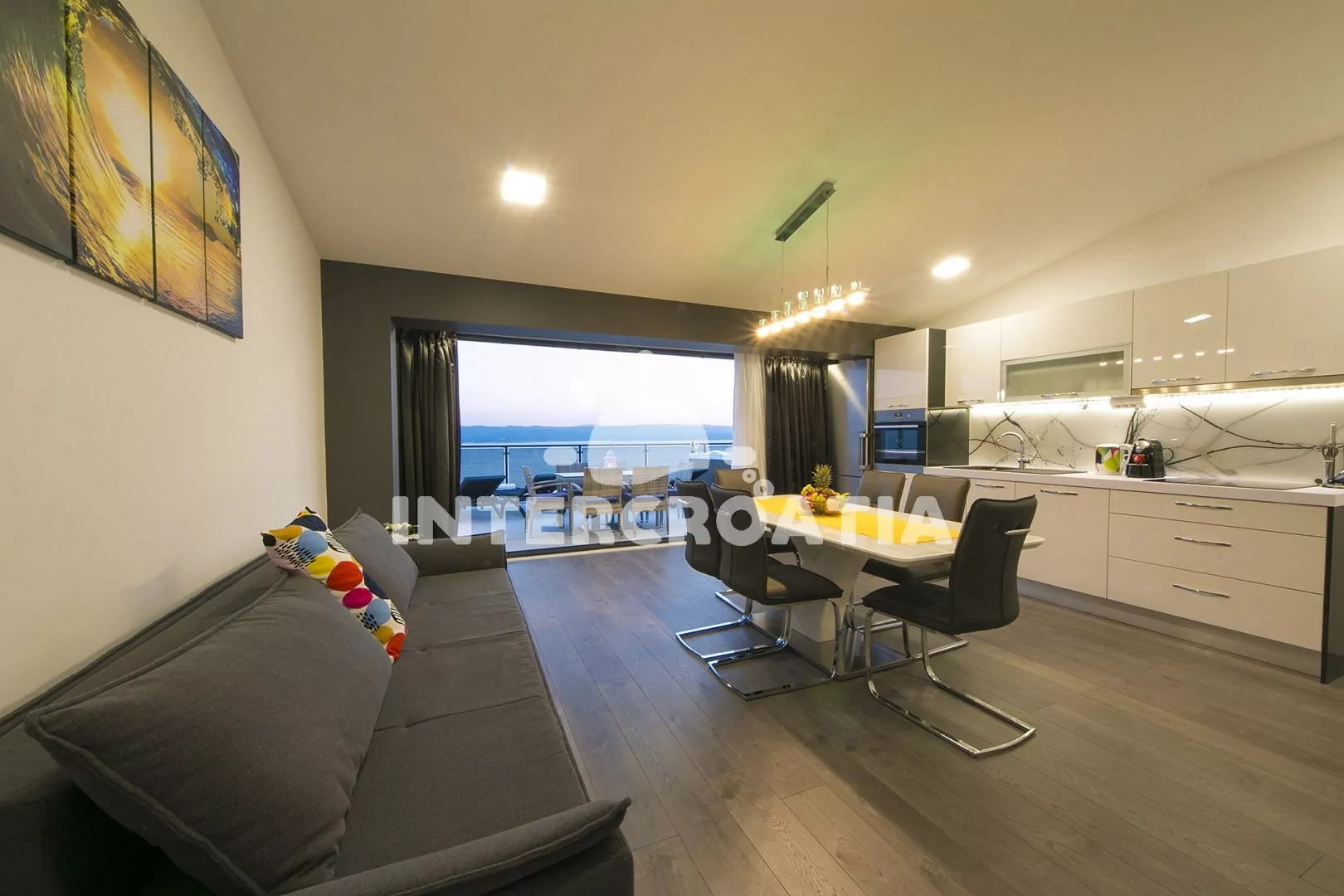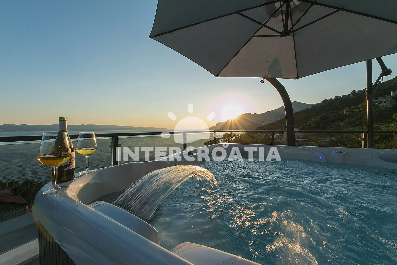 Luxusní apartmán (90 m2) s terasou, vířivkou, posezením a výhledem na moře se nachází ve 2. patře domu. Apartmán má 2 ložnice a je vhodný pro 4 až 5 osob. Obývací pokoj je spojený s kuchyní.…