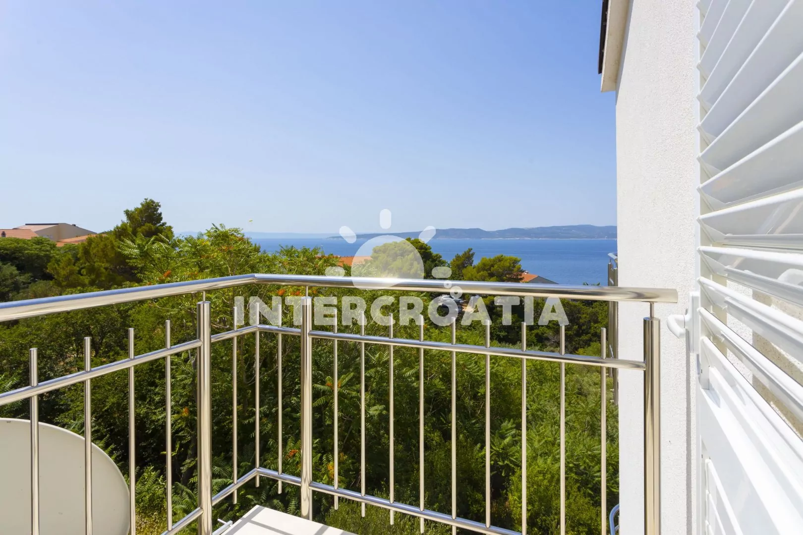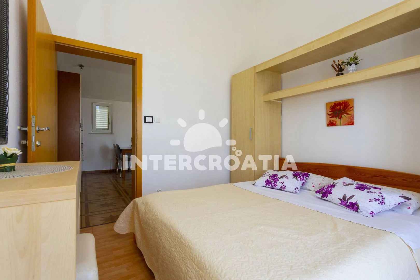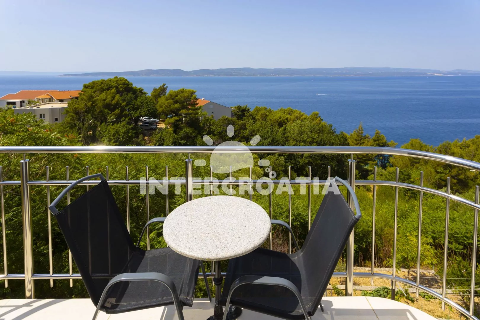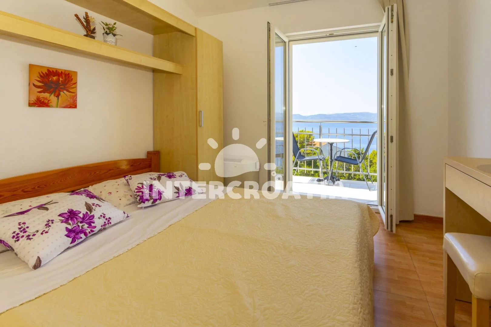 Apartmán (45 m2) s balkonem, posezením a výhledem na moře se nachází ve 2. patře domu. Apartmán má 1 ložnici a je vhodný pro 2 až 3 osoby. Obývací pokoj je spojený s kuchyní. Kuchyňská linka je vybavena varnou deskou, digestoří, myčkou na nádobí, rychlovarnou konvicí, kávovarem, toustovačem, nádobím a lednicí s mrazákem. Obývací pokoj s jídelním stolem, pohovkou (rozložitelná na extra lůžko pro 1 osobu) a televizí. Ložnice s dvoulůžkem, klimatizací a vstupem na balkon. Koupelna se sprchovým koutem, umyvadlem, fénem a wc. Hostům je k dispozici parkování u objektu zdarma.