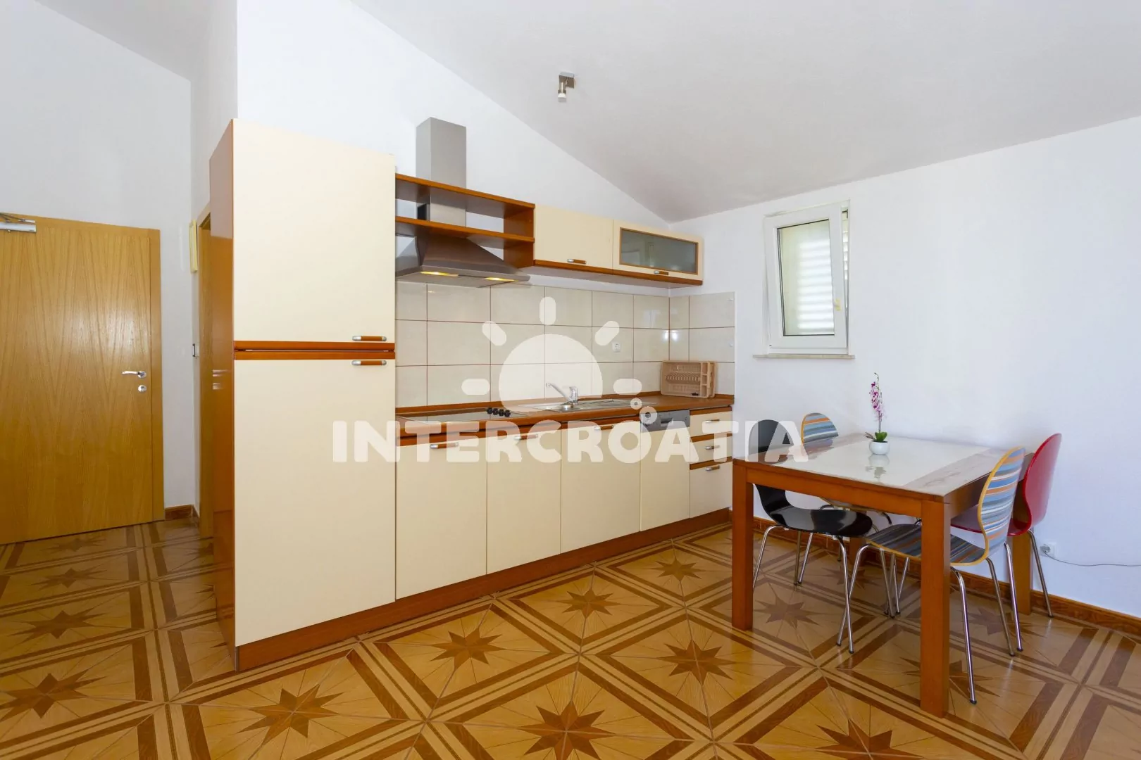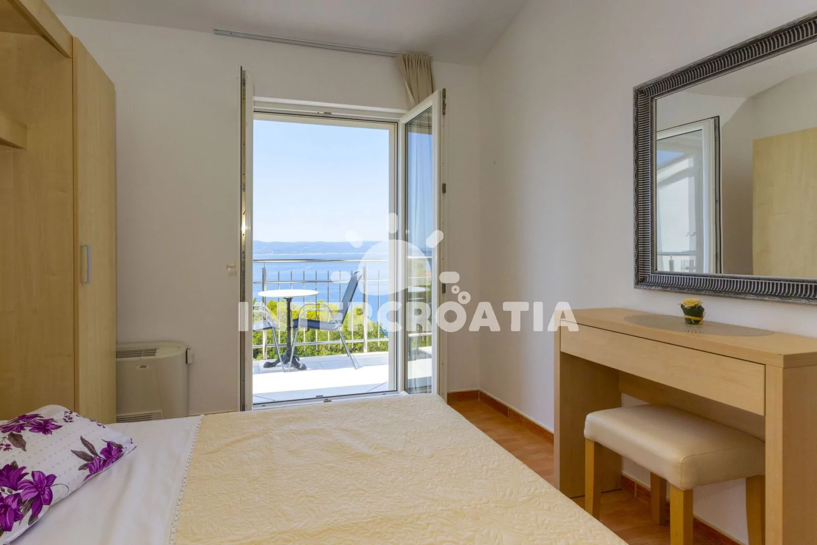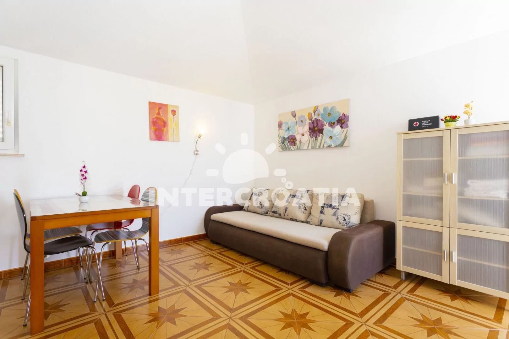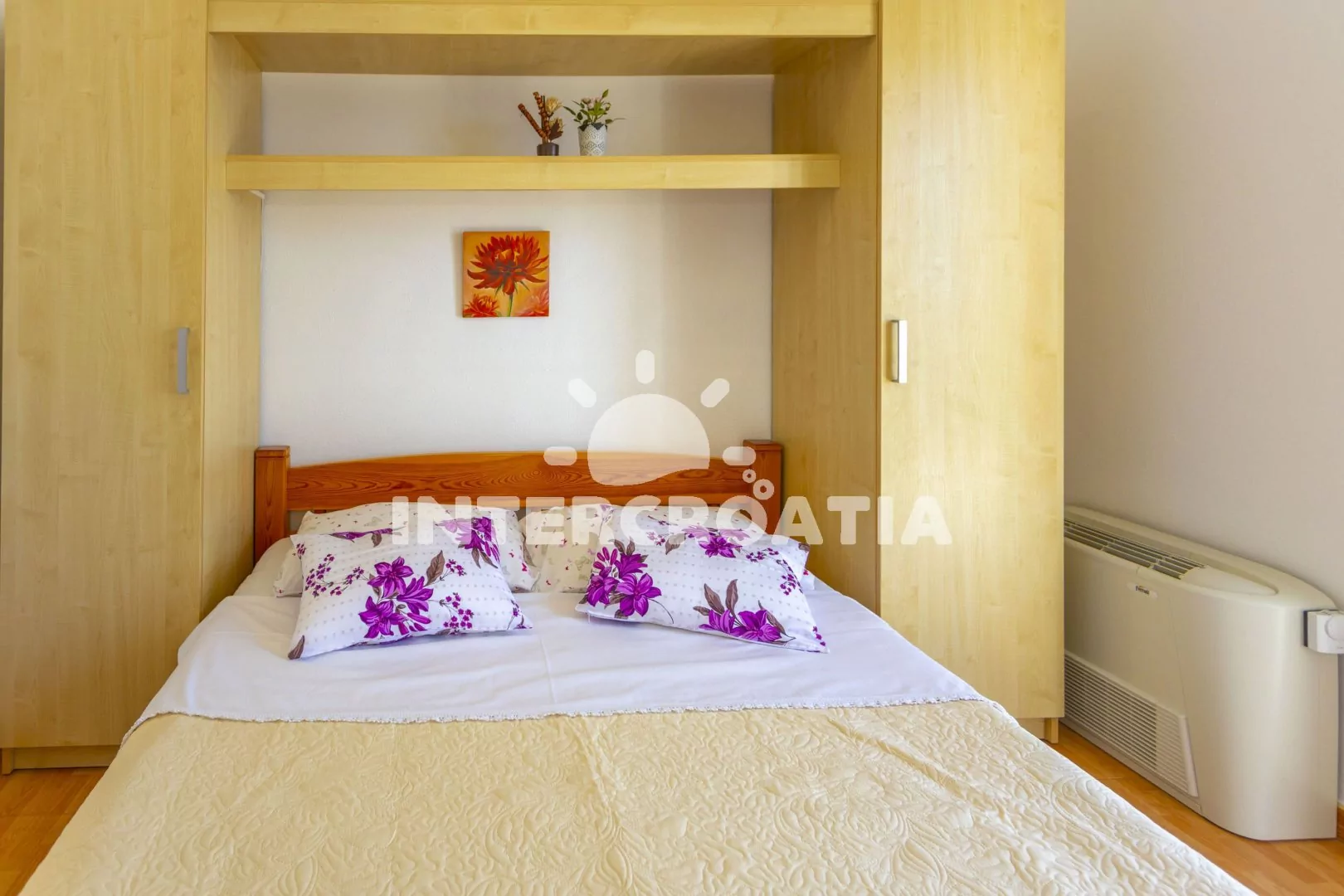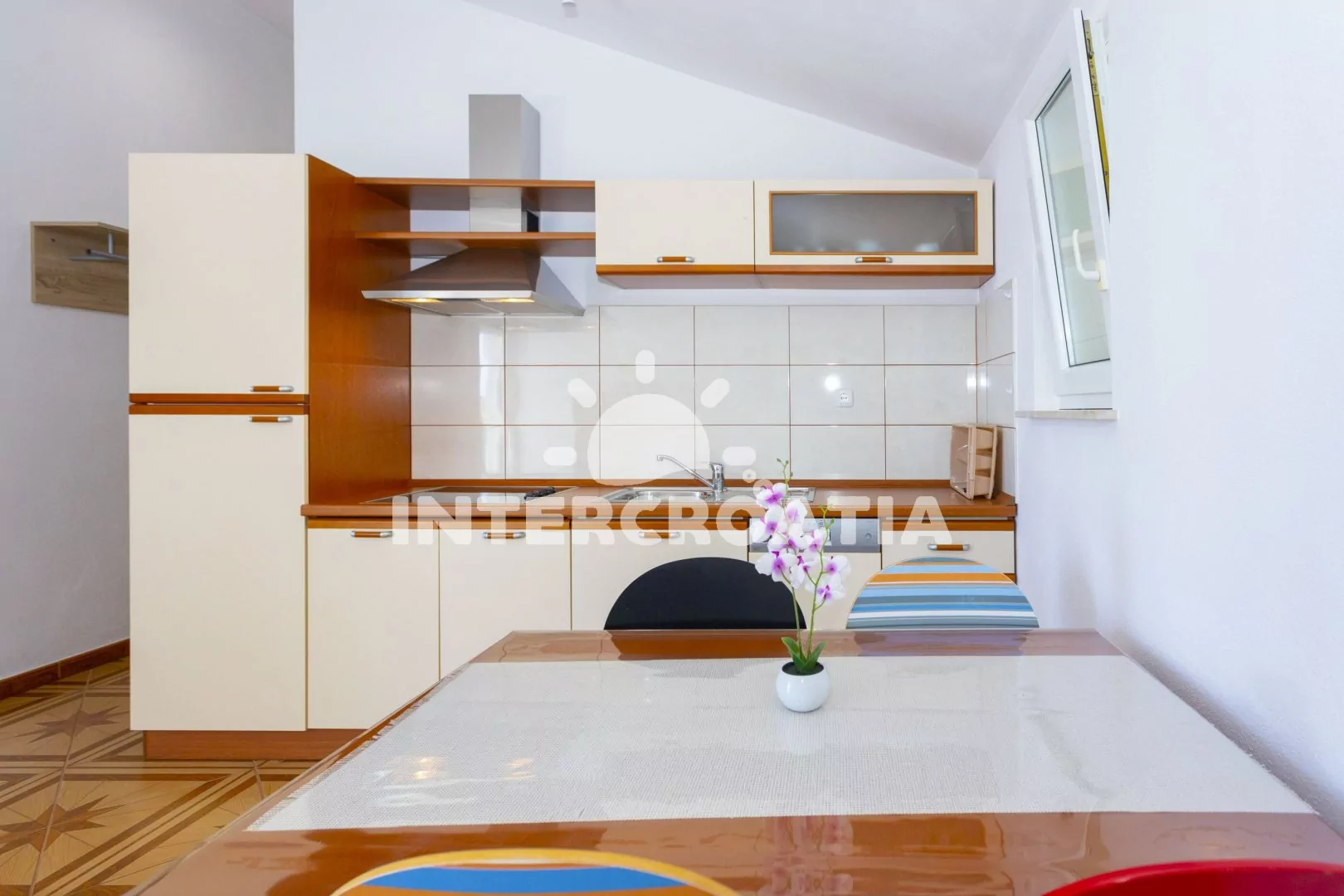 Apartmán (45 m2) s balkonem, posezením a výhledem na moře se nachází ve 2. patře domu. Apartmán má 1 ložnici a je vhodný pro 2 až 3 osoby. Obývací pokoj je spojený s kuchyní. Kuchyňská linka je vybavena varnou deskou, digestoří, myčkou na nádobí, rychlovarnou konvicí, kávovarem, toustovačem, nádobím a lednicí s mrazákem. Obývací pokoj s jídelním stolem, pohovkou (rozložitelná na extra lůžko pro 1 osobu) a televizí. Ložnice s dvoulůžkem, klimatizací a vstupem na balkon. Koupelna se sprchovým koutem, umyvadlem, fénem a wc. Hostům je k dispozici parkování u objektu zdarma.
