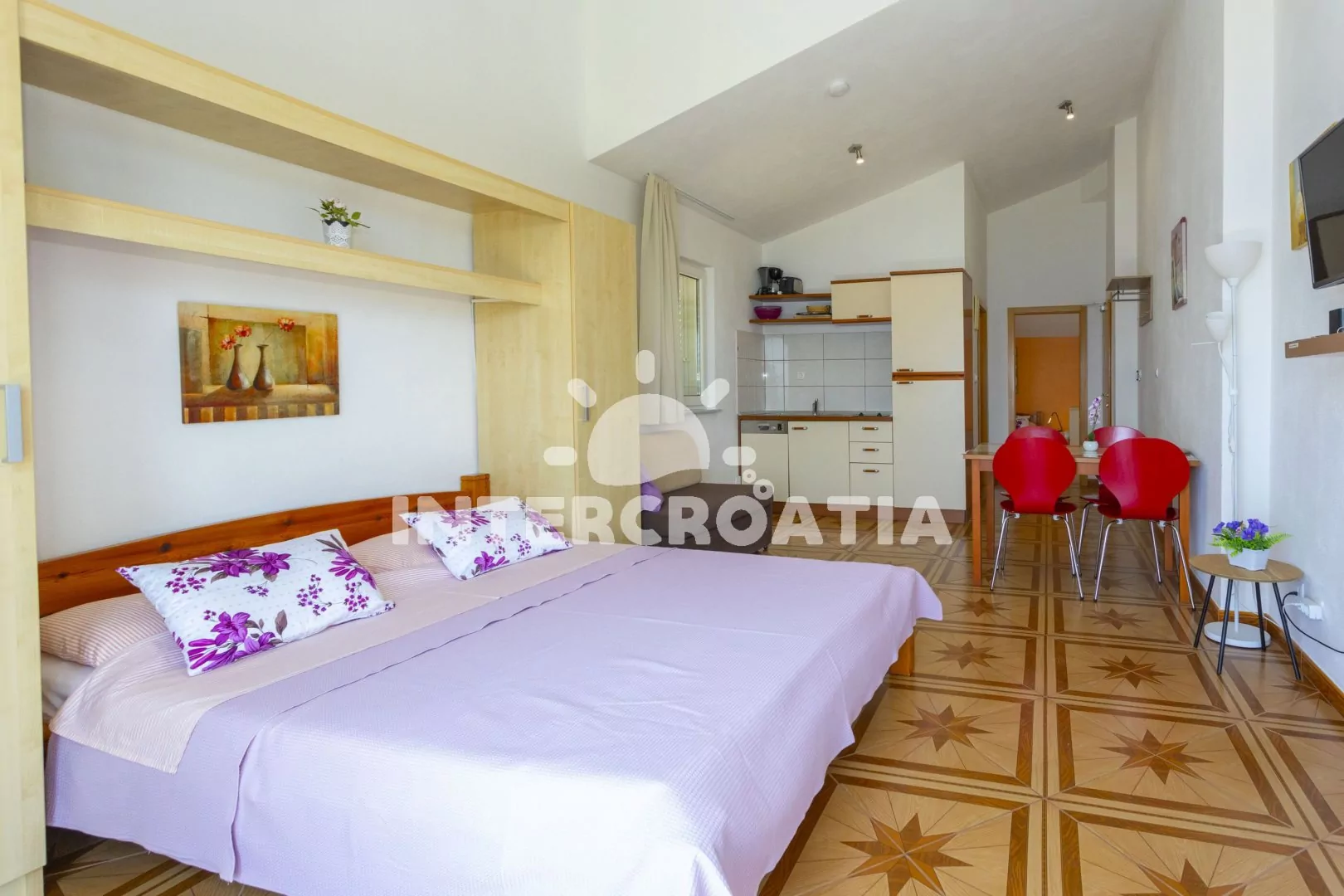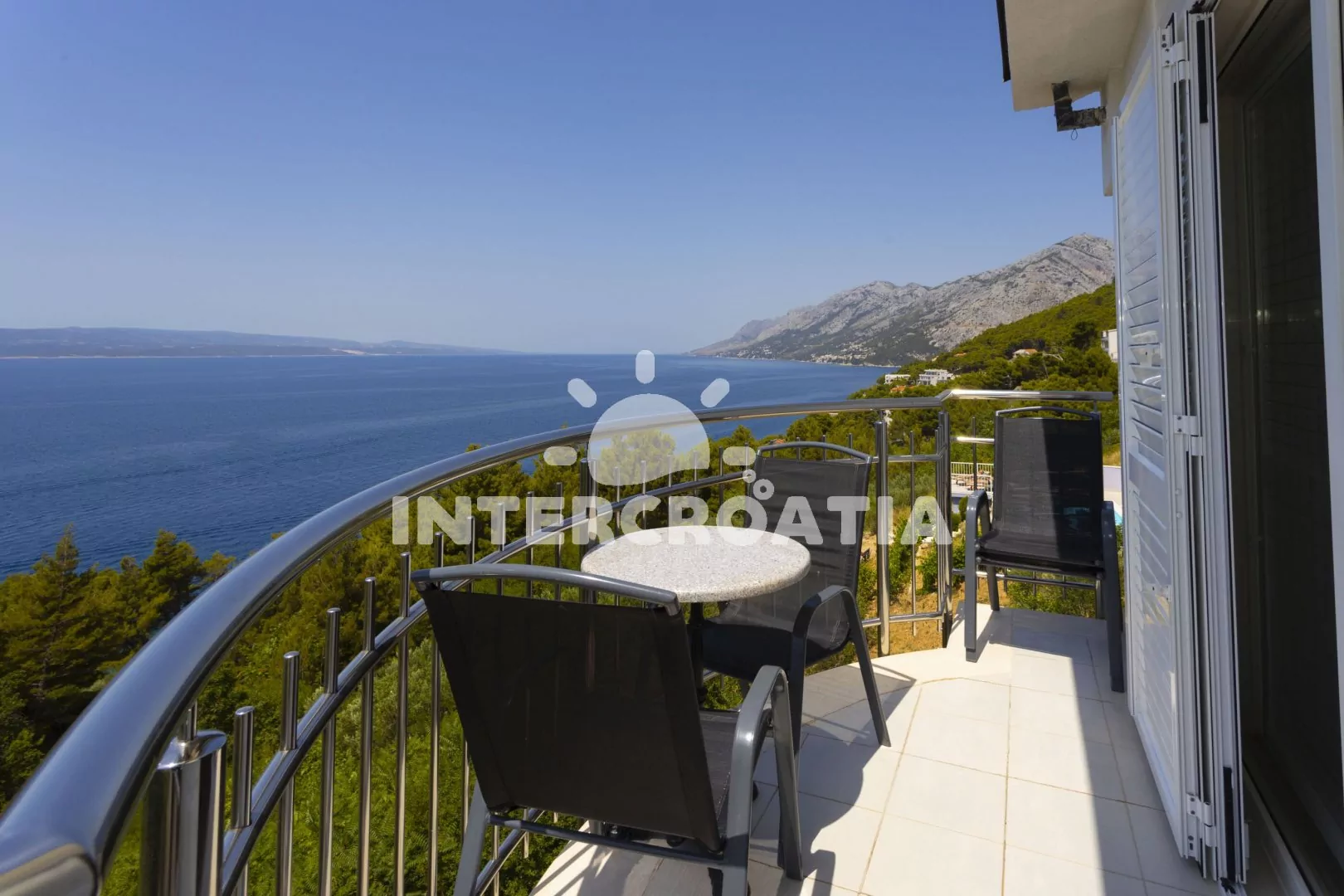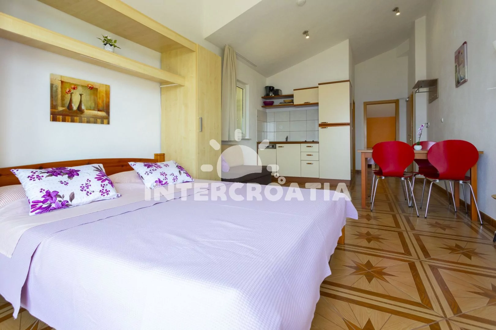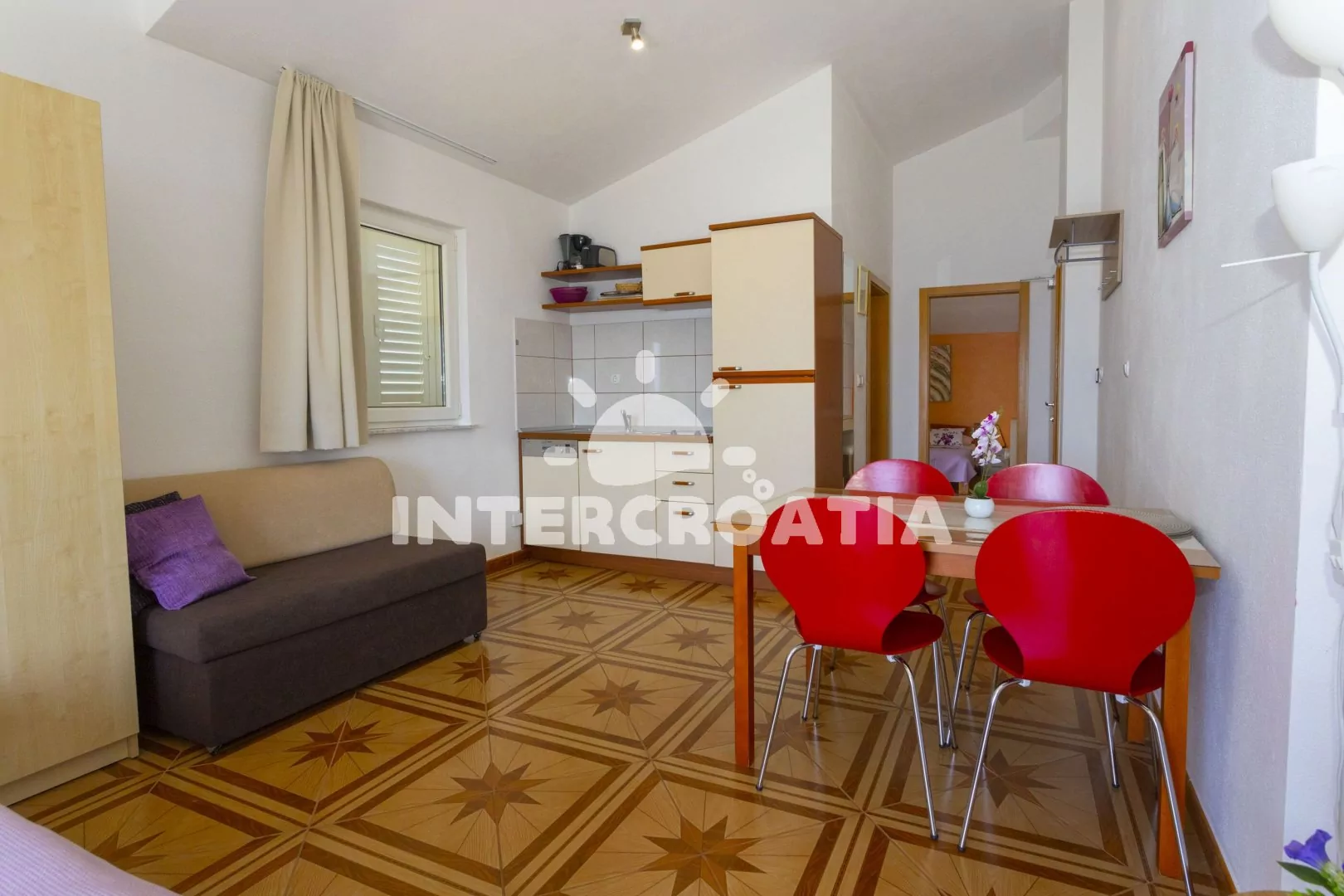 Apartmán (60 m2) s balkonem, posezením a výhledem na moře se nachází ve 2. patře domu. Apartmán má 1 ložnici a 4 lůžka. Obývací pokoj je spojený s kuchyní. Kuchyňská linka je vybavena dvouplotýnkovým vařičem, myčkou na nádobí, rychlovarnou konvicí, kávovarem, toustovačem, nádobím a lednicí s mrazákem. Obývací pokoj s jídelním stolem, pohovkou, dvoulůžkem, televizí, klimatizací a vstupem na balkon. Ložnice s dvoulůžkem a sejfem. Koupelna se sprchovým koutem, umyvadlem, fénem a wc. Hostům je k dispozici parkování u objektu zdarma.