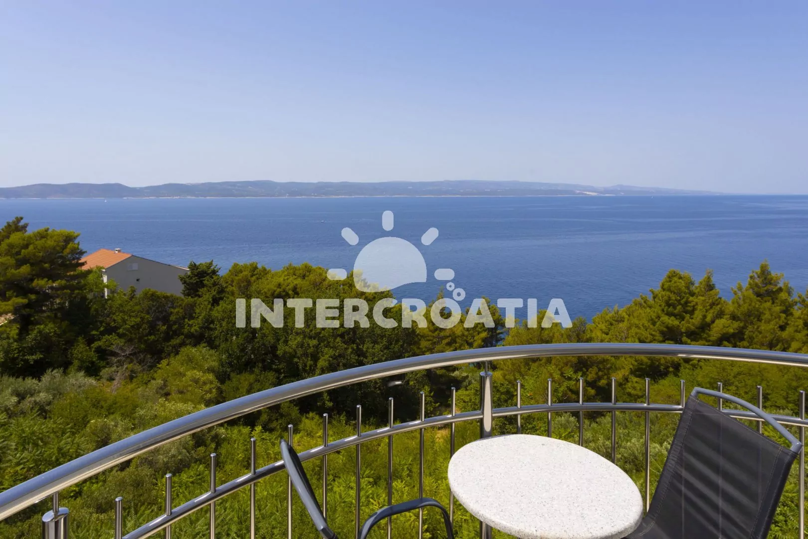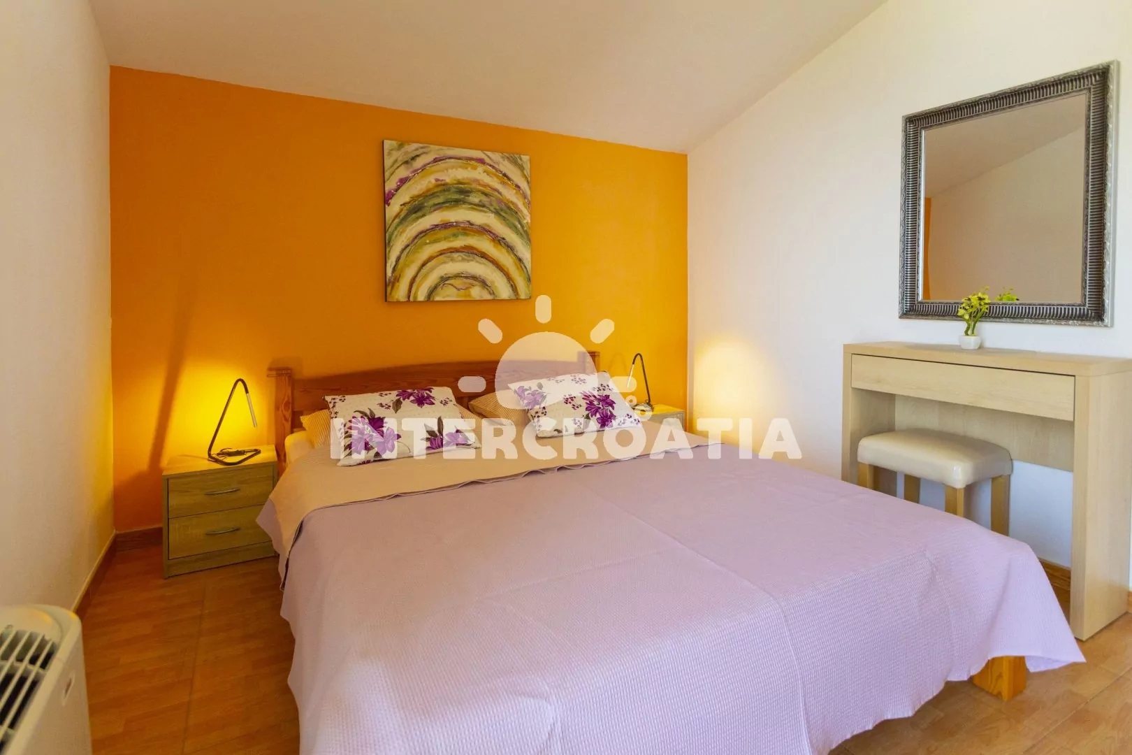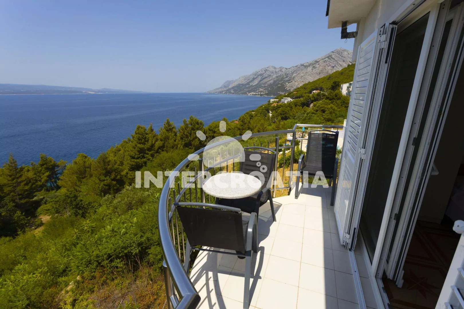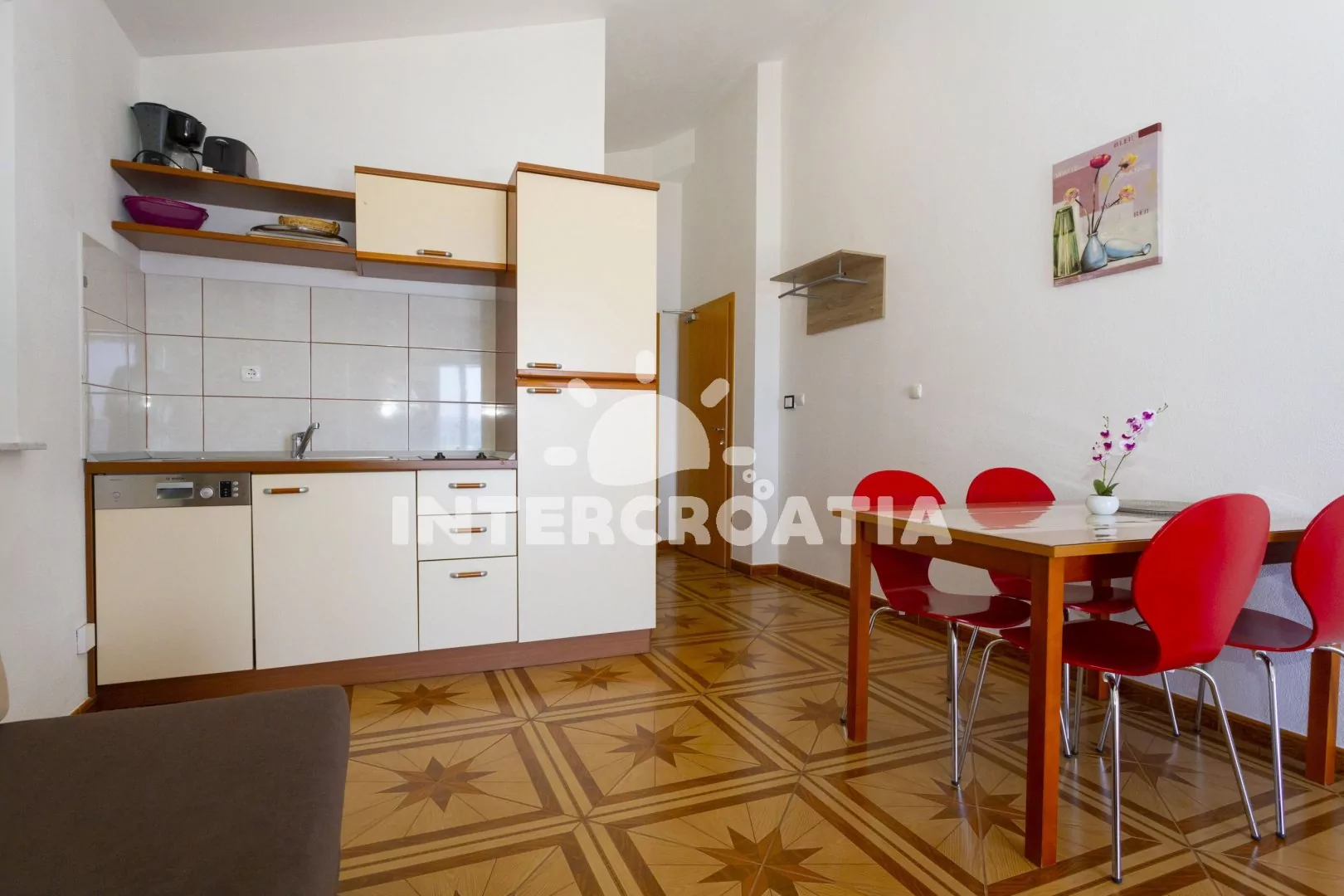 Apartmán (60 m2) s balkonem, posezením a výhledem na moře se nachází ve 2. patře domu. Apartmán má 1 ložnici a 4 lůžka. Obývací pokoj je spojený s kuchyní. Kuchyňská linka je vybavena dvouplotýnkovým vařičem, myčkou na nádobí, rychlovarnou konvicí, kávovarem, toustovačem, nádobím a lednicí s mrazákem. Obývací pokoj s jídelním stolem, pohovkou, dvoulůžkem, televizí, klimatizací a vstupem na balkon. Ložnice s dvoulůžkem a sejfem. Koupelna se sprchovým koutem, umyvadlem, fénem a wc. Hostům je k dispozici parkování u objektu zdarma.