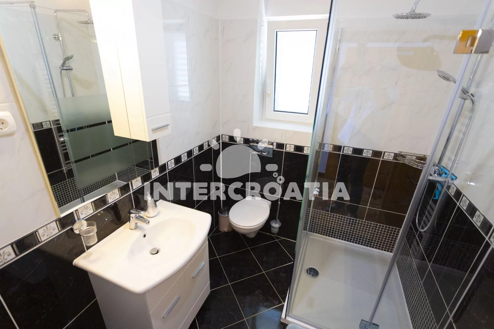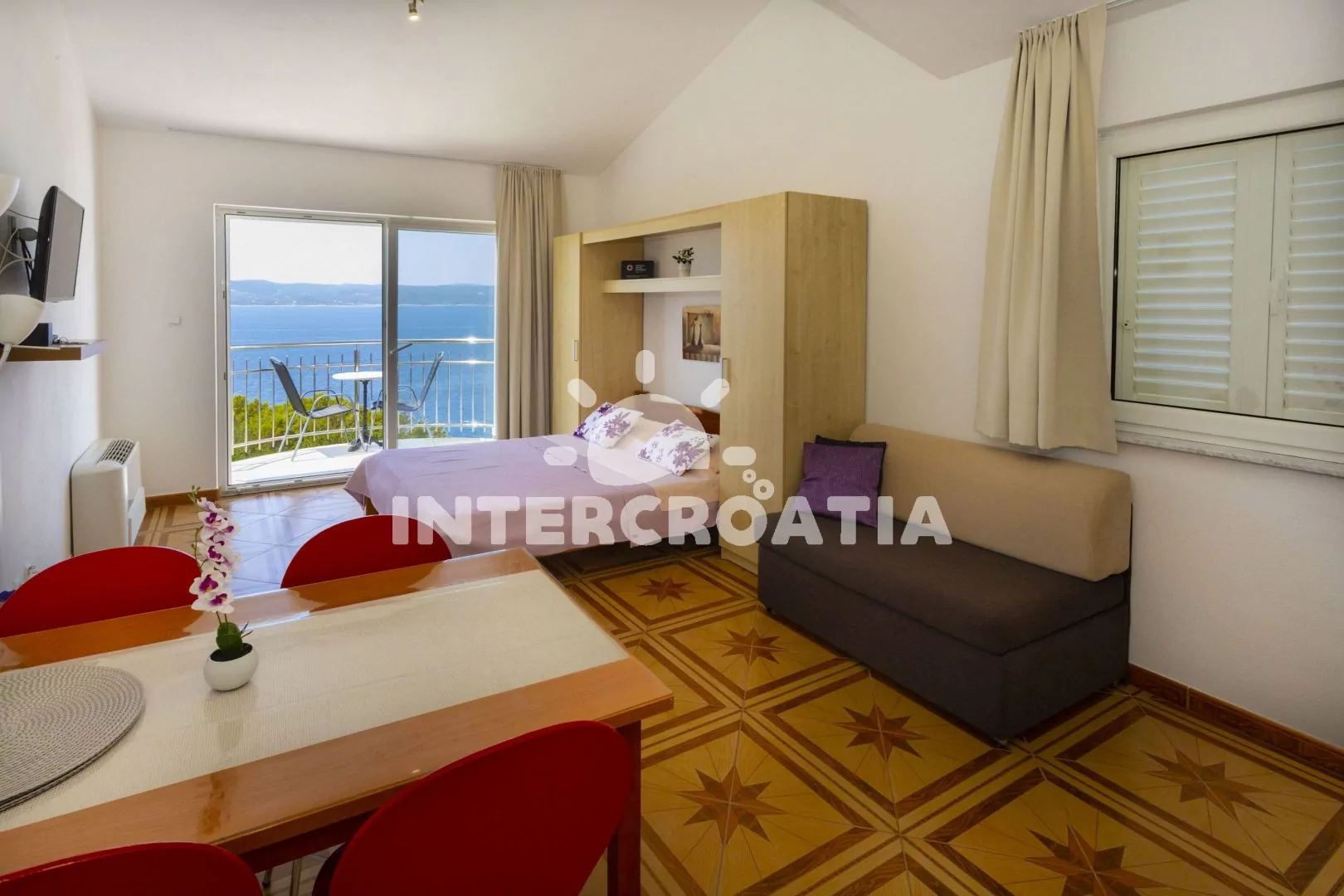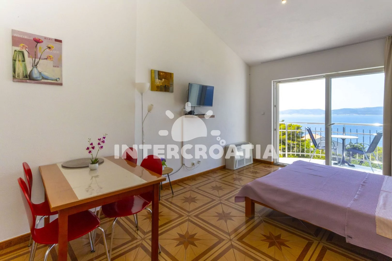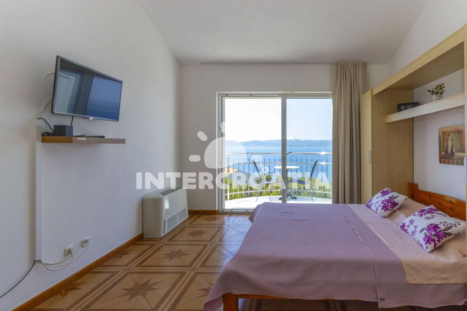 Apartmán (60 m2) s balkonem, posezením a výhledem na moře se nachází ve 2. patře domu. Apartmán má 1 ložnici a 4 lůžka. Obývací pokoj je spojený s kuchyní. Kuchyňská linka je vybavena dvouplotýnkovým vařičem, myčkou na nádobí, rychlovarnou konvicí, kávovarem, toustovačem, nádobím a lednicí s mrazákem. Obývací pokoj s jídelním stolem, pohovkou, dvoulůžkem, televizí, klimatizací a vstupem na balkon. Ložnice s dvoulůžkem a sejfem. Koupelna se sprchovým koutem, umyvadlem, fénem a wc. Hostům je k dispozici parkování u objektu zdarma.