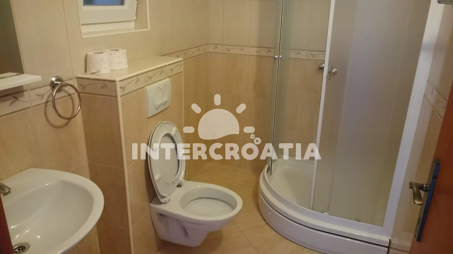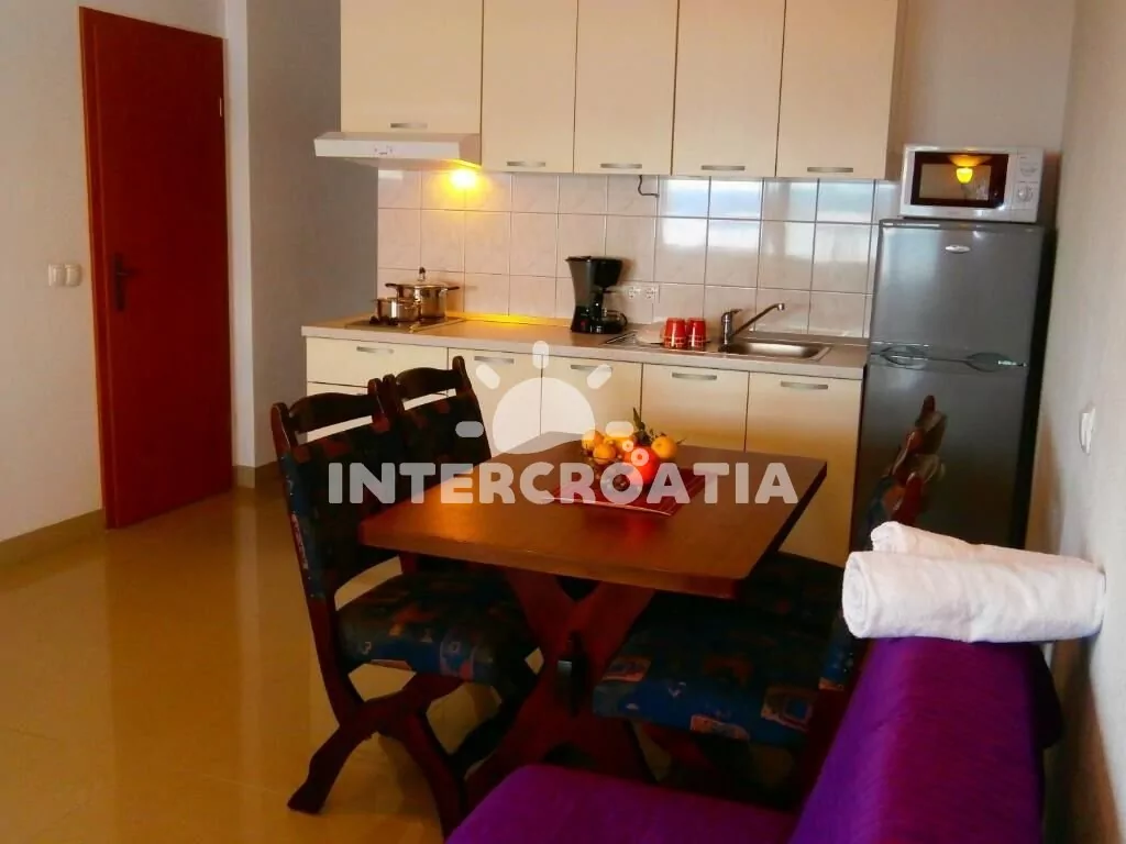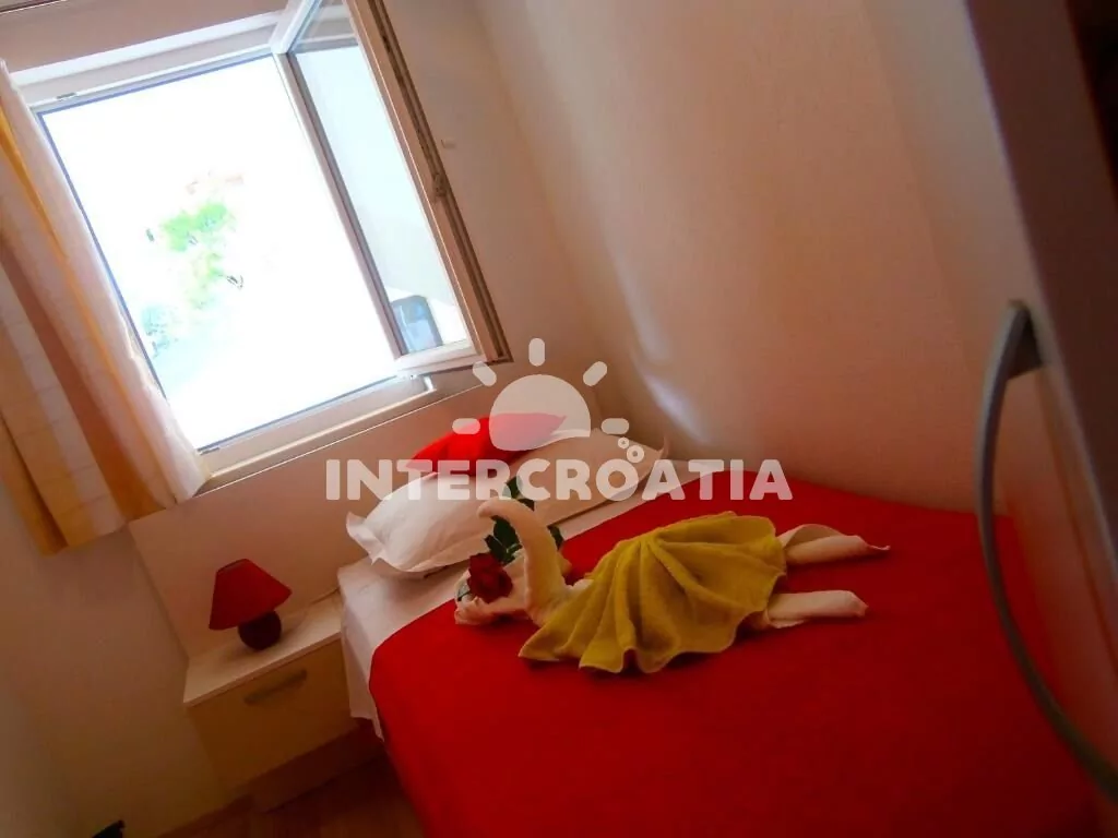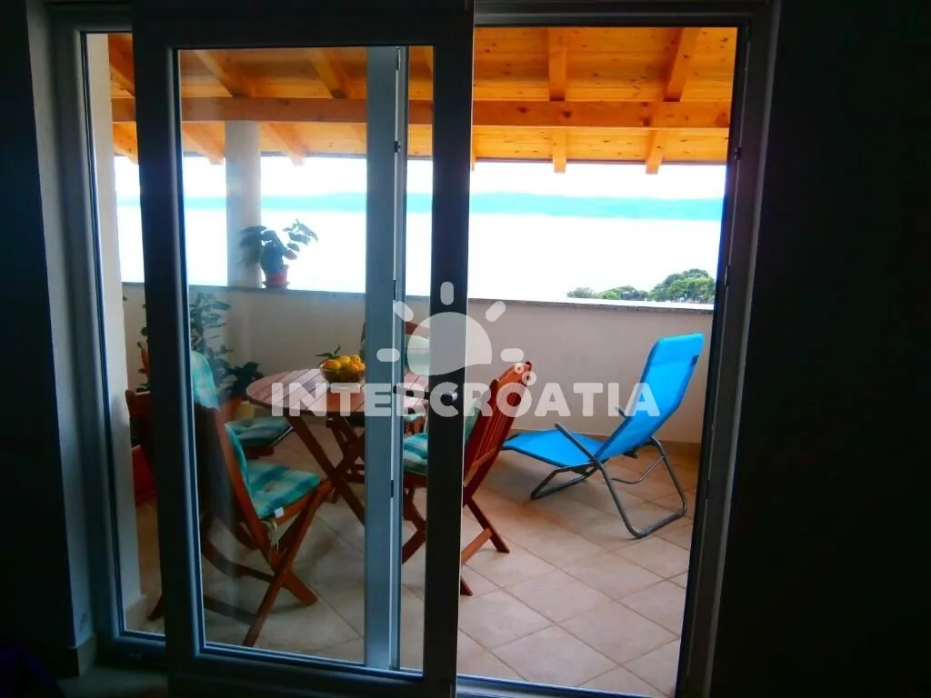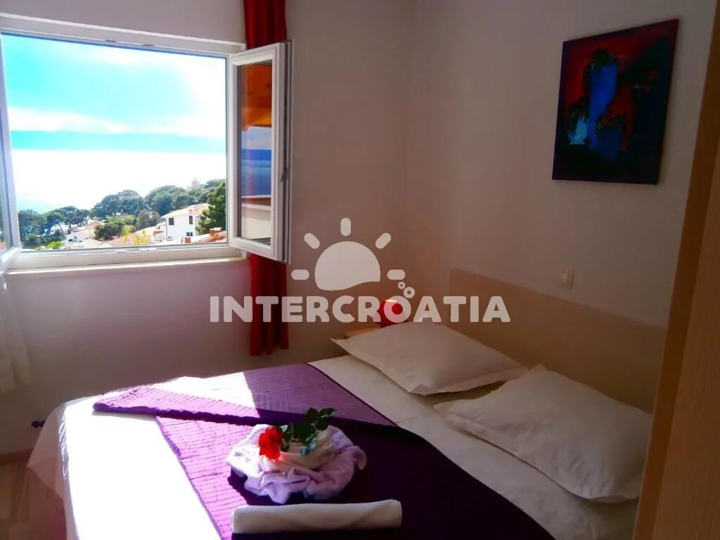 Apartmán (45 m2) s terasou, posezením a výhledem na moře se nachází v 1. patře domu. Apartmán má 2 ložnice a je vhodný pro 3 až 4 osoby. Obývací pokoj je spojený s kuchyní. Kuchyňská linka je vybavena dvouplotýnkovým vařičem, digestoří, rychlovarnou konvicí, mikrovlnnou troubou, kávovarem, nádobím a lednicí s mrazákem. Obývací pokoj s jídelním stolem, pohovkou (rozložitelná na extra lůžko pro 1 osobu), televizí se satelitním programem, klimatizací a vstupem na terasu. První ložnice s dvoulůžkem a sejfem. Druhá ložnice s jedním jednolůžkem. Koupelna se sprchovým koutem, umyvadlem, fénem a wc. Hostům je k dispozici parkování u objektu zdarma.
